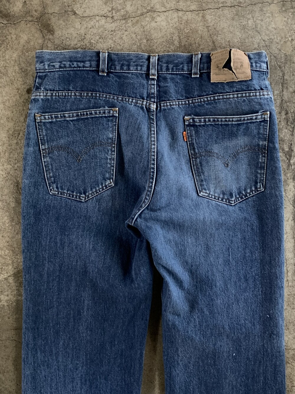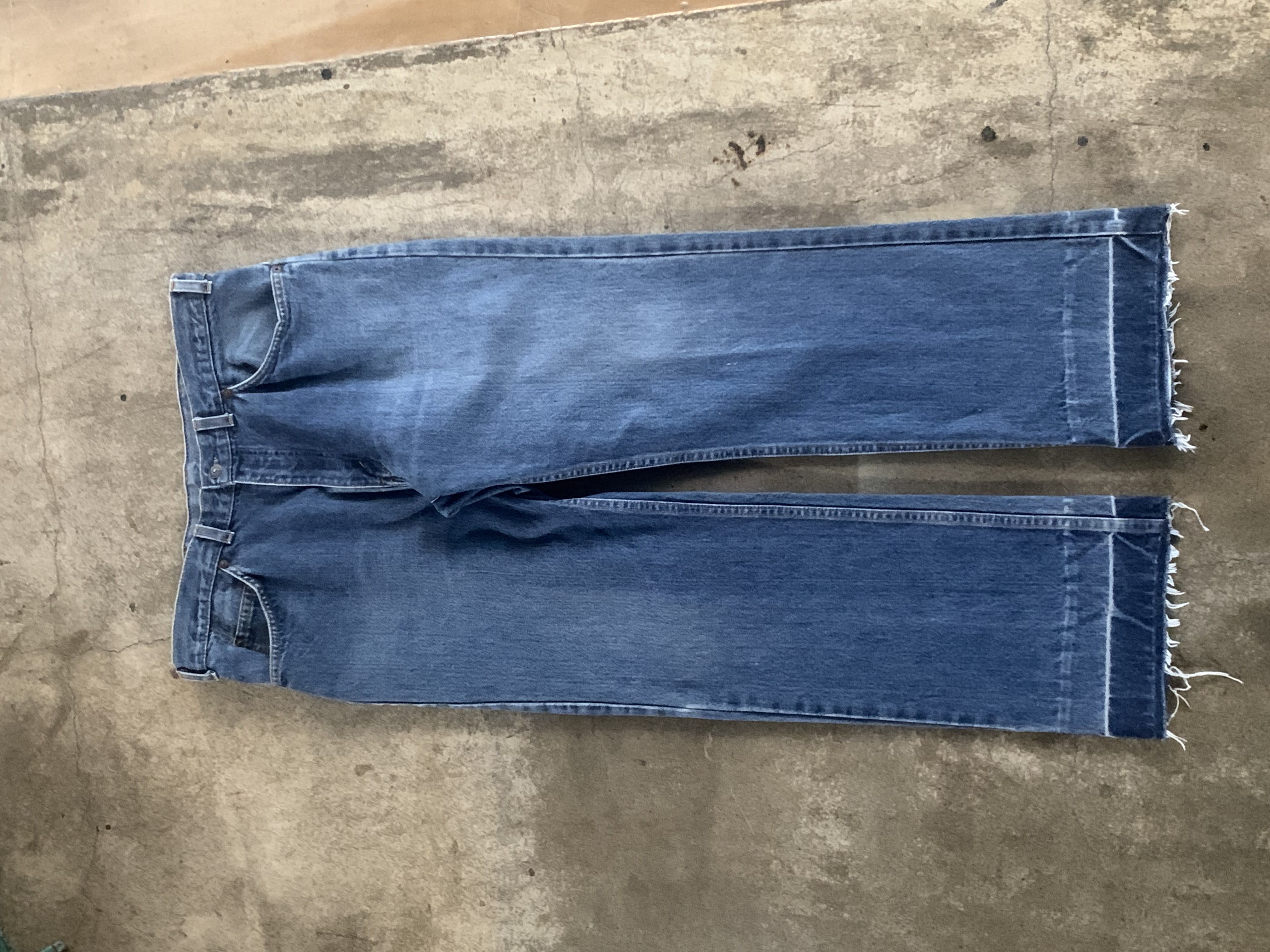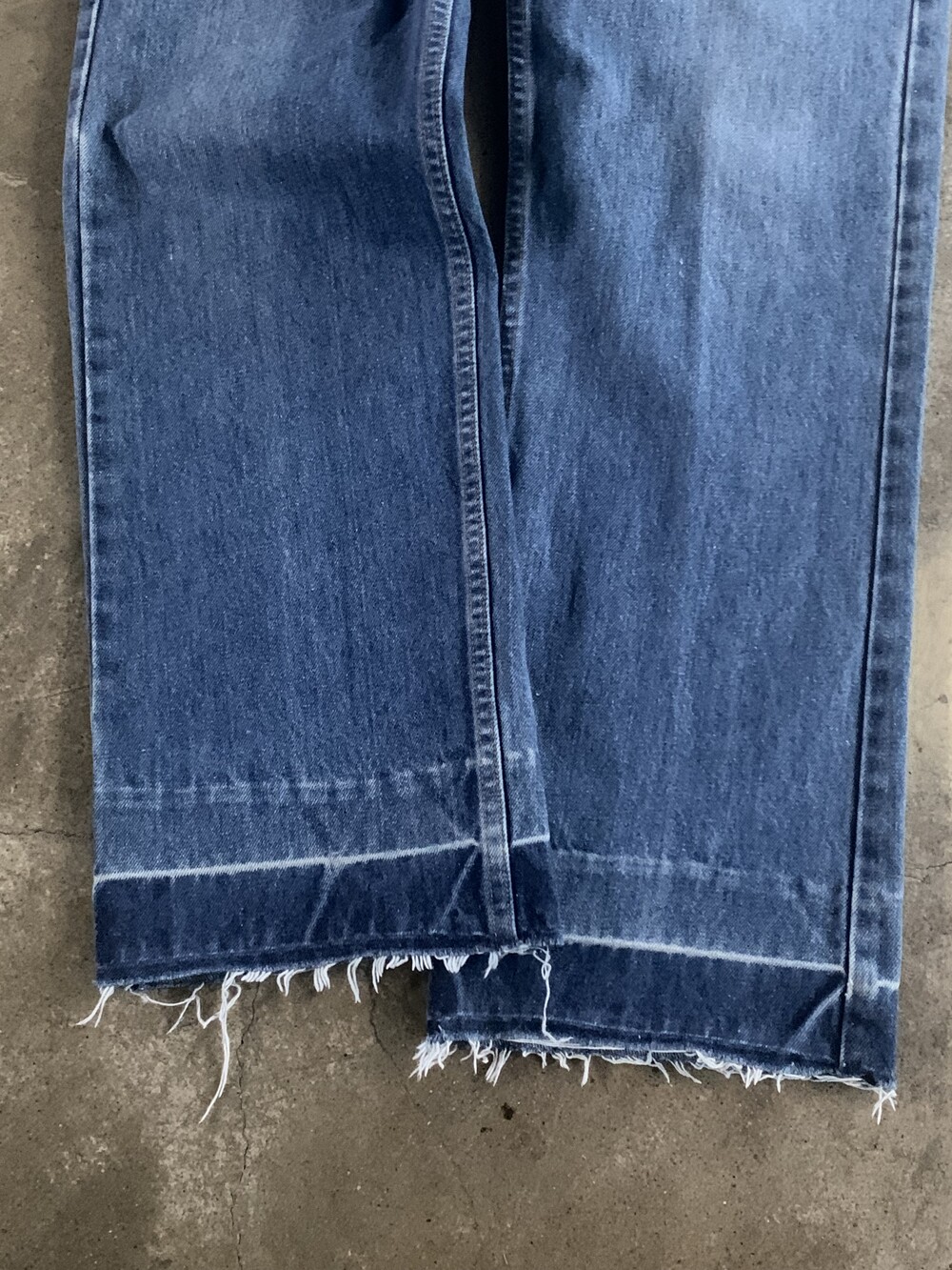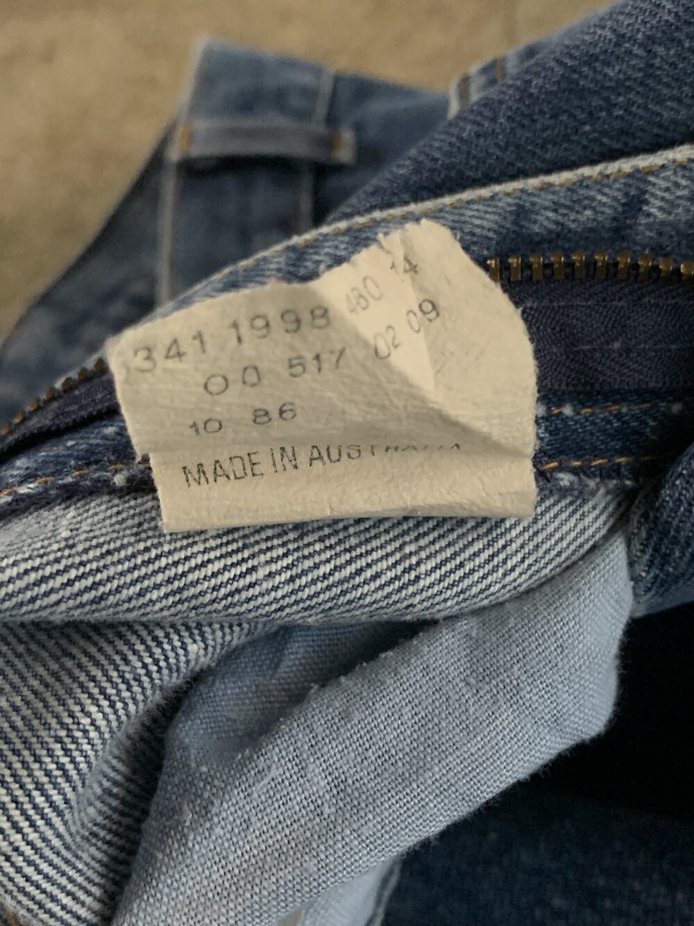 🚩Detail 애초에 오렌지탭 517이 무릎 너비와 밑단 너비 대비가 큰 편인 아닌데다 밑단을 잘라 기장을 줄인 수선을 거쳐 밑단에서 퍼지는듯한 부츠컷 특유의 실루엣이 보여지지 않을까 하고 걱정은 했지만, 밑단 너비 23cm로 부츠컷 마지노선에 턱걸이했다 싶은 정도의 1986년 10월 호주 생산 리바이스 517입니다. 미국제와 크게 다르지 않은 건조한 코튼 데님 원단에 페이딩이 자리잡는 단계의 사용감을 보이며 허리 단면 대비 기장이 그리 긴 편은 아닌지라 오버사이징하여 연출해도 좋을만한 제품입니다. 33인치 혹은 그보다 작게 착용하는 분들에게 권장드립니다.