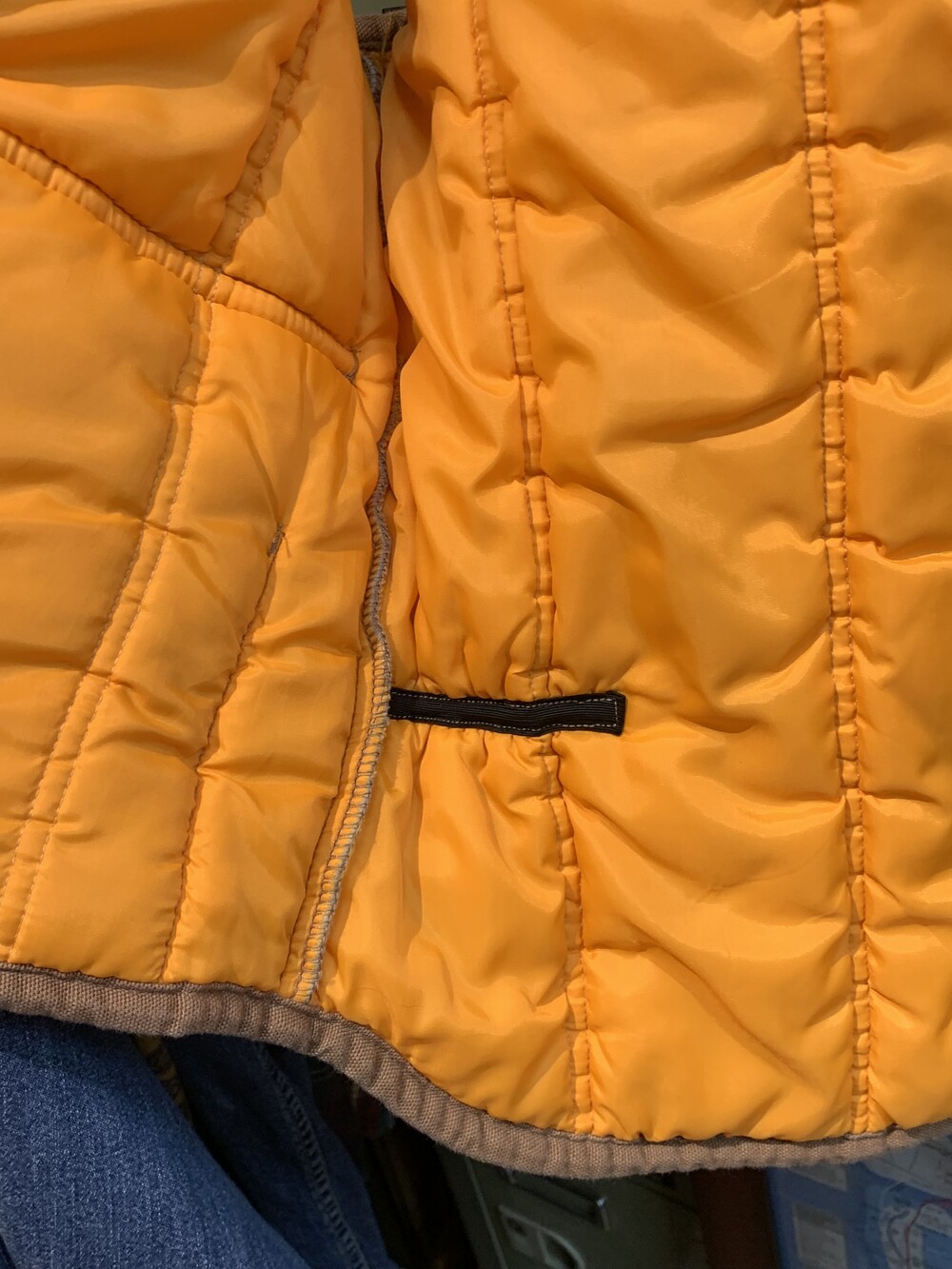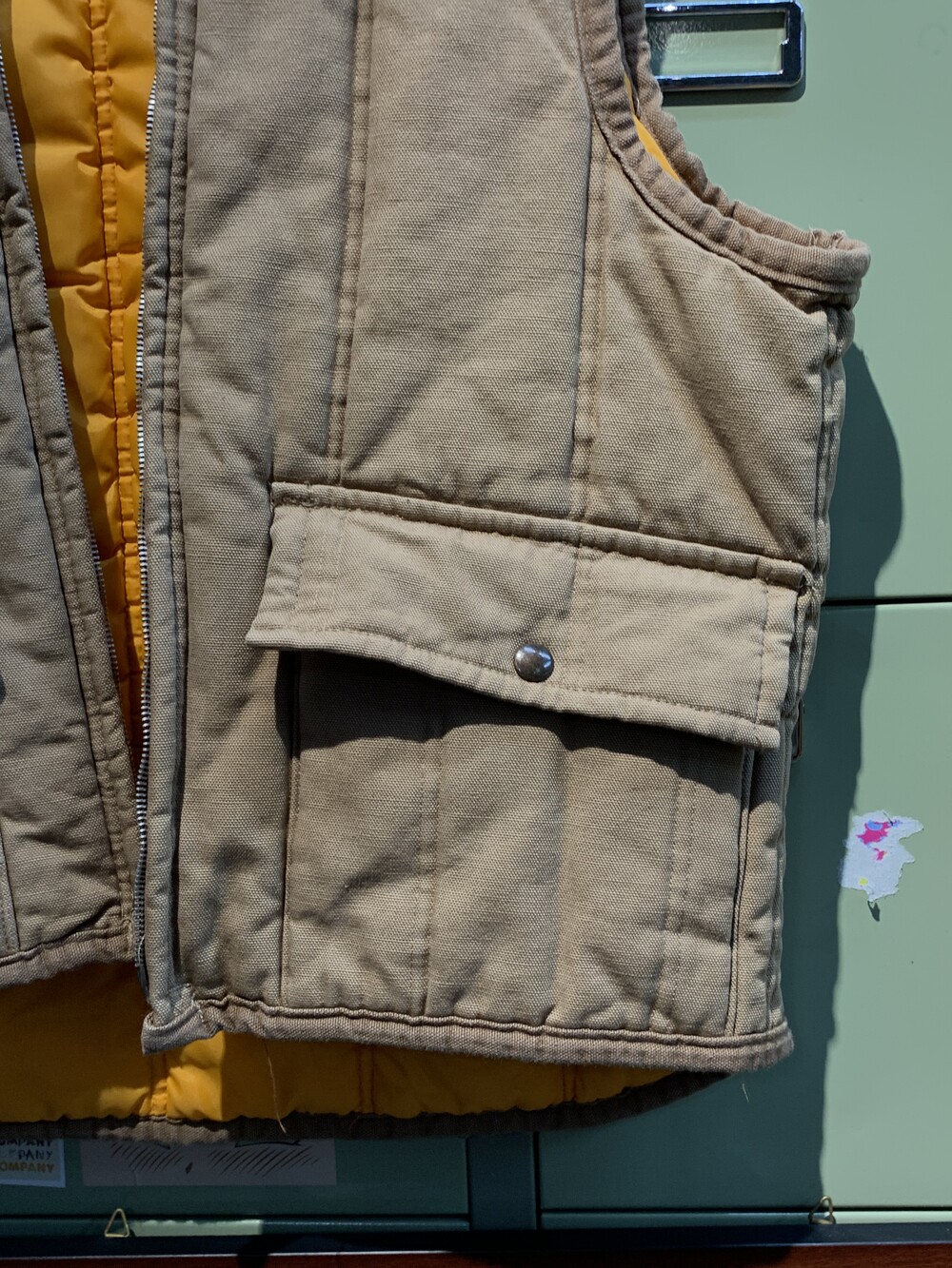🚩Detail 두껍지 않은 덕캔버스 원단 아웃쉘에 가벼운 폴리 충전재가 주입된, Walls 같은 미국발 아웃도어웨어에서 흔히 볼 수 있는 퀼티드 베스트. 전면 하단부 아웃포켓, 겉감 브라운 컬러와 대비되는 오렌지 컬러 안감, 투웨이 지퍼 등의 요소로 저스트 사이즈의 스웻이나 스웻후디 혹은 니트 풀오버 위에 매치하기 좋을만한 제품입니다. 암홀이 그리 넓은 유형은 아닌지라 100호 전후로 착용하는 분들에게 권장드립니다.