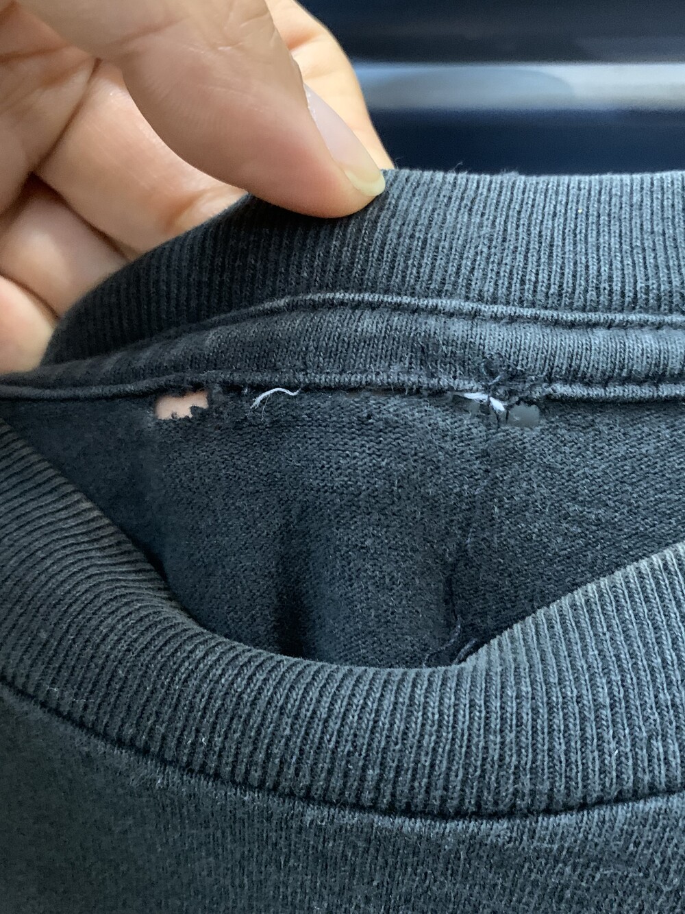 뒷면 넥라인 립 이음매에 헤진 데미지가 있으며 후면부 소매에 흰 얼룩이 있는, 사용감 있는 제품.