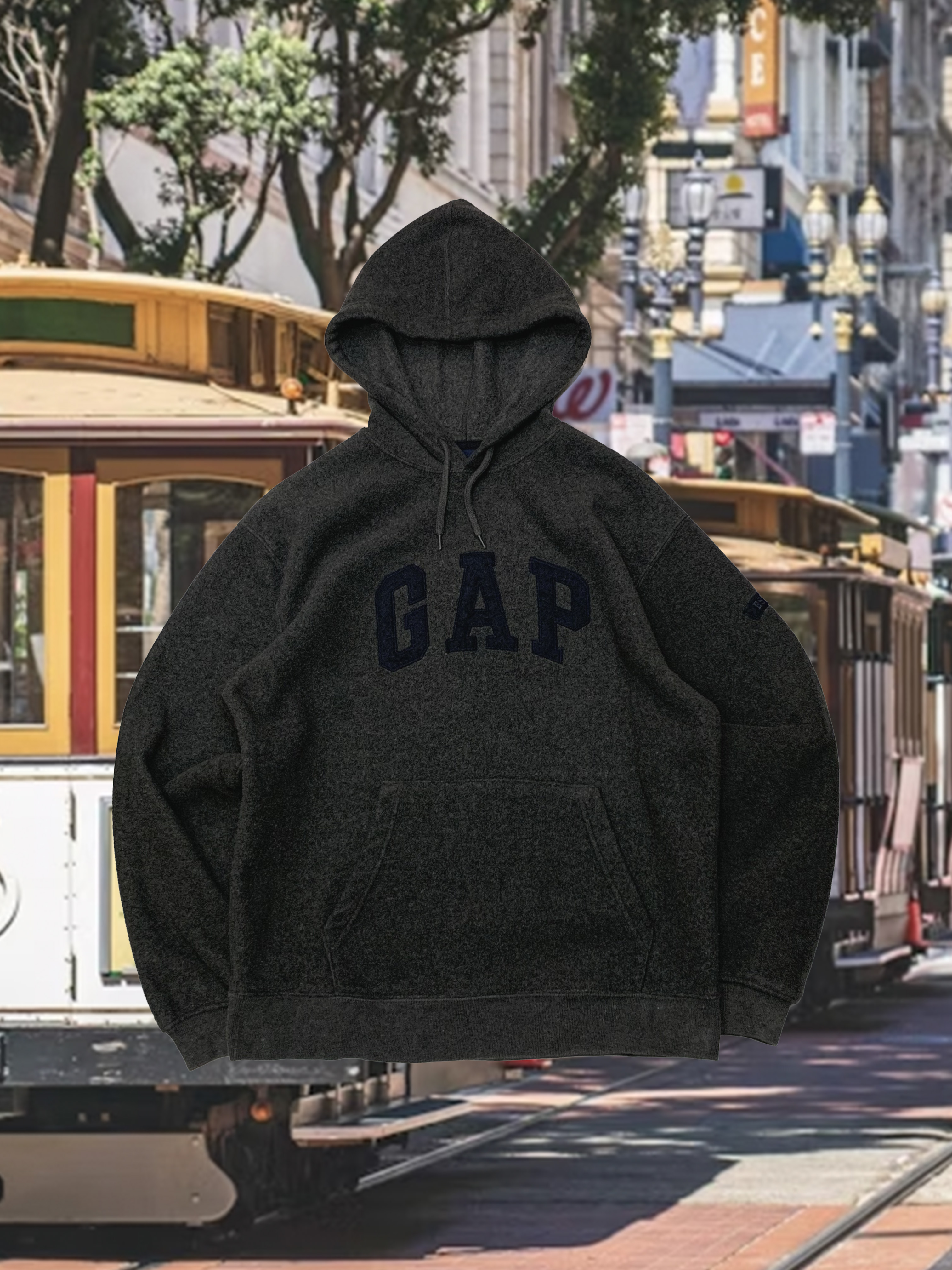 폴리/레이온 혼방 원단으로 너무 두껍지 않게 착용할 수 있을만한 올드 갭의 플리스 소재 풀오버 후디. 밑단이나 소매 립이 타이트하지는 않을 뿐더러 소재 특성상 적당히 오버사이징하여 루즈하게 착용하는 게 보다 어울리만한 제품입니다.