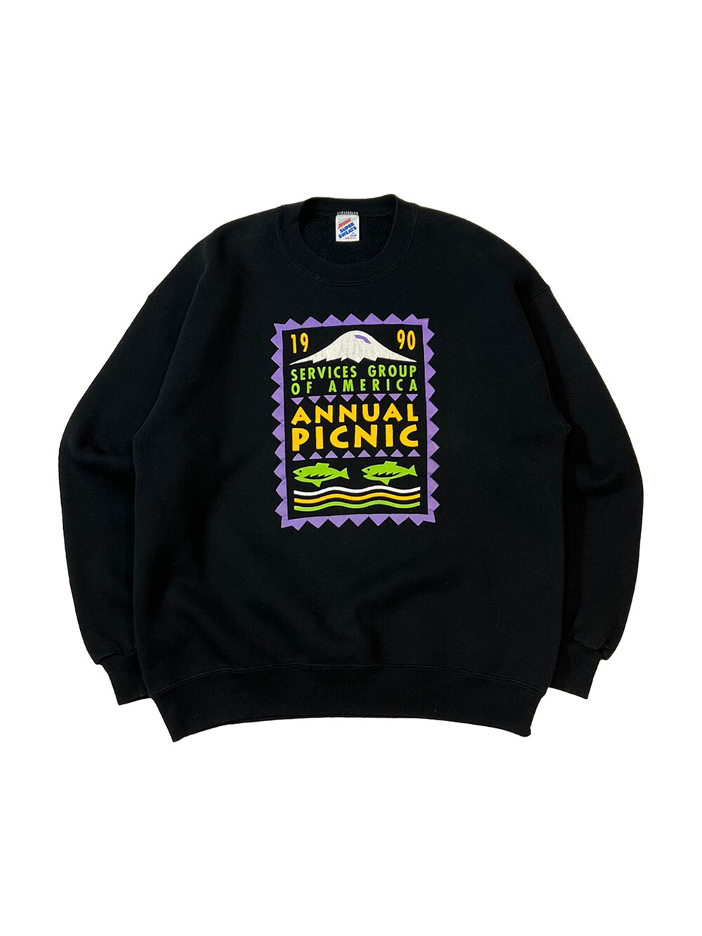 🚩Detail 몸판과 밑단 립 측면에 봉제선이 없는 모양새가 원통형 관 모양과 같다고 하여 튜블러(Tubular) 수식어가 붙습니다. 러셀 코프 산하 스포츠웨어 브랜드 저지스(JERZEES) 의 튜블러 타입 스웻셔츠입니다. 대규모 식품 유통회사 SERVICES GROUP OF AMERICA 에서 직원들을 대상으로 매년마다 주최하는 피크닉 프로모션 프린팅이 올려진 제품입니다.