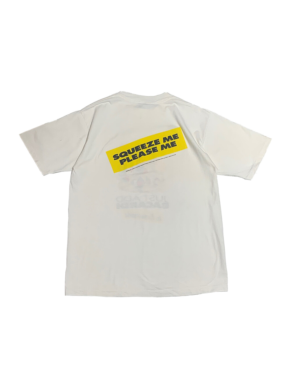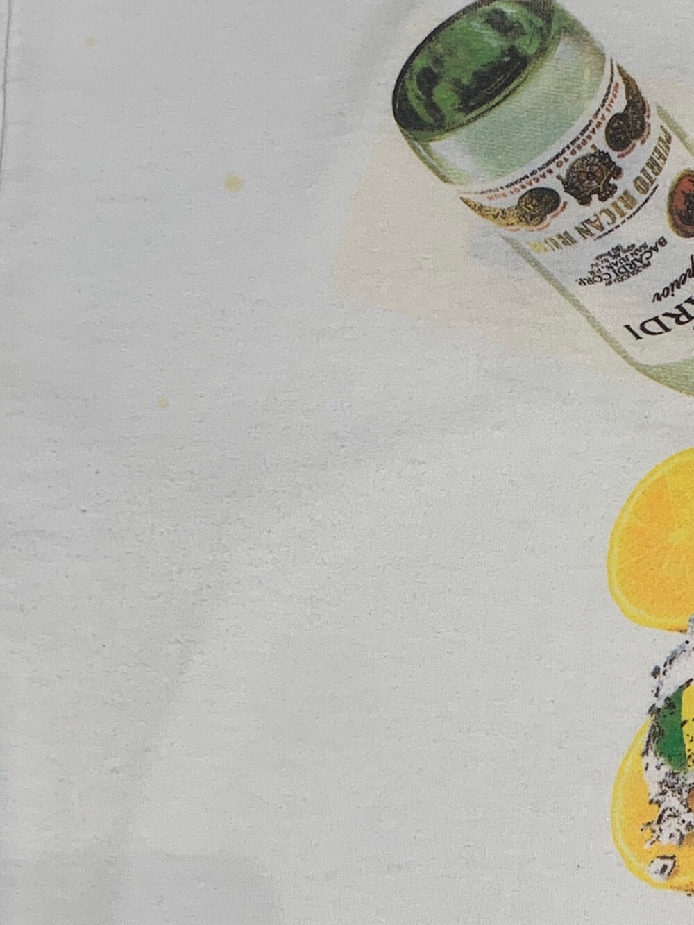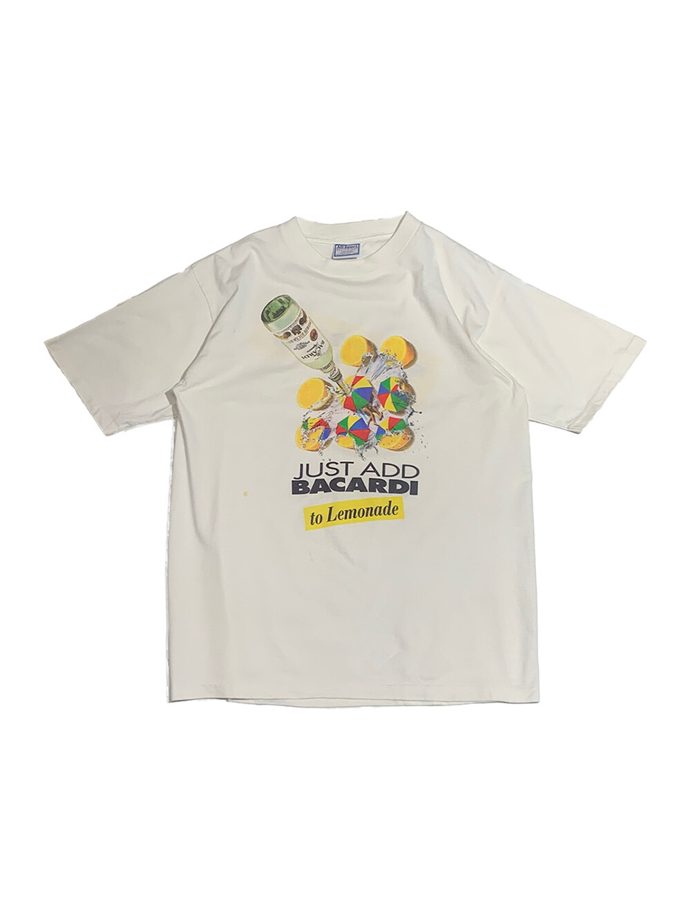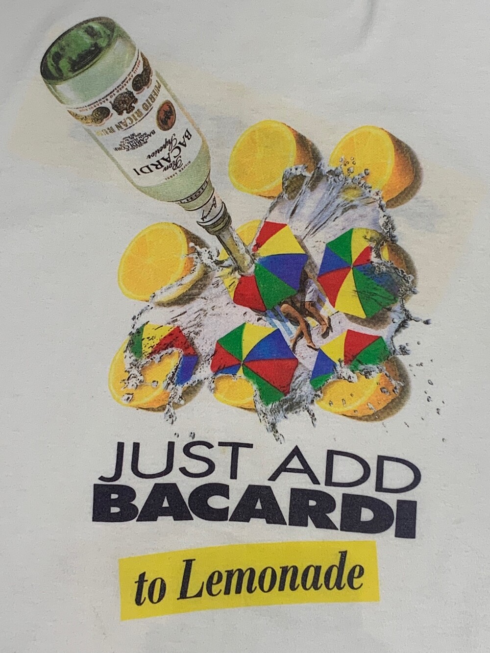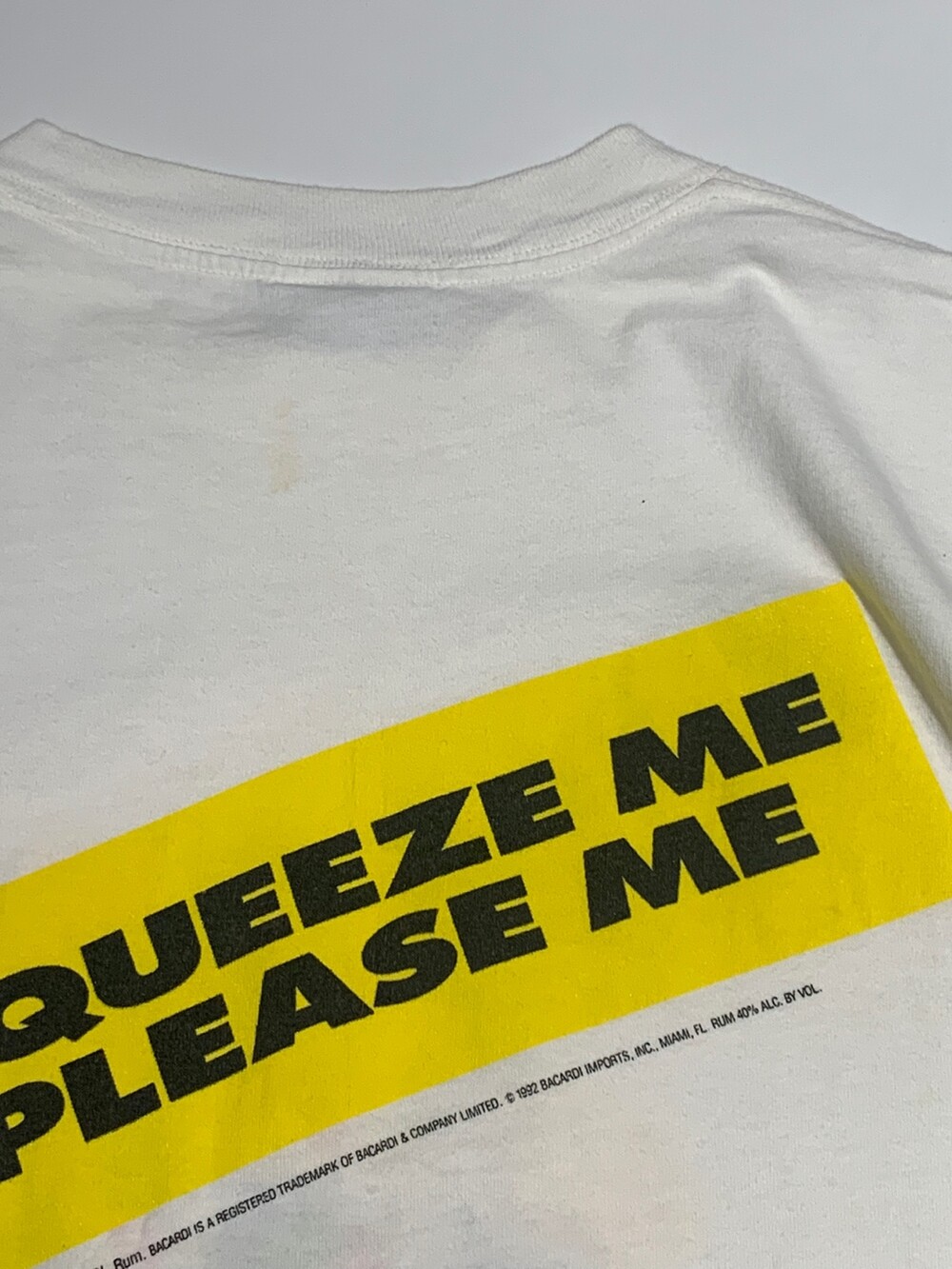 1990년대 포스터 커머셜 시리즈 JUST ADD BACARDI라는 슬로건과 함께 바카디를 붓는 자리에 다른 그림체가 섞이는 내용의 프로모션 티셔츠. 그 중에서도 초창기 버전에 해당하는 레모네이드 프린팅으로, 후면에는 포스터 내용에 걸맞는 적절한 문구가 배치되어 레몬을 겨냥한 내용인 SQUEEZE ME, PLEASE ME 라는 문구가 프린팅되어 있습니다.