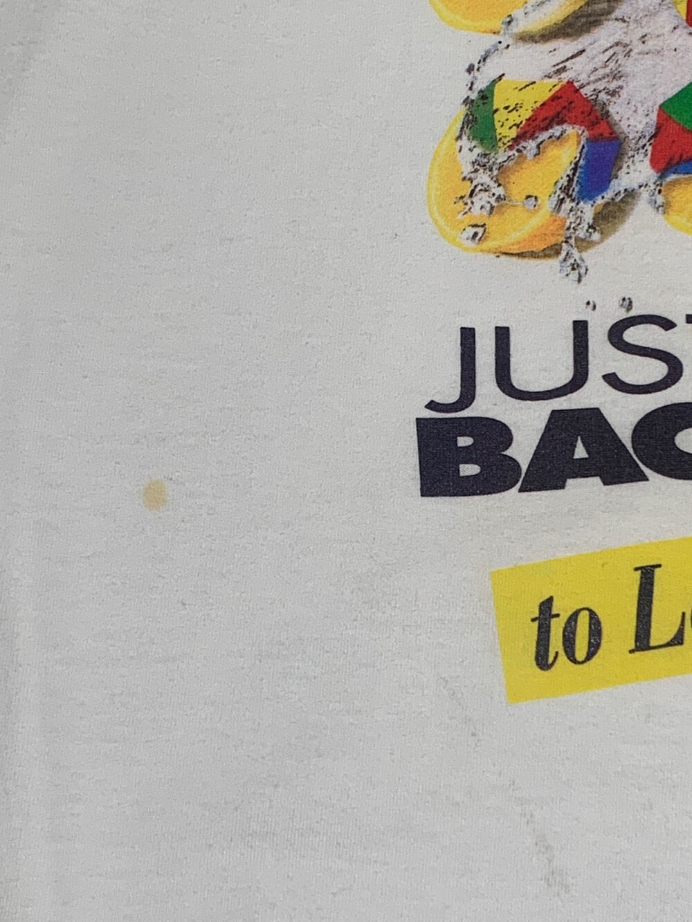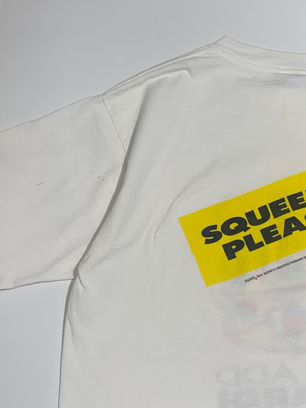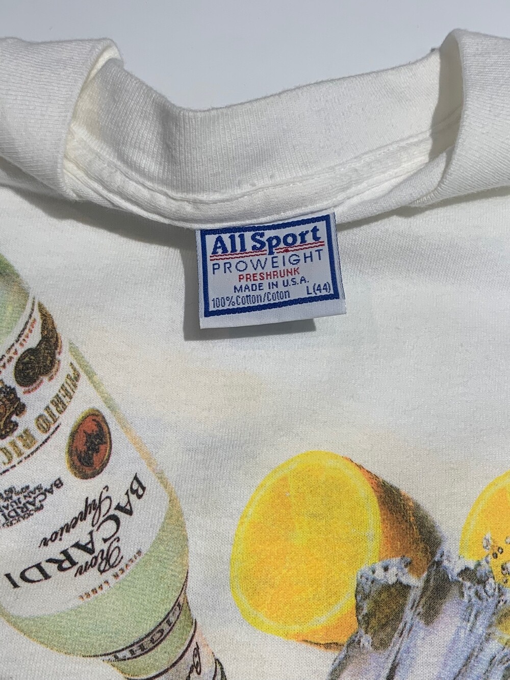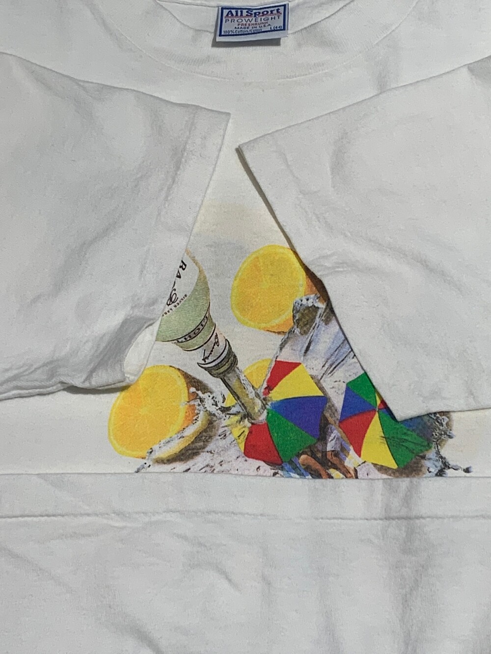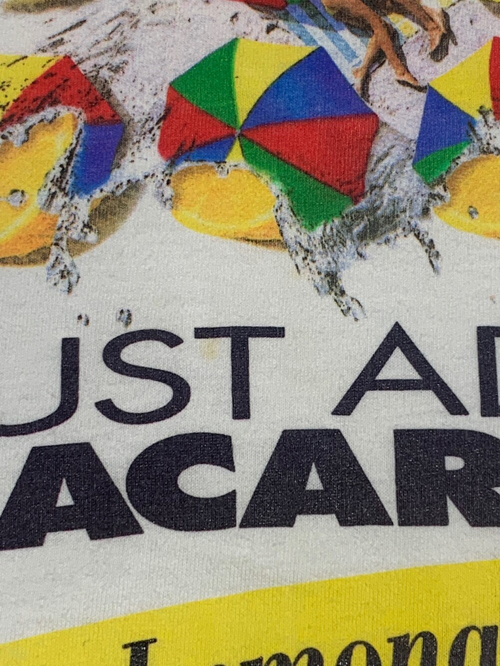 1990년대 포스터 커머셜 시리즈 JUST ADD BACARDI라는 슬로건과 함께 바카디를 붓는 자리에 다른 그림체가 섞이는 내용의 프로모션 티셔츠. 그 중에서도 초창기 버전에 해당하는 레모네이드 프린팅으로, 후면에는 포스터 내용에 걸맞는 적절한 문구가 배치되어 레몬을 겨냥한 내용인 SQUEEZE ME, PLEASE ME 라는 문구가 프린팅되어 있습니다.