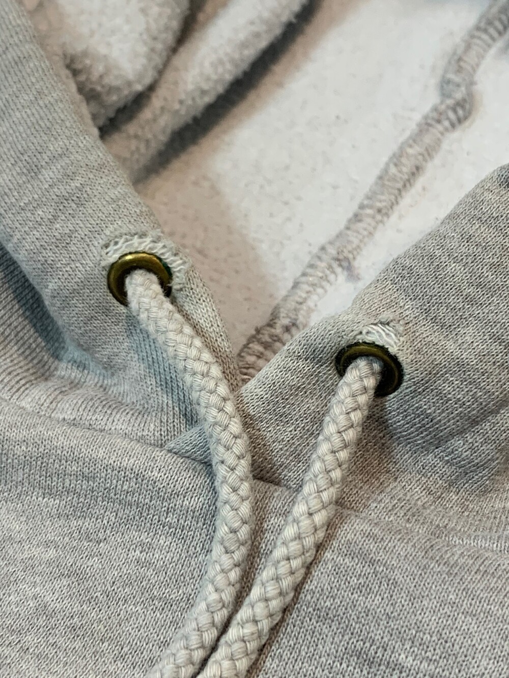 후드 아일렛 부분 데미지 및 넥라인 헤짐 등의 데미지가 있는, 사용감이 있는 제품.