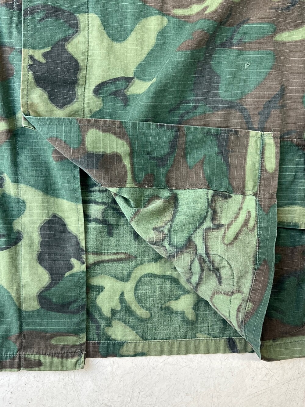 1968년 APPAREL CORP OF AMERICA 생산 100% 코튼 립스탑 포플린 소재의 정글 퍼티그 자켓입니다. 리프(Leaf) 패턴 이라고도 불리우는 ERDL 카모 패턴 중에서도 초록색이 우세인 하이랜드(Highland) 컬러입니다.