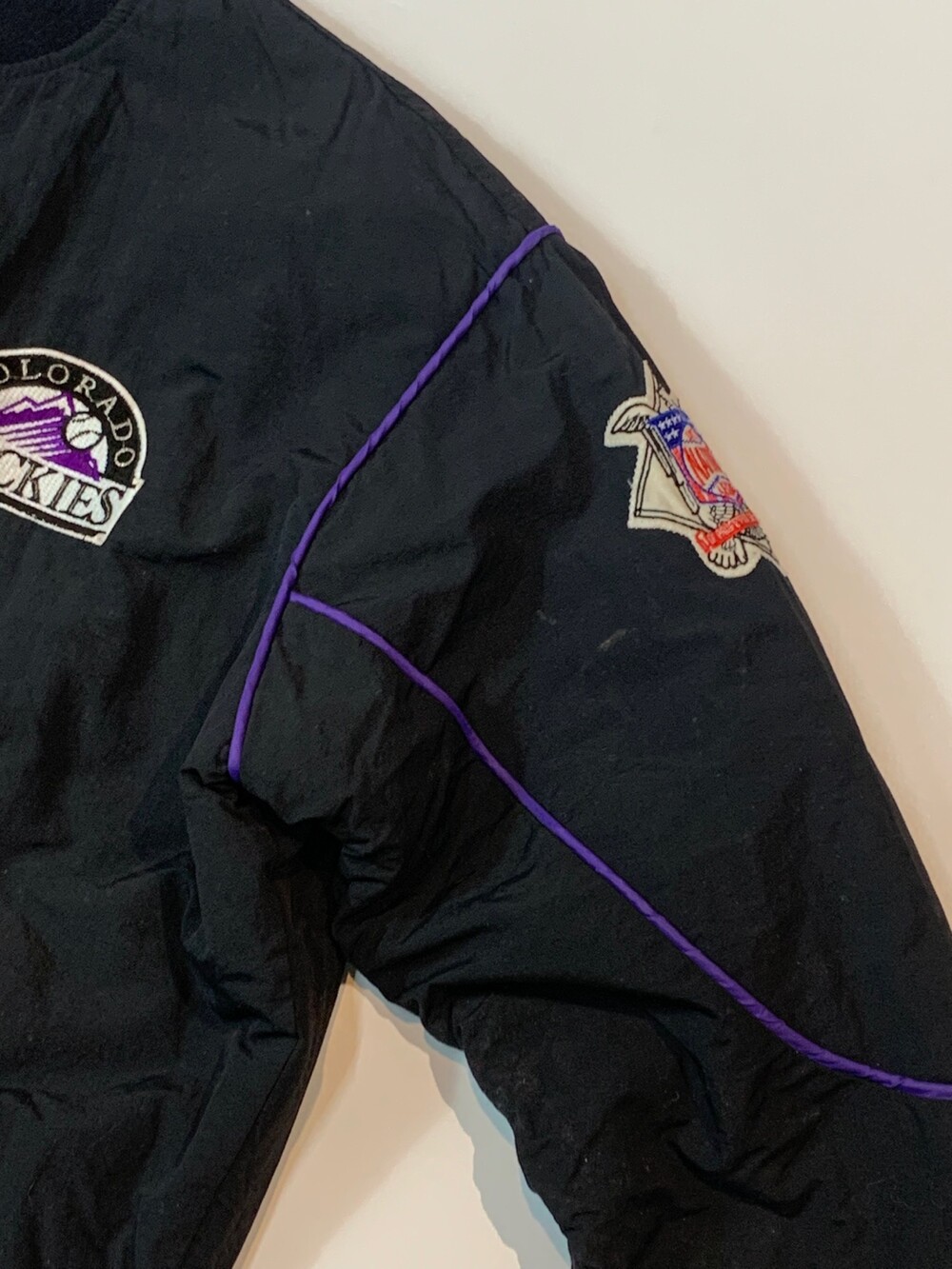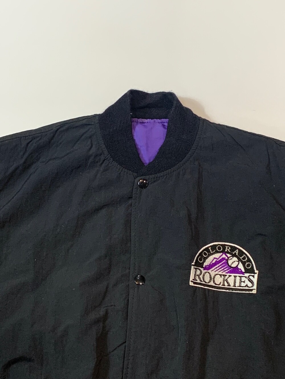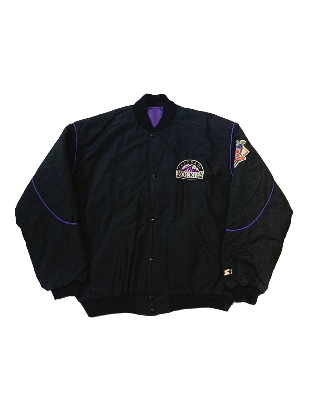 🚩Detail 그간 소개해왔던 팀 자켓과는 달리 바스락거리고 요철감이 있는 겉감을 사용하며 길이가 쩗고 너비가 넓은 립을 사용하는, 1990년대 초반 미국 생산 스타터의 팀 자켓입니다. 메이저리그 내셔널리그 소속 콜로라도 로키스의 팀 컬러와 패치가 적용된 제품으로, 본래 리버시블 사양은 아니지만 전면과 소매 패치 스티치가 안쪽에서는 보이지 않아 뒤집어 입어도 좋을만한 제품입니다.