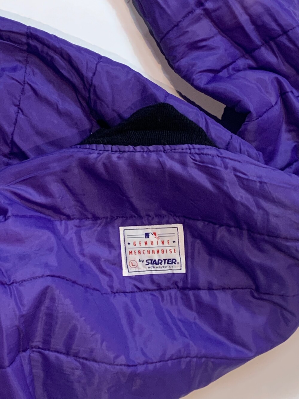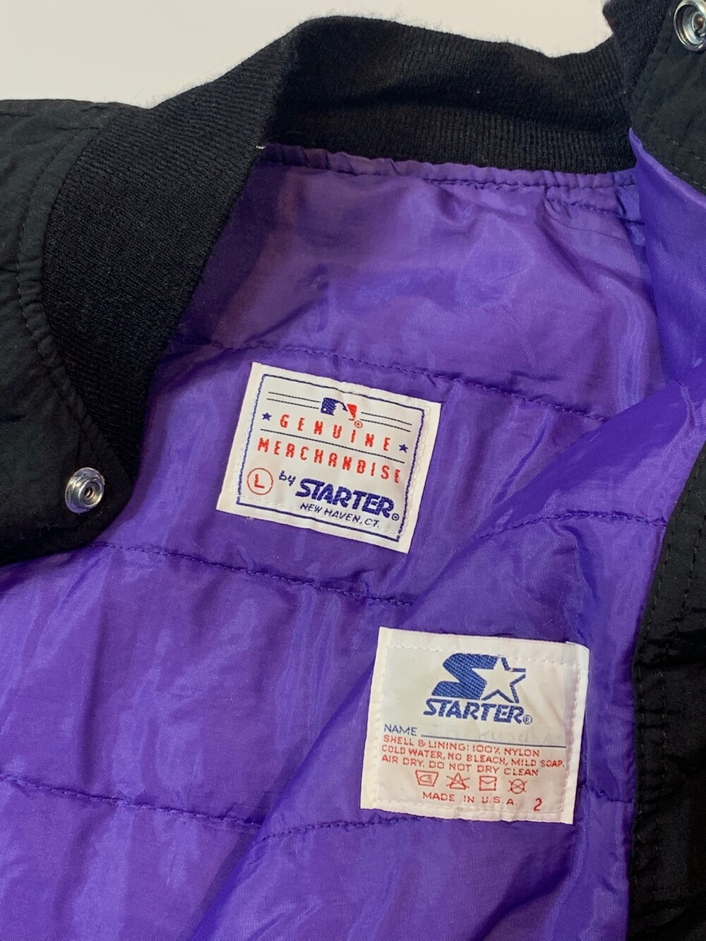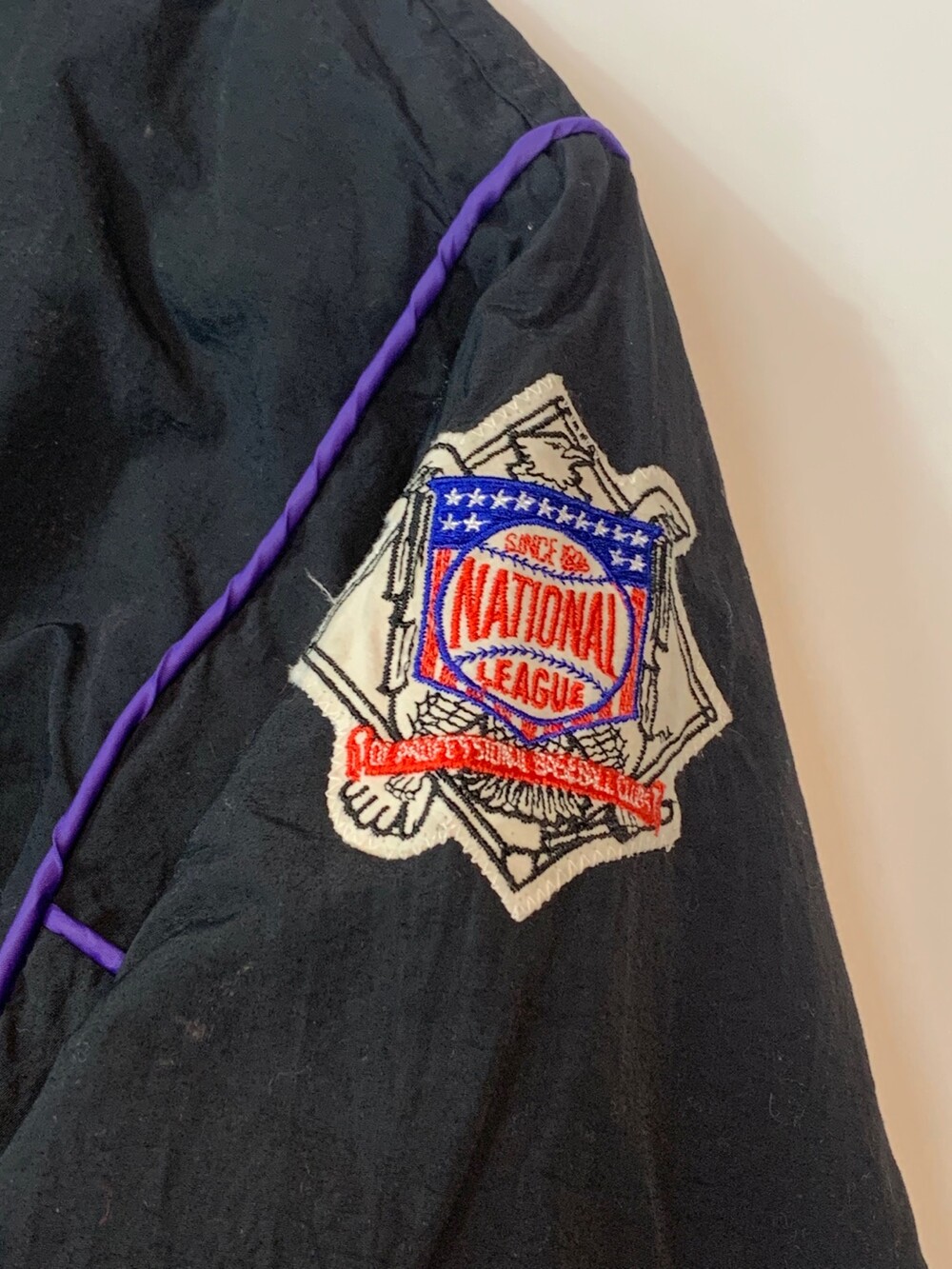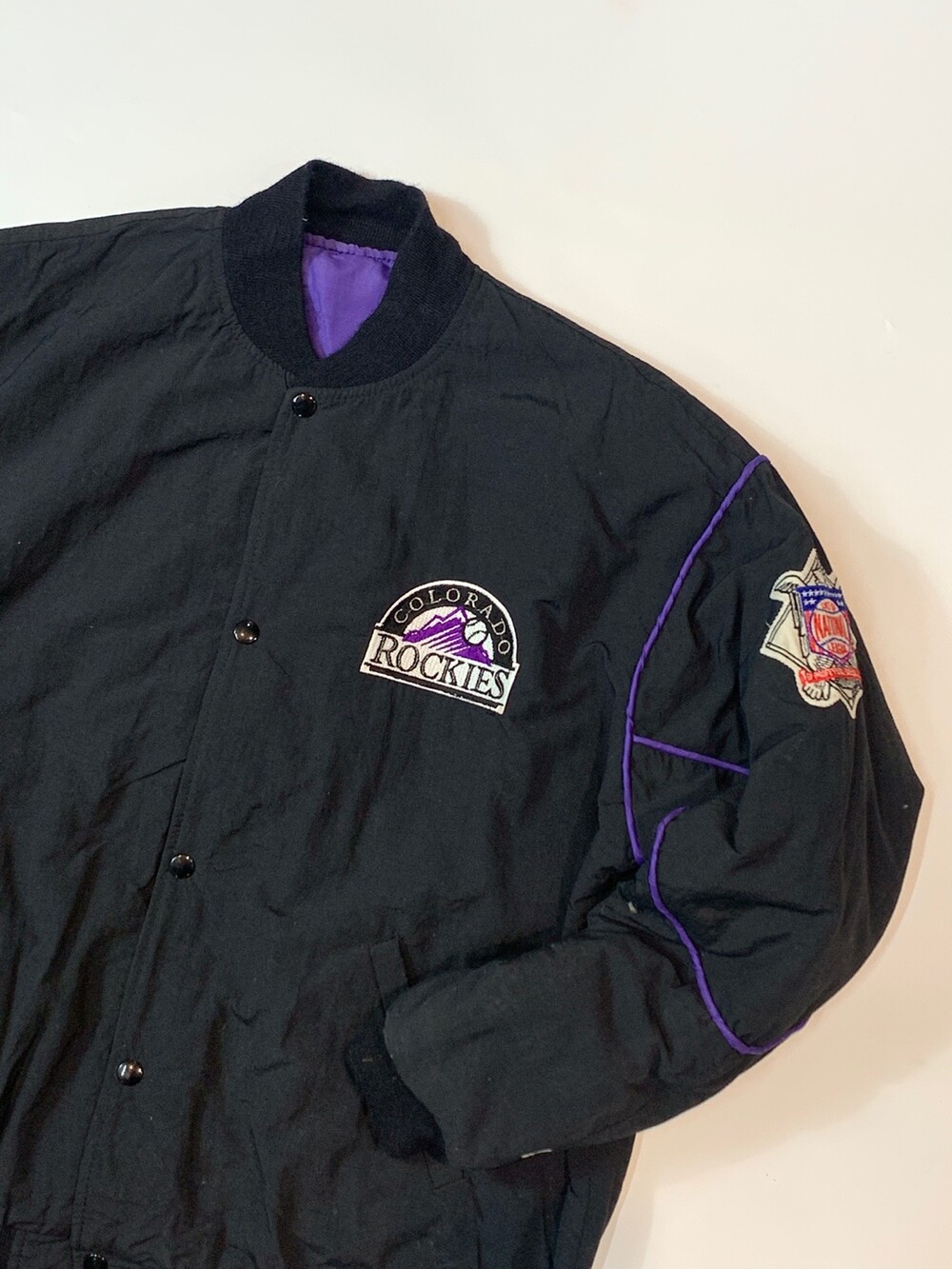 🚩Detail 그간 소개해왔던 팀 자켓과는 달리 바스락거리고 요철감이 있는 겉감을 사용하며 길이가 쩗고 너비가 넓은 립을 사용하는, 1990년대 초반 미국 생산 스타터의 팀 자켓입니다. 메이저리그 내셔널리그 소속 콜로라도 로키스의 팀 컬러와 패치가 적용된 제품으로, 본래 리버시블 사양은 아니지만 전면과 소매 패치 스티치가 안쪽에서는 보이지 않아 뒤집어 입어도 좋을만한 제품입니다.