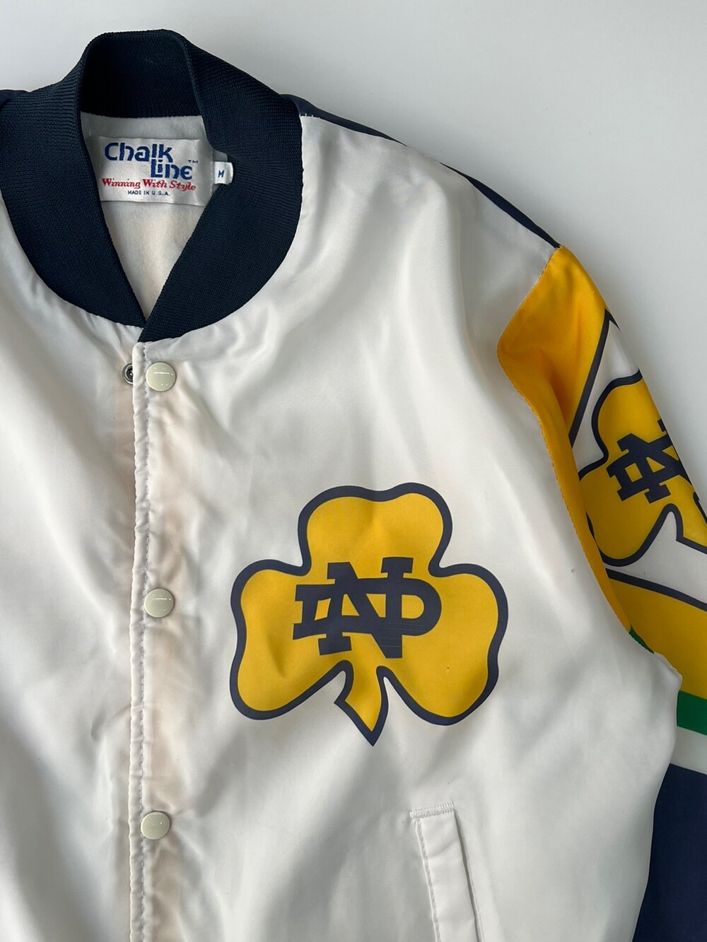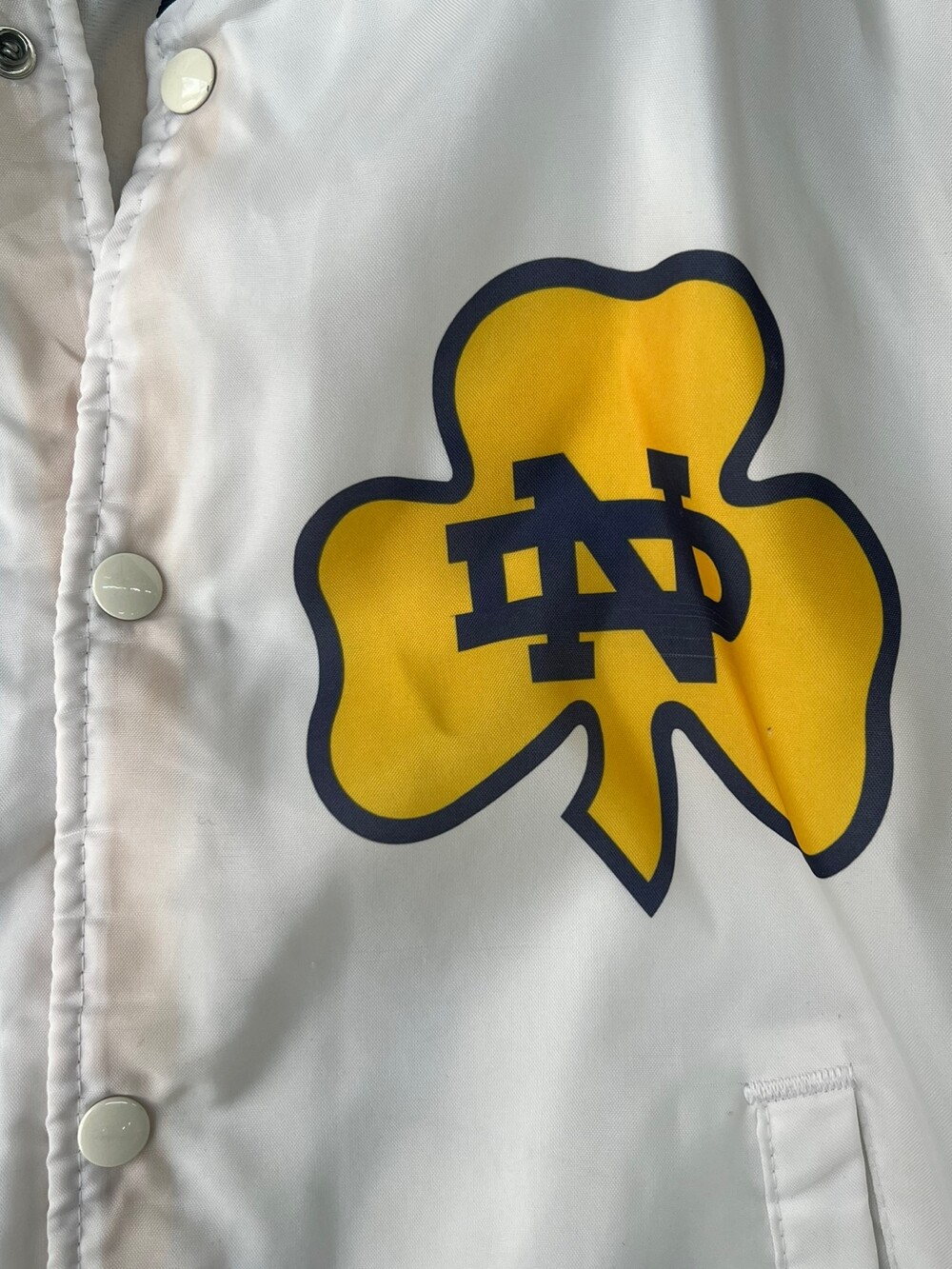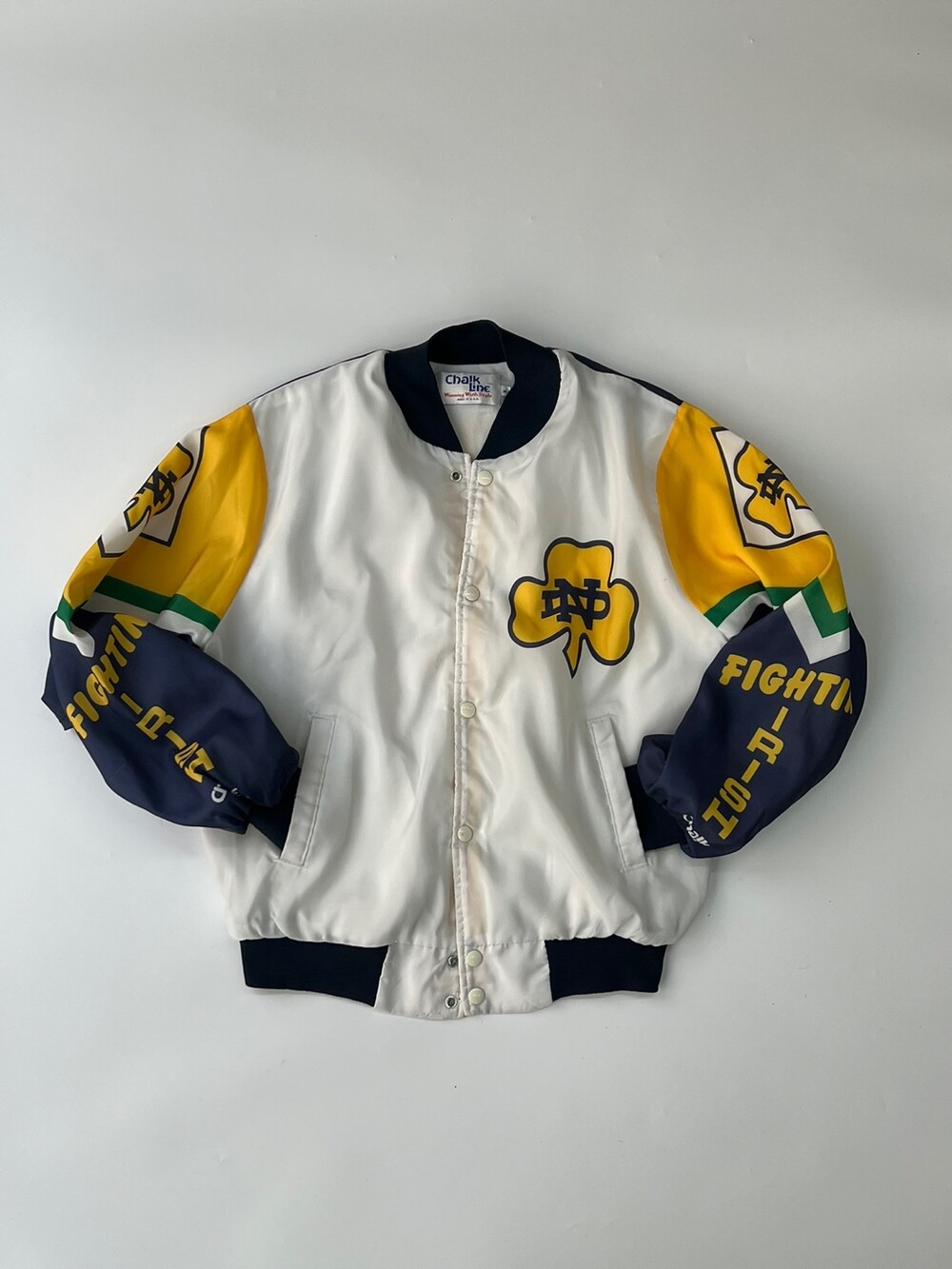 🚩Detail 북미권에서는 스포츠 팬(Fan)과 마스코트 프린팅(Animation)의 합성어인 Fanimation Jacket 이라는 품목으로 소개되는 전면 프린팅 자켓입니다. 미국 대학교 바시티 팀 중에서도 전국구 인기를 자랑하는 노터데임 대학교의 바시티 팀 노터데임 파이팅 아이리시(Notre Dame Fighting Irish)의 프린팅이 전면에 배치된 제품입니다. 스타터나 팰코와 마찬가지로 팀 웨어 메이커로서 알려진 Chalk Line의 제품으로 나일론 겉감에 얄팍한 플리스 라이닝이 붙은 제품입니다.