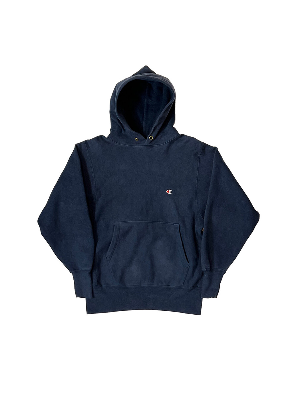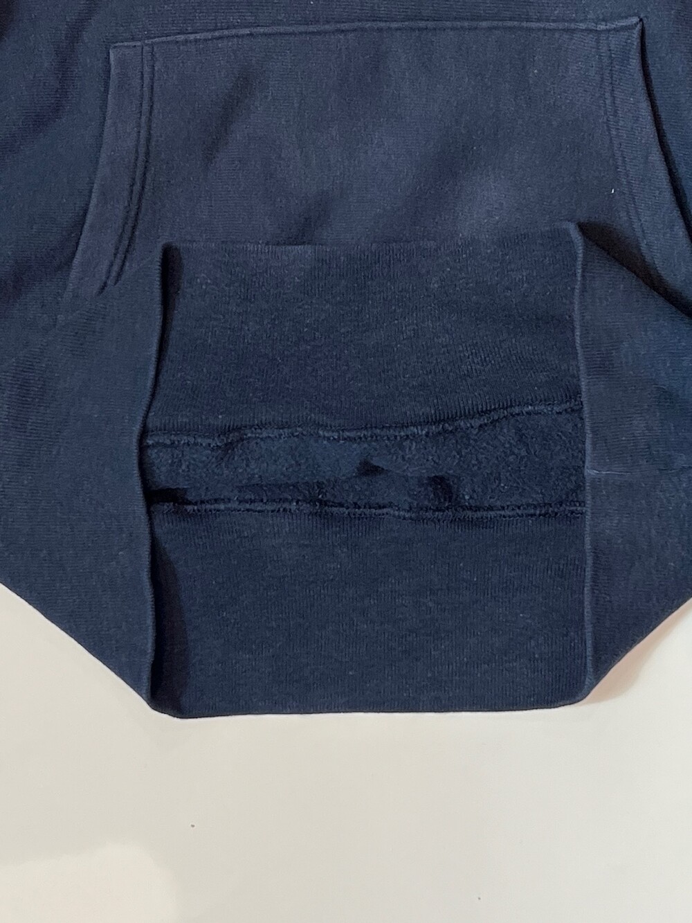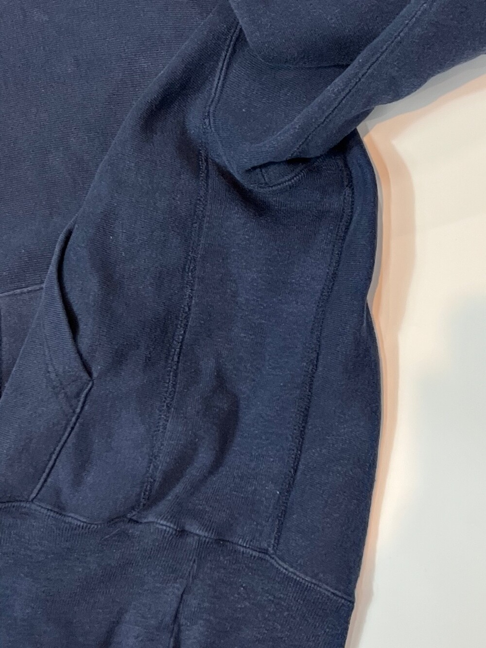 네이비 컬러의 리버스위브 스웻 후디입니다. 넓은 암홀과 길고 타이트한 소매 립으로 인해 리버스위브 특유의 실루엣이 두드러지는 품목입니다. 거기에 더해 각잡힌 고깔 형태의 후드는 특유의 미국발 스포츠웨어 특유의 투박함이 두드러지는 요소입니다.