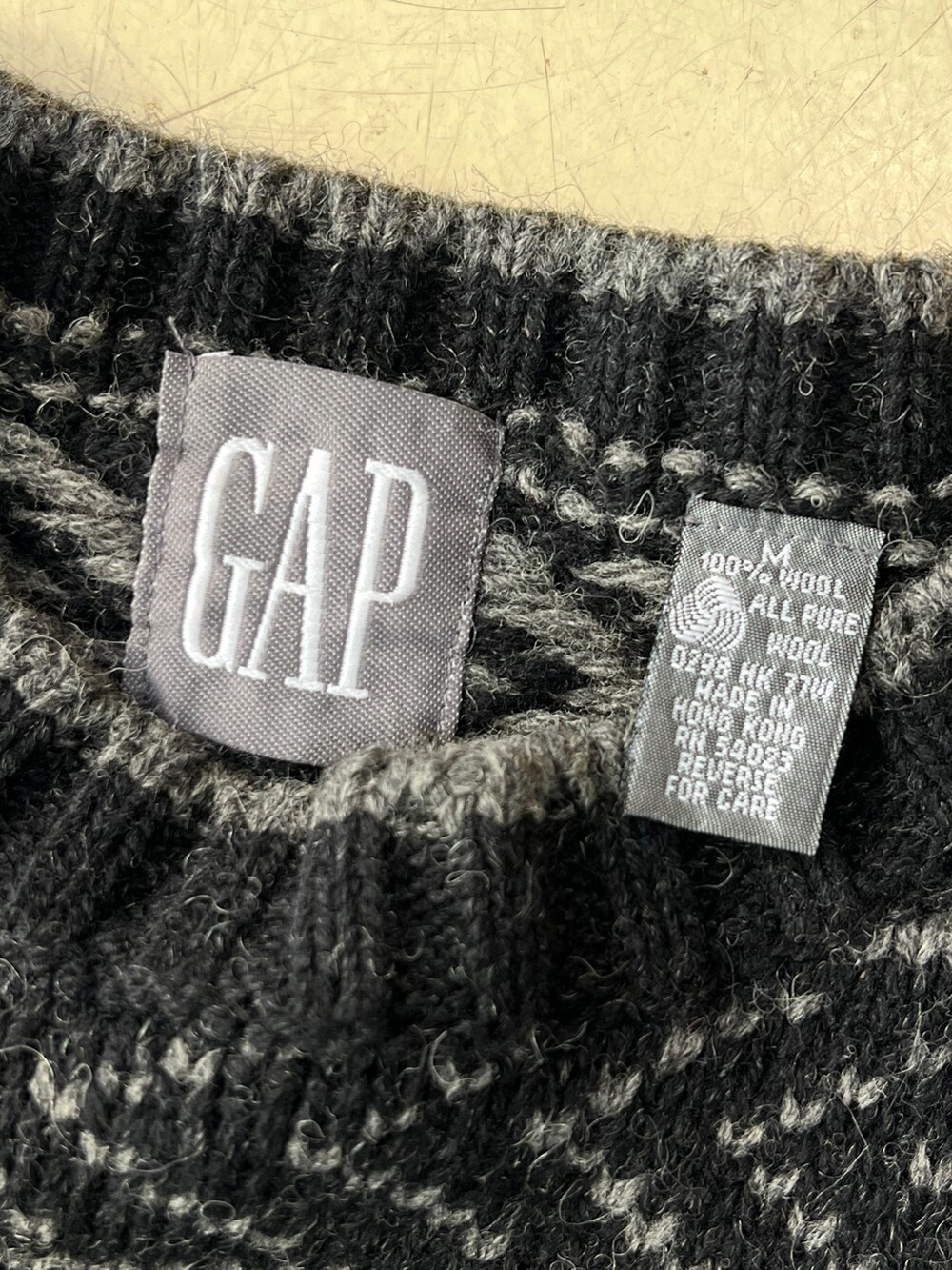 퓨어 울 소재는 자연적으로 자라는 양모만을 채집해 섬유로 만든 것으로, 1990년대 갭(GAP)에서 생산한 성글게 짜인 헤비 울 스웨터입니다. 갭의 상의류는 보통 가슴단면보다 어깨단면의 너비가 넓은 드롭숄더 패턴을 선보이는 편인데, 해당 제품 역시 어깨단면이 넓어 착용 시 루즈한 실루엣을 선보이는 제품입니다.