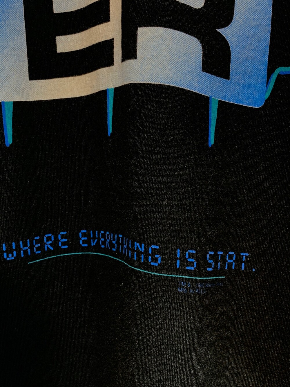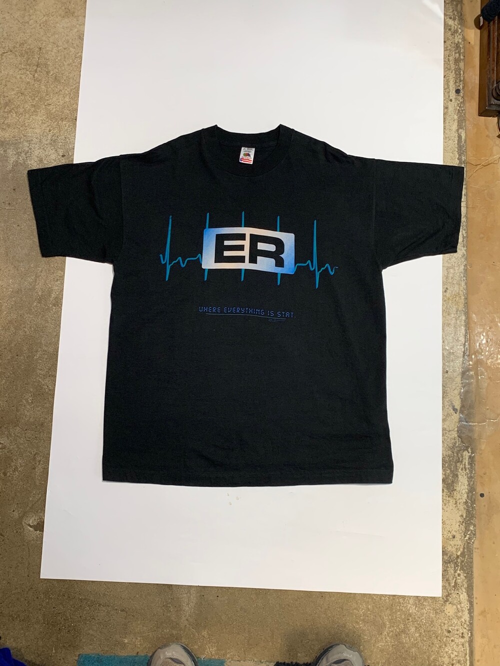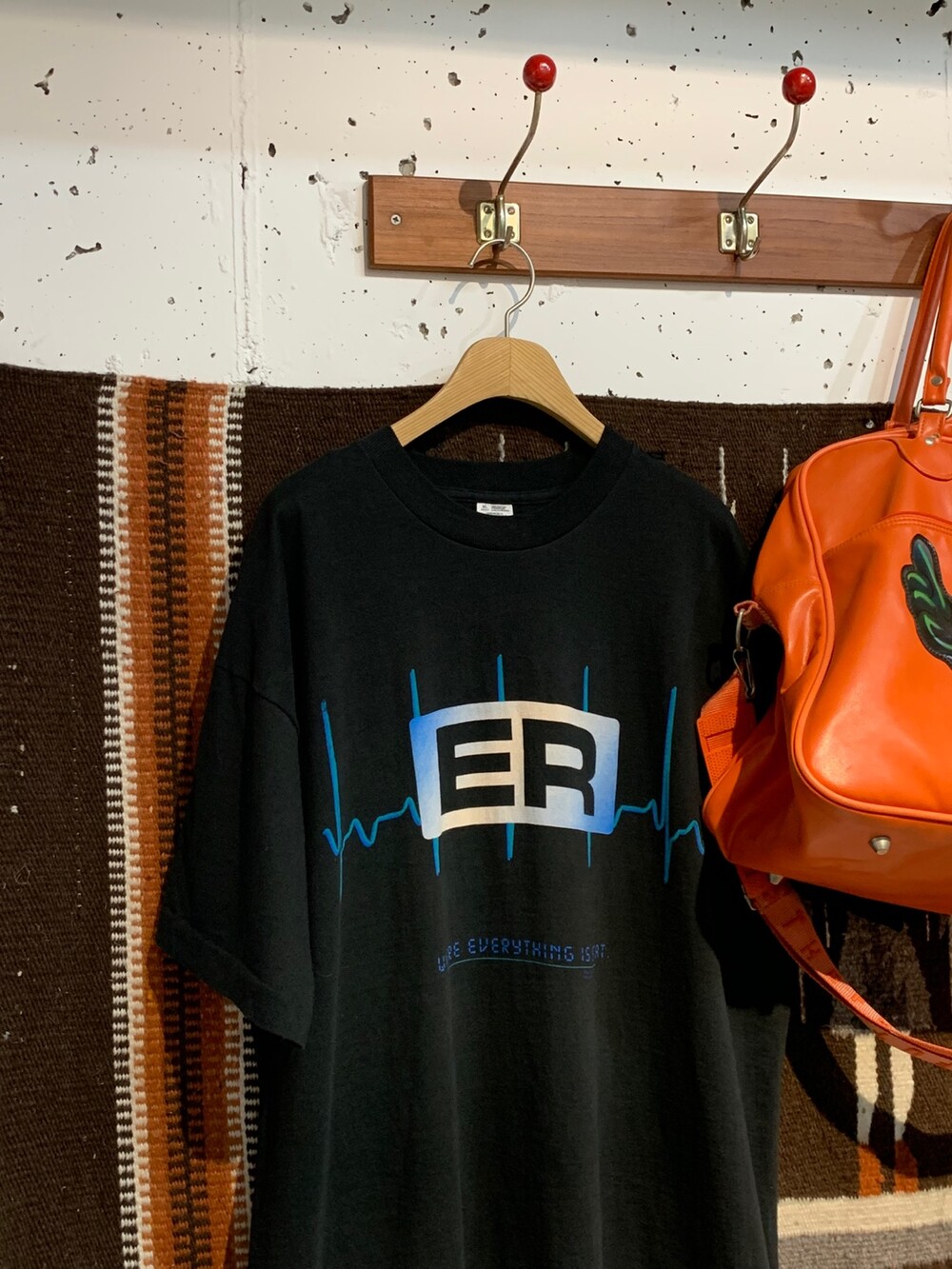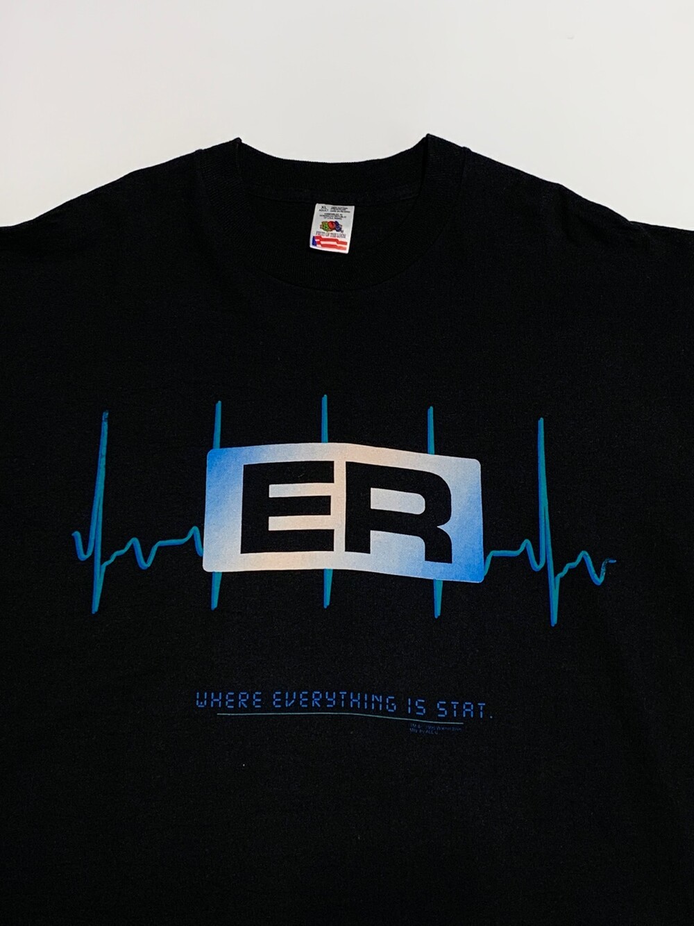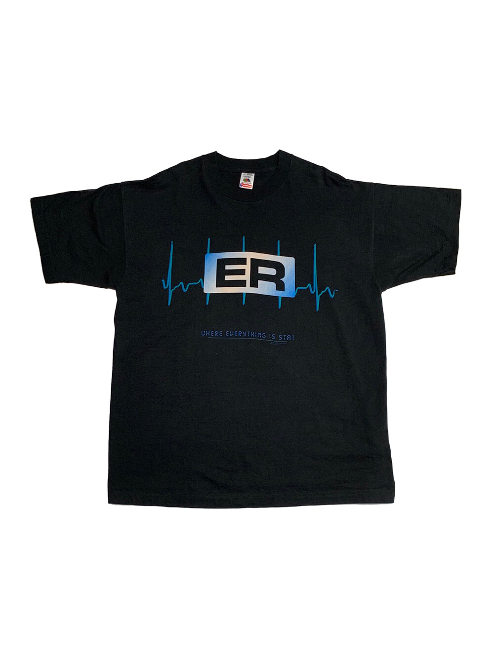 1995년 라이센스 프린팅이 올려진 ER 프로모션 티셔츠입니다. 크게 녹색과 파란색 두 가지 버전이 있는데, 비교적 심플하게 심전도 그래픽과 로고, 그리고 이머전시 룸에 대한 코멘트인 WHERE EVERYTHING IS START 라는 문구가 프린팅된 제품입니다. 표기 XL로 105호 혹은 그보다 작게 착용하는 분들에게 권장드립니다.]