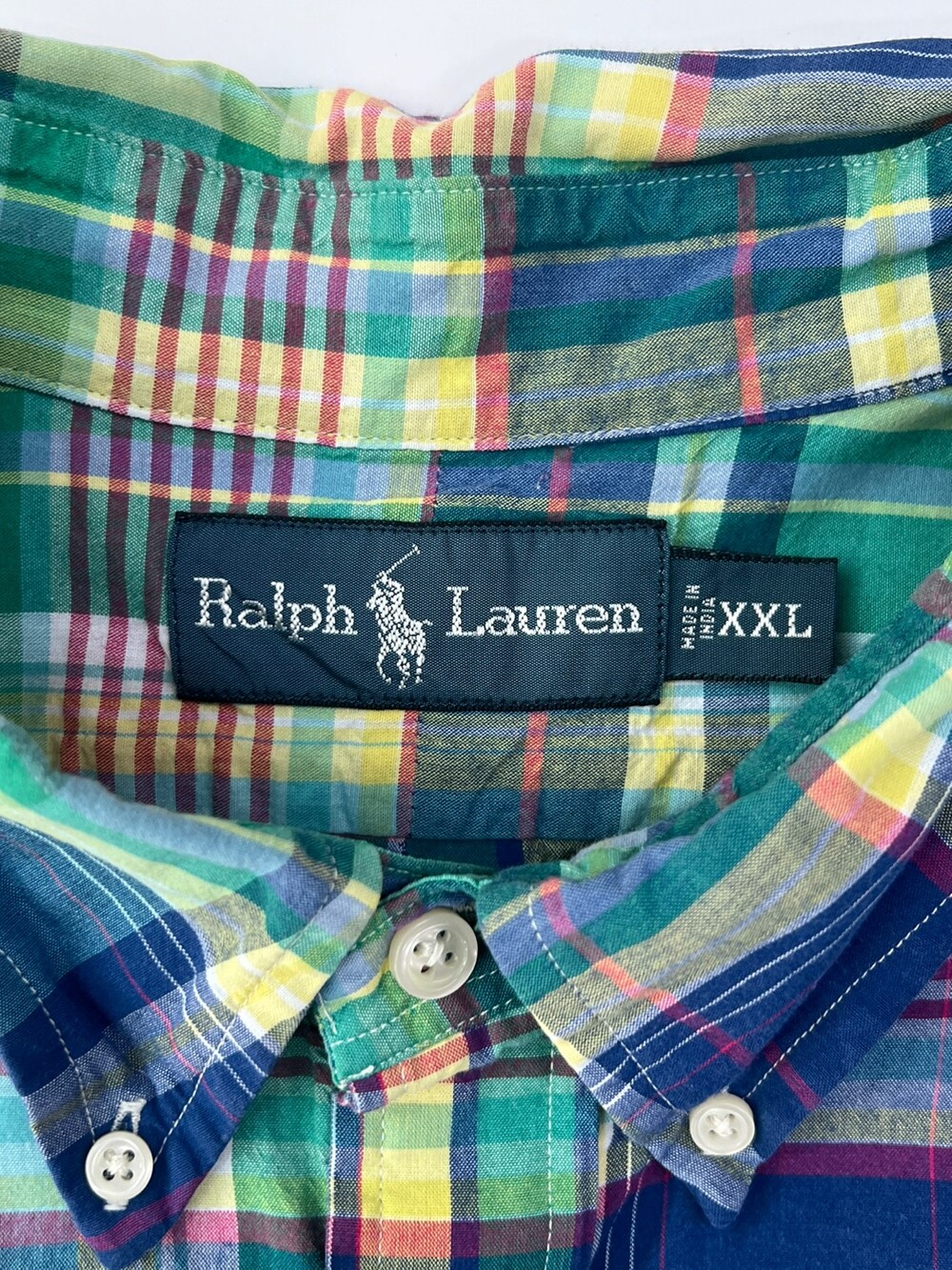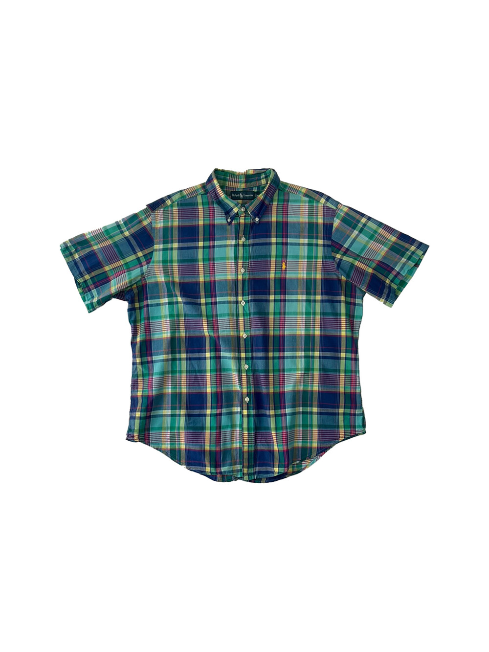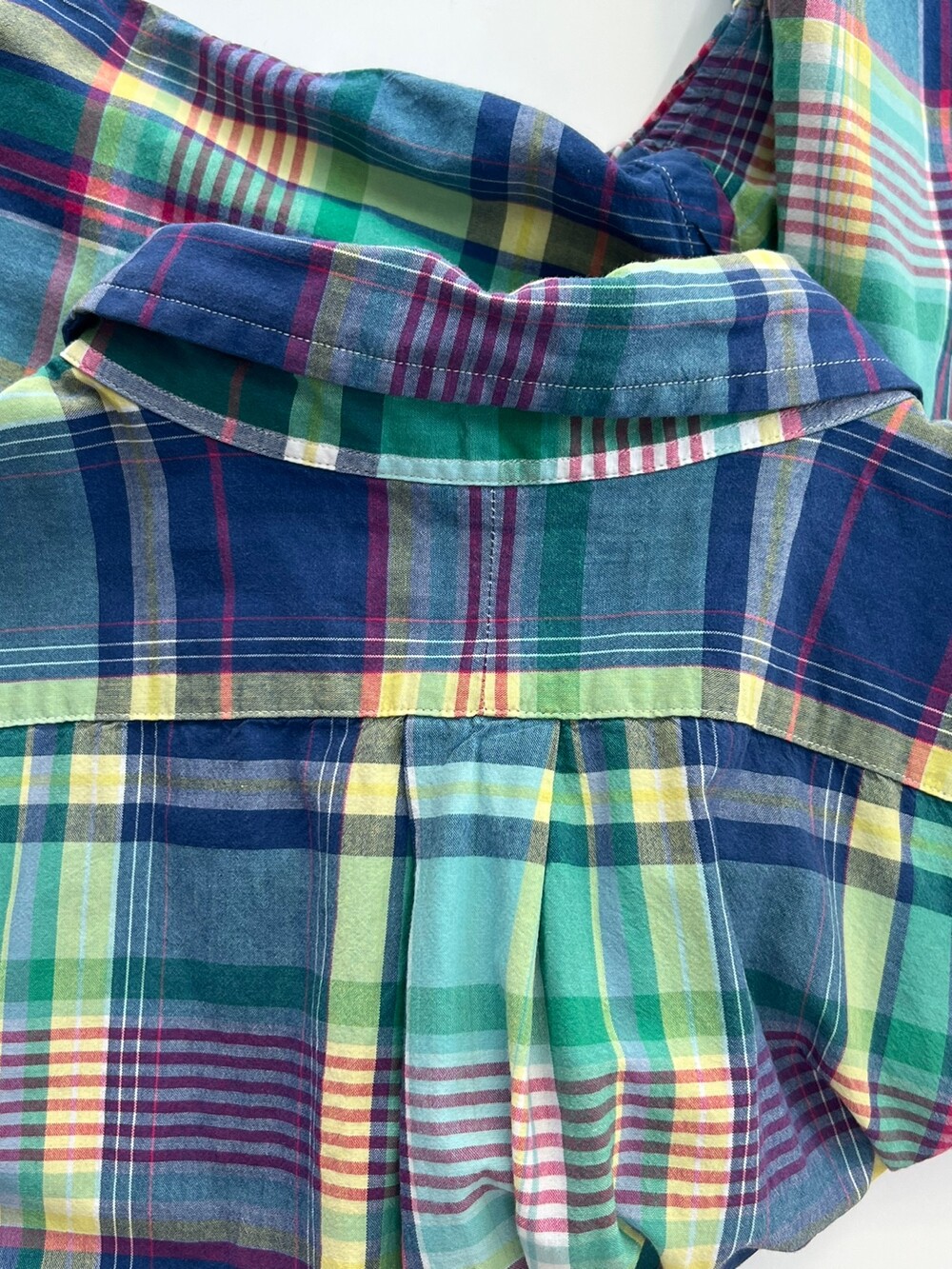 MADE IN INDIA 에서 추정할 수 있듯이 코튼 100% 의 평직으로 짜여진 마드라스 코튼 원단의 반팔 셔츠입니다. 마드라스 체크 특유의 희끄무레한 색감과 차가운 온도감의 색 조합의 체크 배색이 매력적입니다. 얇고 가벼운 소재로 여름철에 활용하기 좋은 제품입니다.