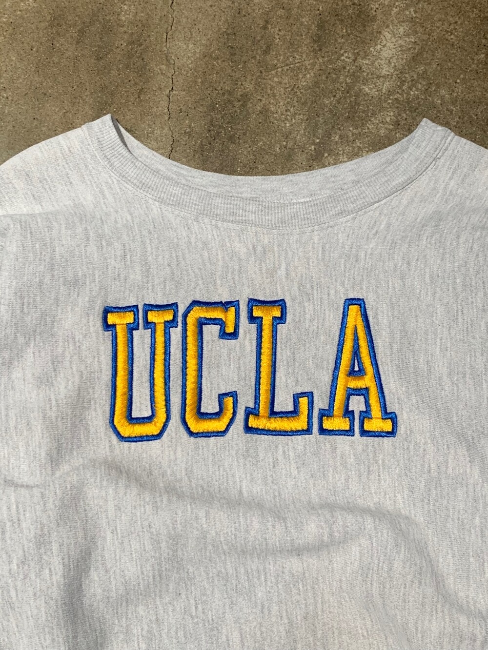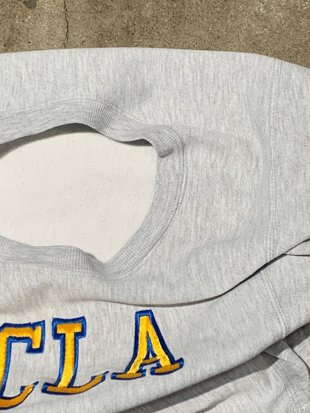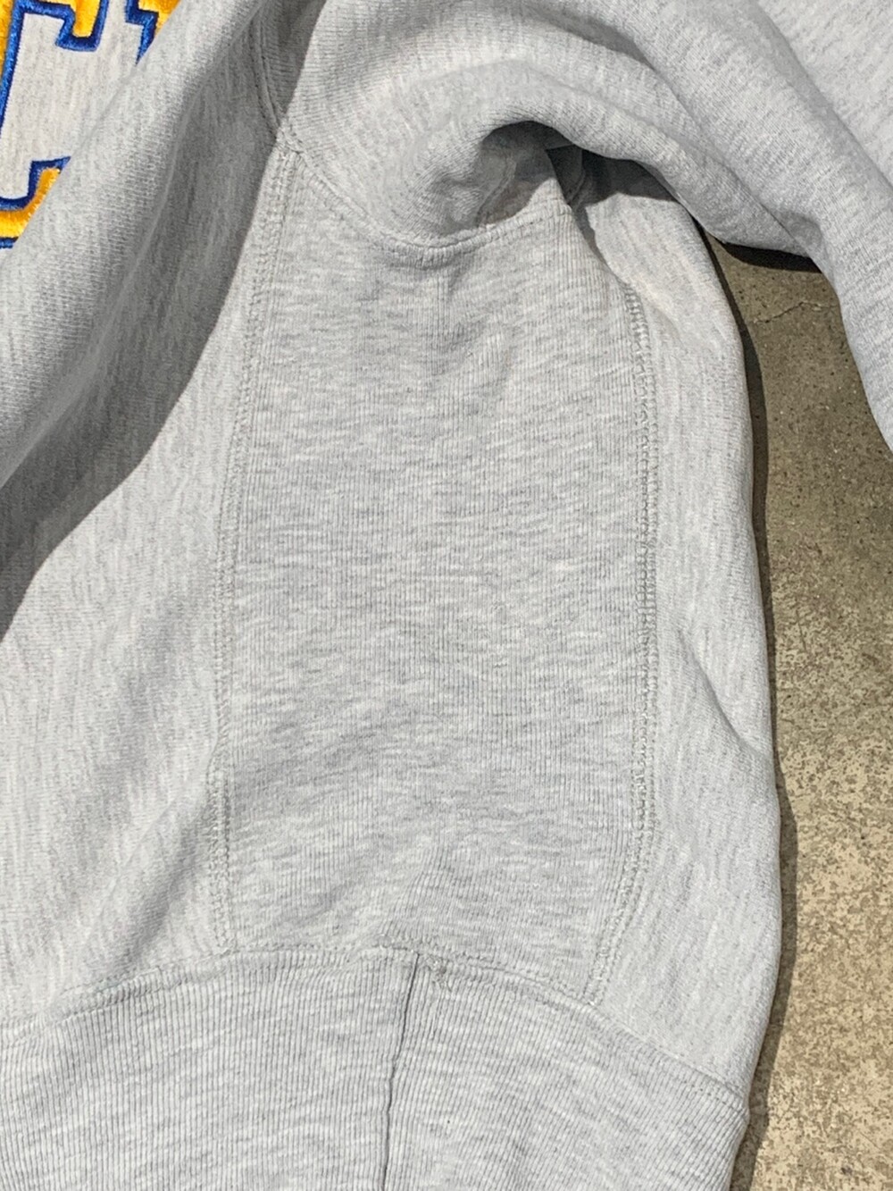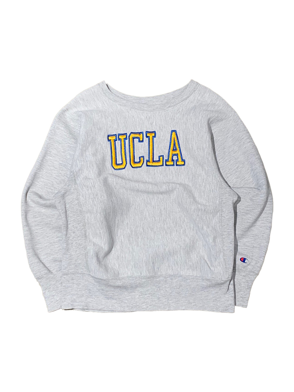 🚩Detail 몸판 원단 결이 가로방향을 향하도록 원단 재단방향을 90도로 돌려 재단하는 호리즌탈 위브 타입 중에서도 가장 대표적인 메이커인 챔피온의 리버스위브 스웻셔츠입니다. 스포츠웨어로서 활동성을 보장하기 위한 여러가지 디테일로 인해 독특한 피팅감을 보이는 제품입니다. 전면에는 미국 캘리포니아주에 위치한 UCLA(University of California, Los Angeles) 배색을 활용한 스펠아웃 자수가 놓여 캐주얼하게 착용하기 좋을만한 제품입니다.