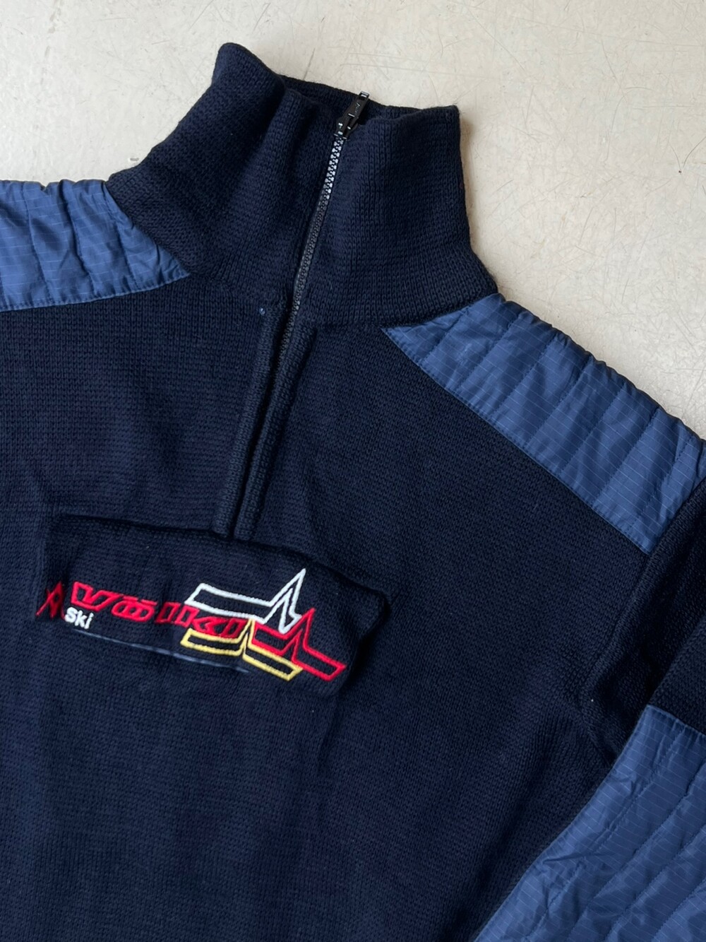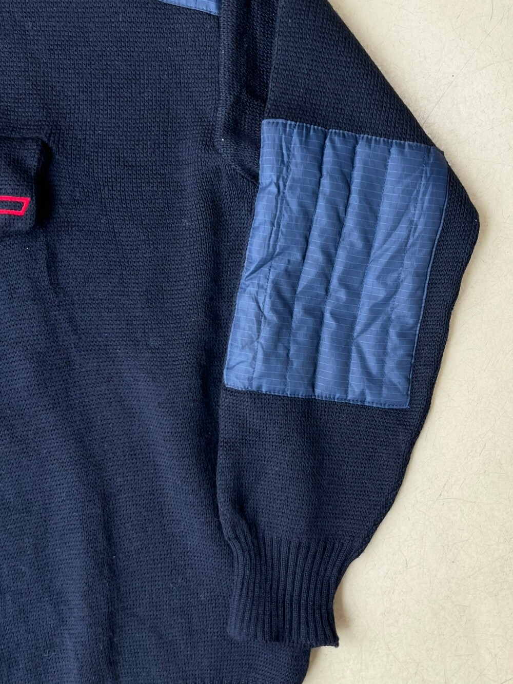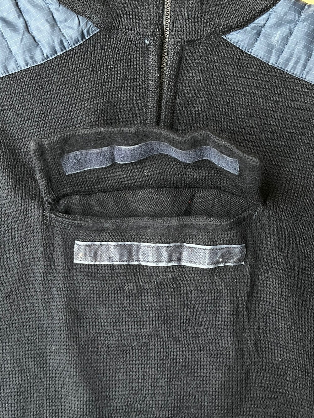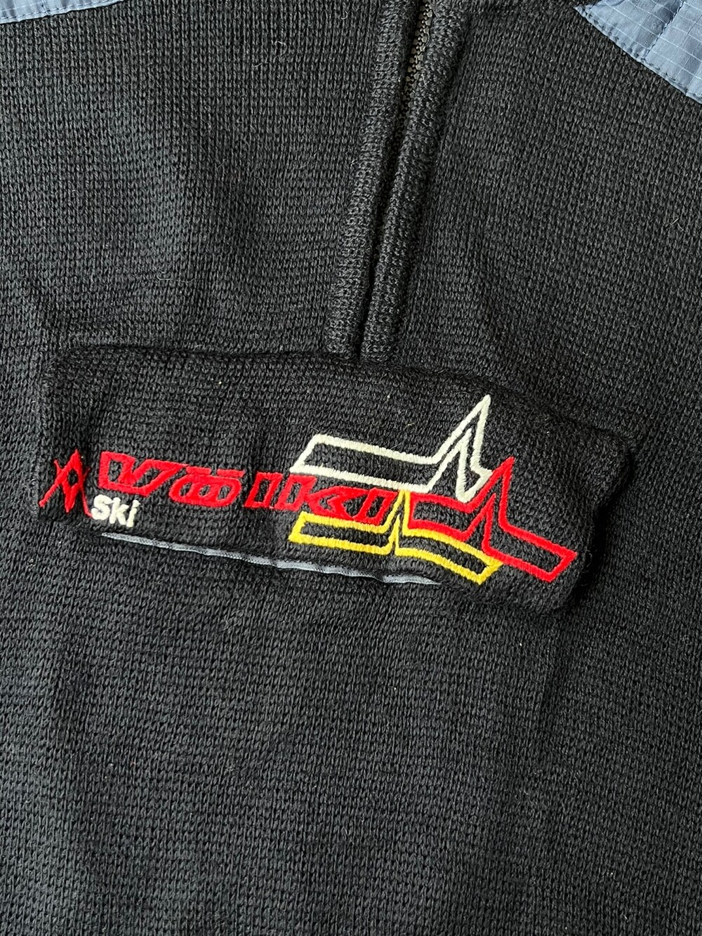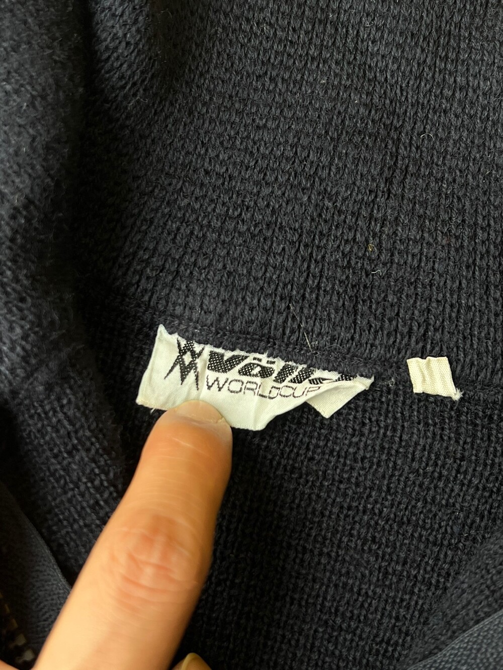 독일의 스포츠 장비 제조업체 뷜클(Völkl)에서 생산한 유럽제 코만도 스웨터입니다. 하프집업 타입의 울 스웨터로 벨크로로 열고 닫을 수 있는 가운데 포켓도 독특한 디테일입니다.