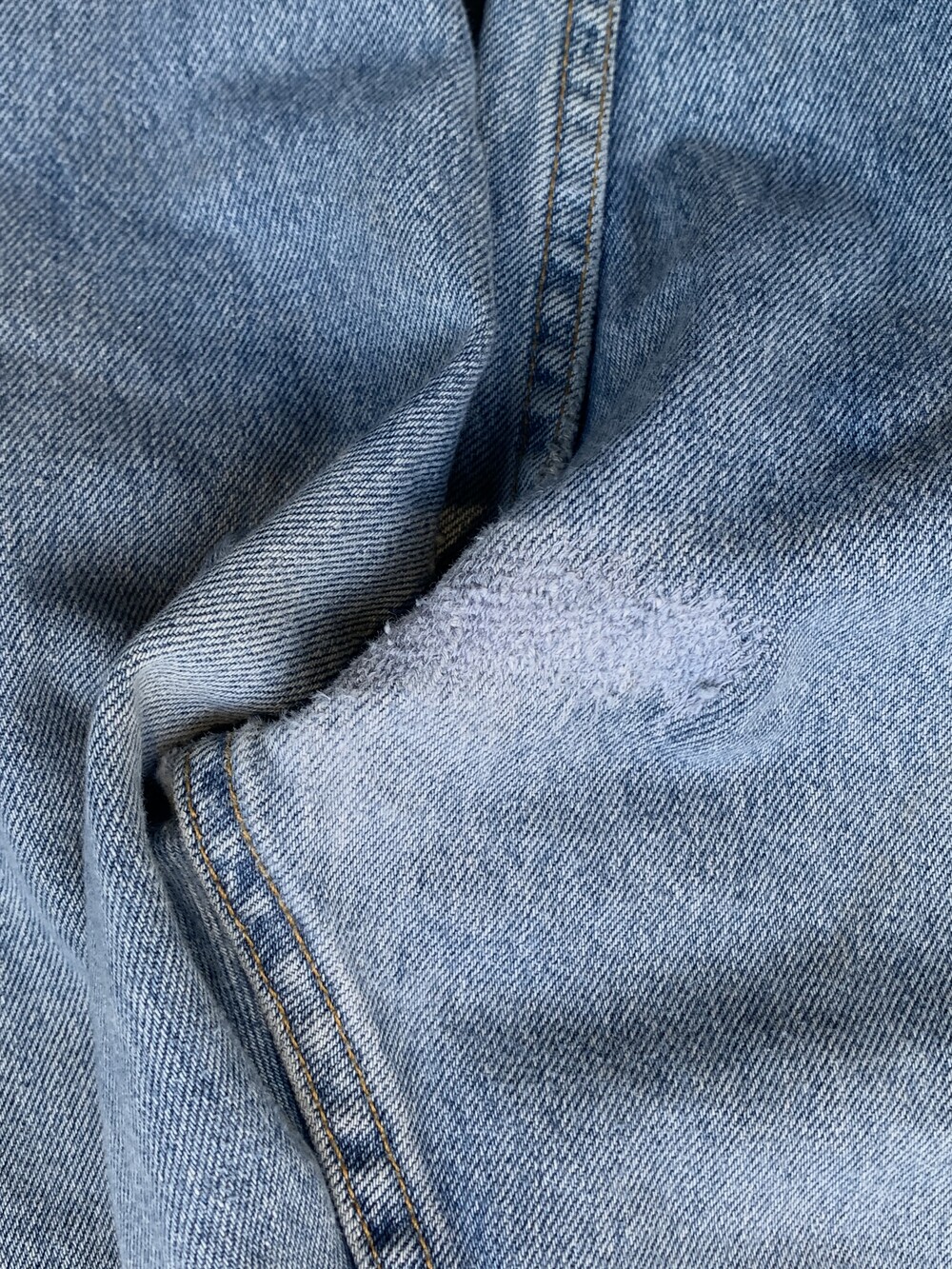 뒷면 가랑이 부분 보강수선 및 밑단 기장수선된, 전반적으로 사용감은 있으나 눈에 띄는 데미지는 없는 제품