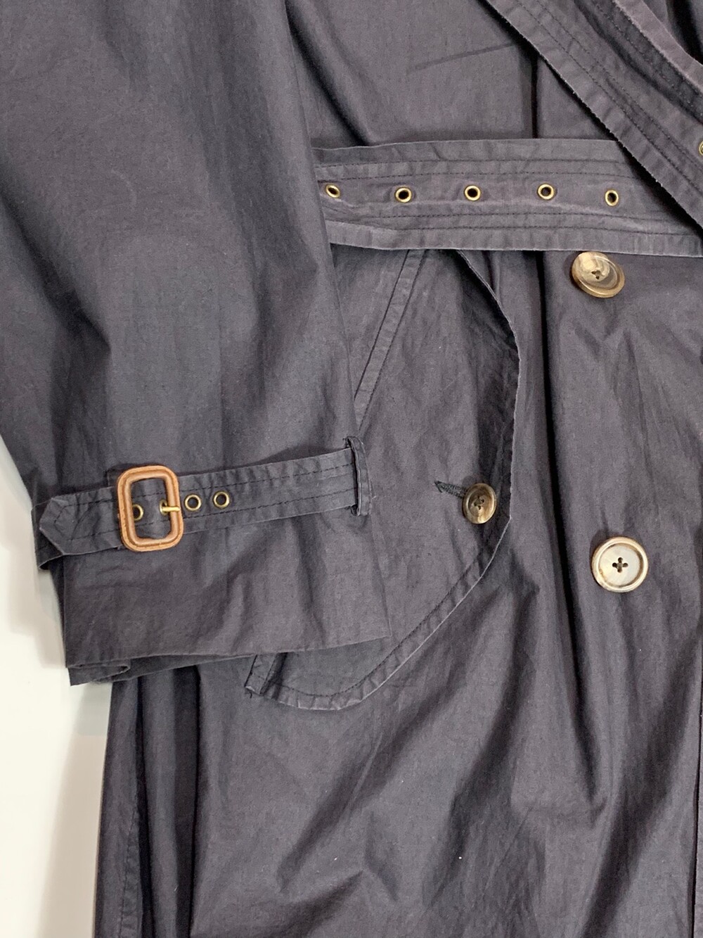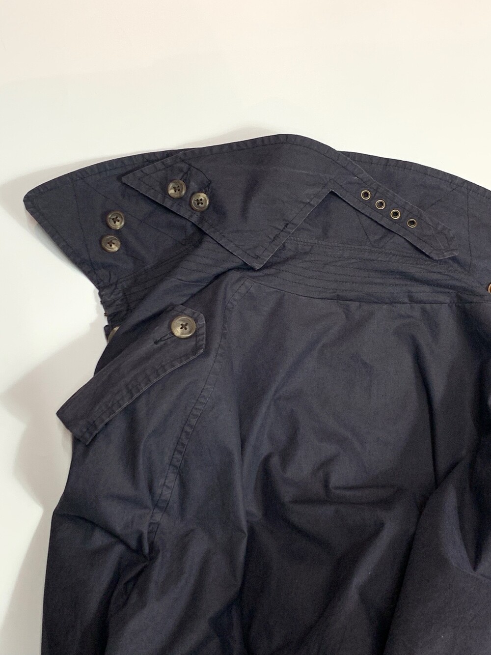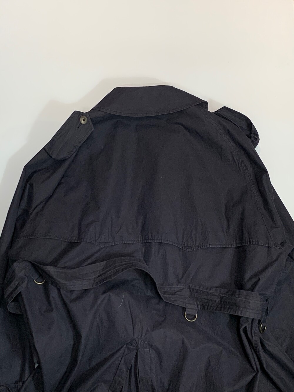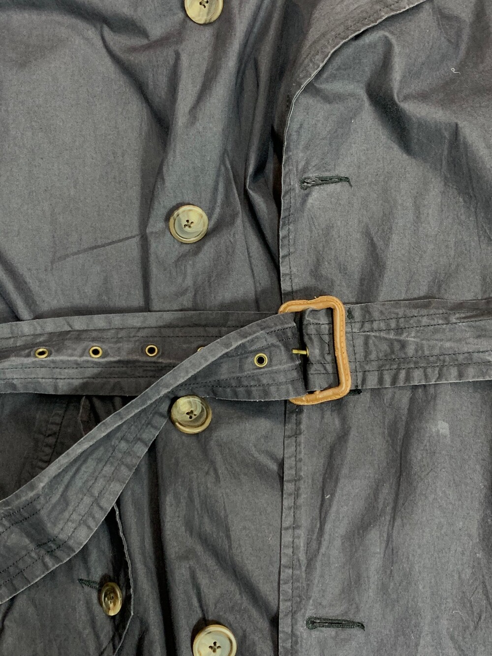🚩Condition 하단부 고정용 단추 유실 및 원단 손상(수선 예정), 벨트 고리 4개 중 하나 유실, 안쪽 고정용 단추 손상, 칼라 부분 희끄무레한 얼룩 등 사용감은 있으나 착용에 큰 지장 없을만한, 사용감 있는 제품.