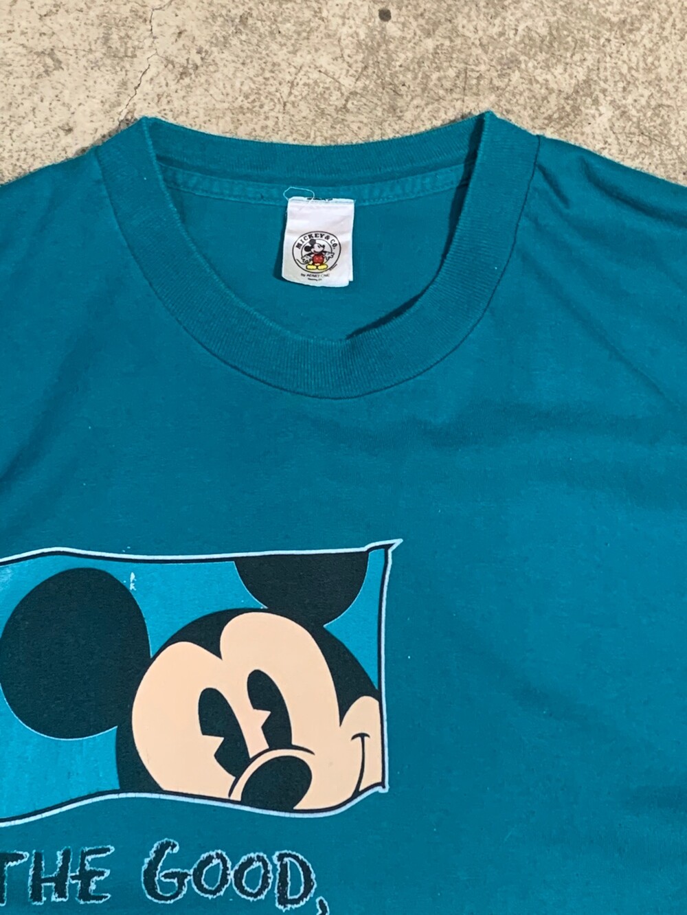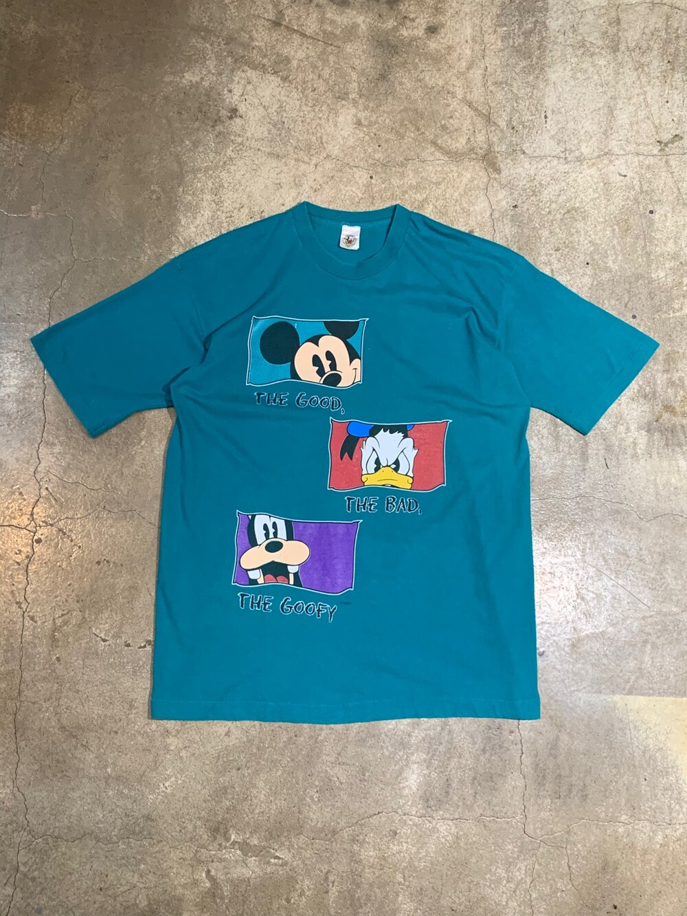 🚩Details 미국의 언더웨어 및 스포츠웨어 메이커 프룻오브더룸(FRUIT OF THE LOOM) 티셔츠 바디 위에 디즈니 프린팅이 올려진 티셔츠. 1966년작 스파게티 웨스턴 장르의 고전 서부영화 THE GOOD, THE BAD, THE UGLY에서 착안하여 이미지에 걸맞는 캐릭터가 배열된 프린팅입니다. 또한 GOOF TROOP 이라는 제목의 애니메이션 시리즈 중에서 1992년에 방영한 THE GOOD, THE BAD, AND THE GOOFY 라는 에피소드가 있습니다.
