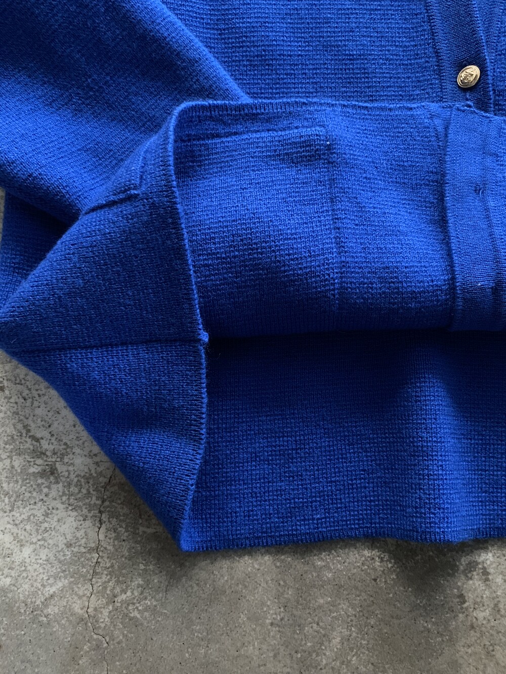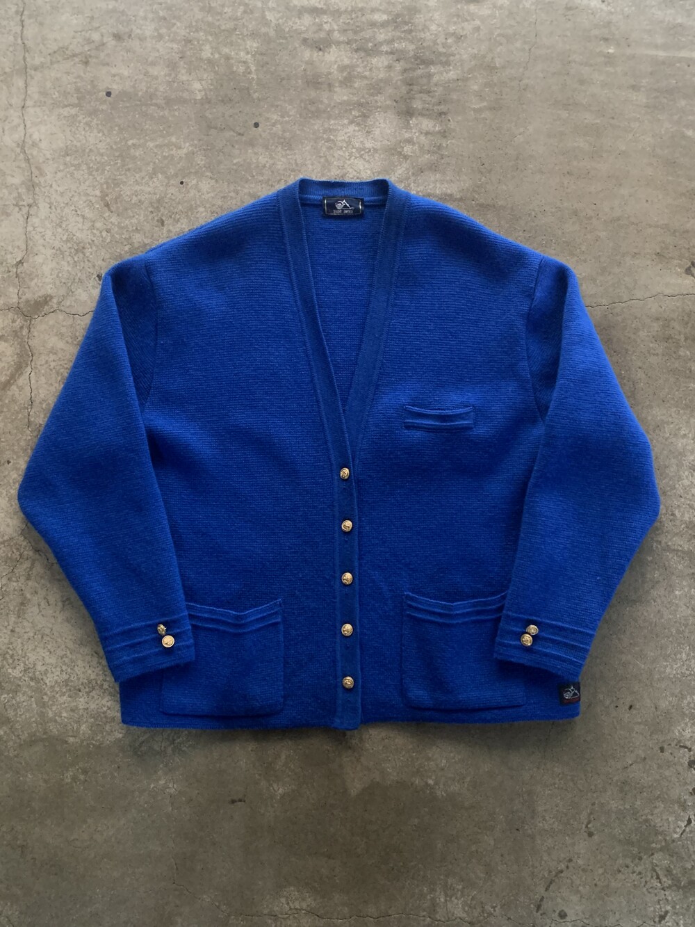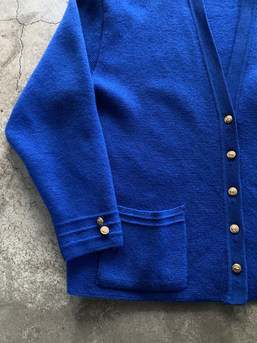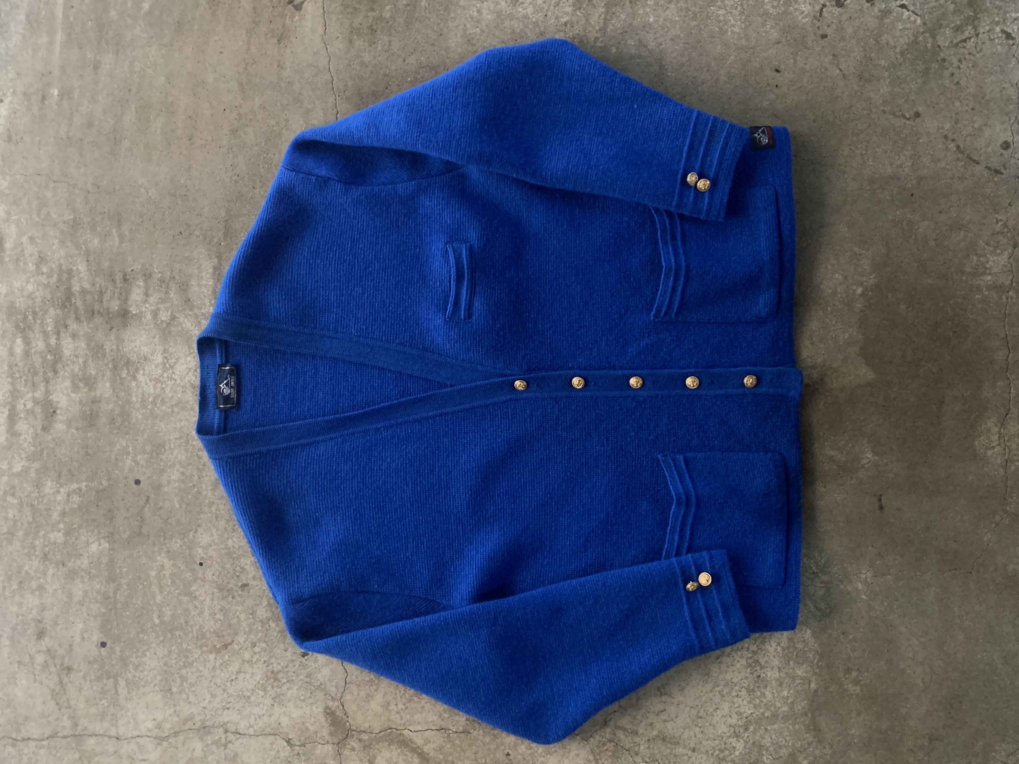 1970-80년대 사이 생산으로 추정되는 올드 세인트 울 카디건. 포켓 입구와 소매 짜임이 다르게 들어가는 독특한 형태와 금장 버튼이 돋보이는 제품으로, 본래 여성용이나 여유롭게 나와 남성들도 충분히 착용할 수 있을만한 제품입니다.