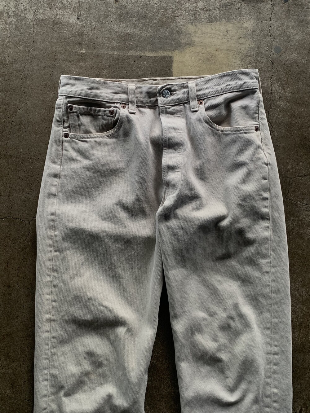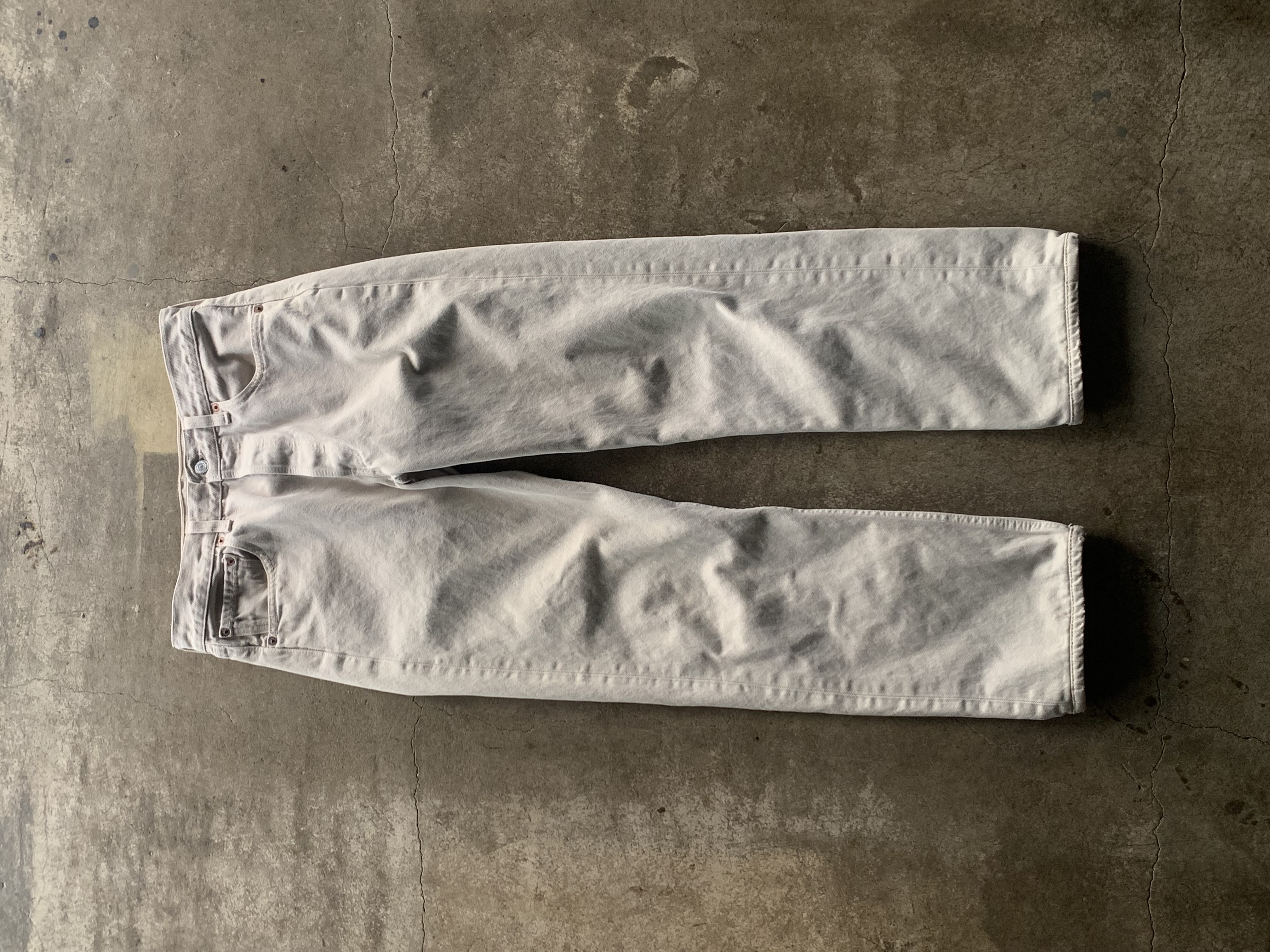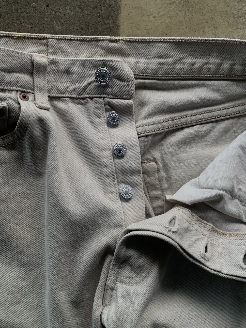 1997년 4월 미국 생산 501 데님팬츠입니다. 리바이스를 대표하는 버튼플라이 사양의 클래식한 슬림 스트레이트 실루엣의 팬츠로, 화이트 컬러보다는 부담없이 착용할 수 있는 오프화이트 컬러와 밑단 기장이 수선되었으나 501 특유의 슬림한 비례감을 유지하고 있는 제품입니다.