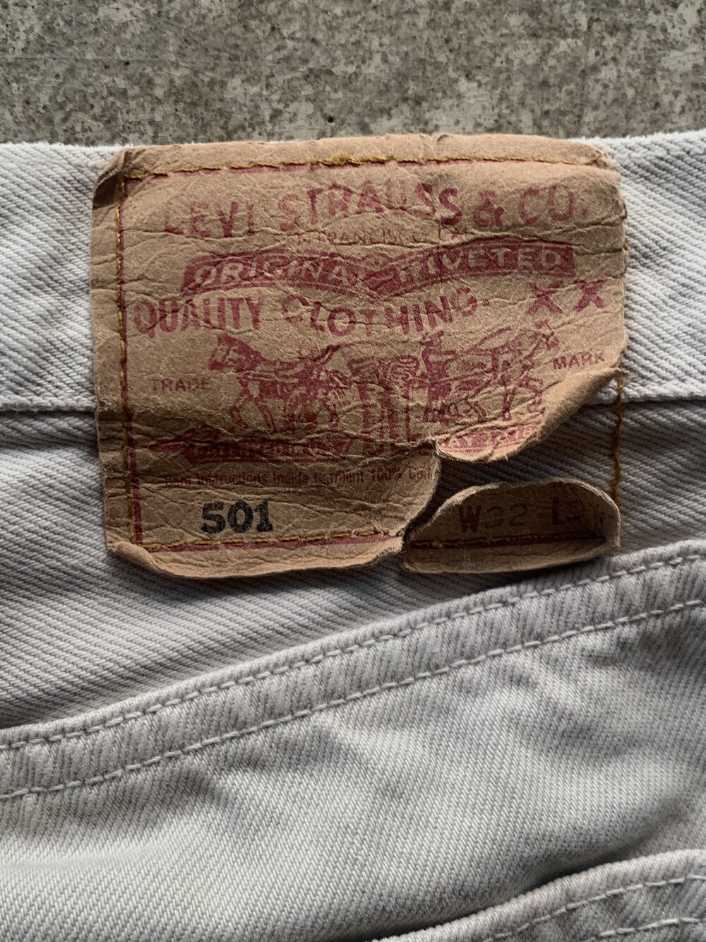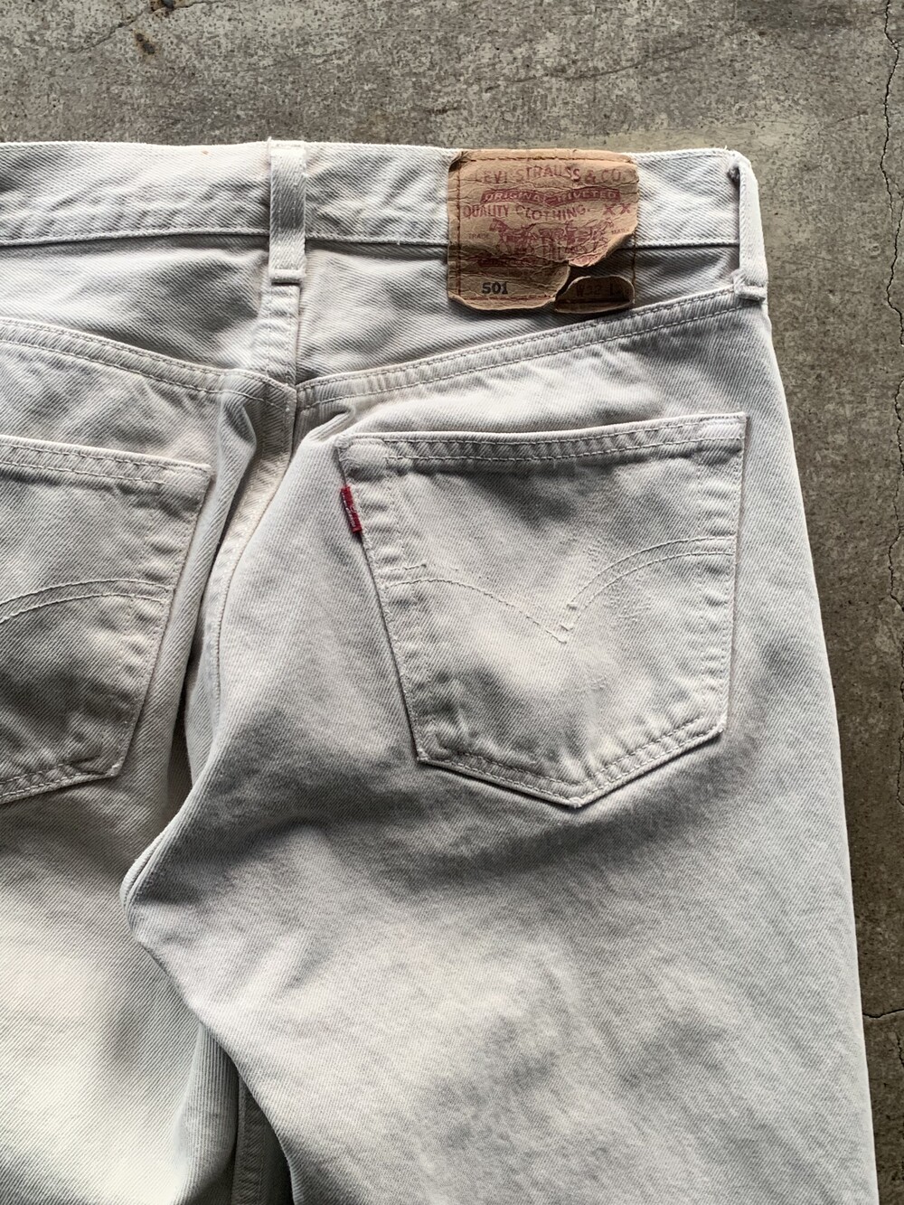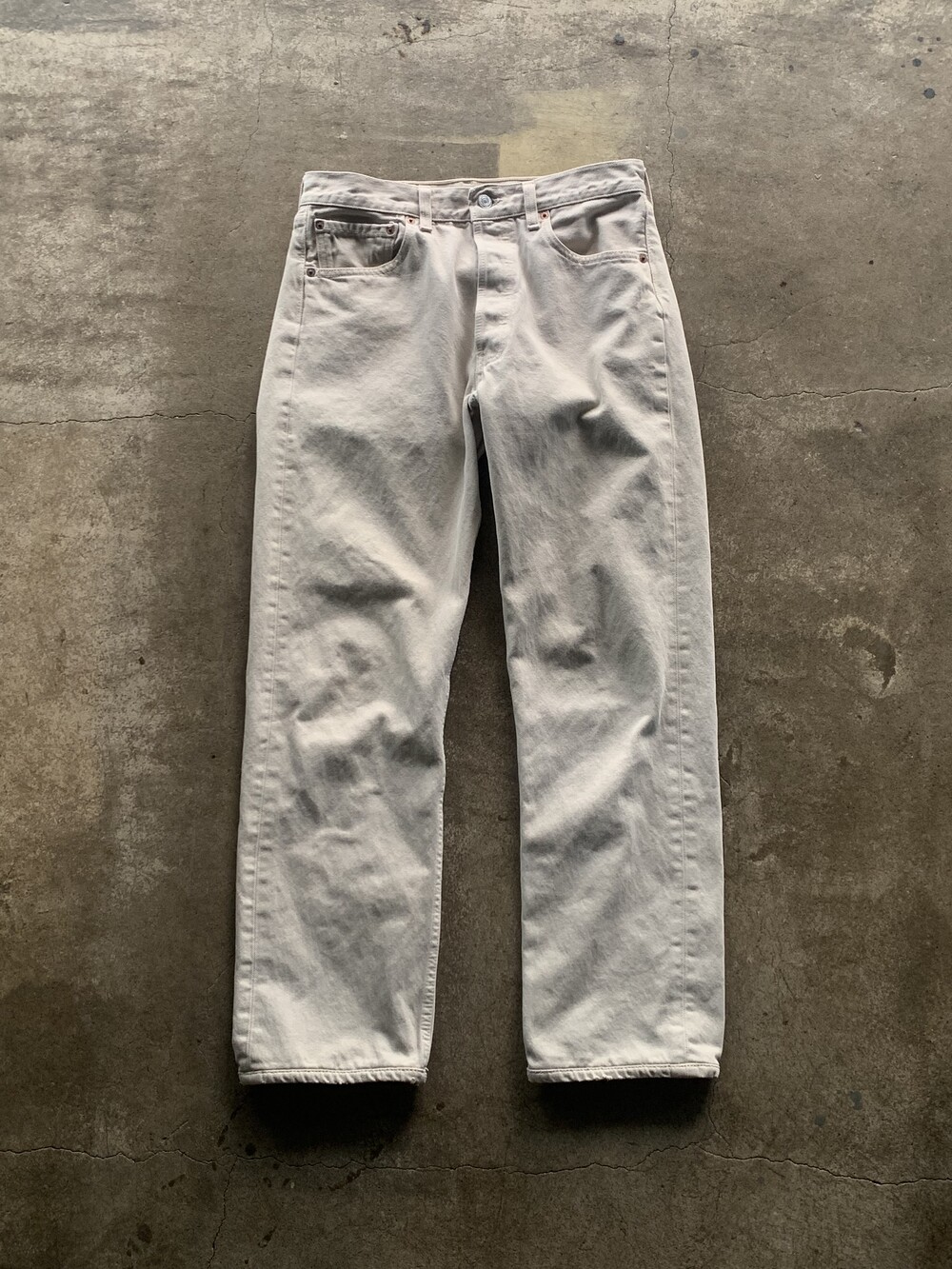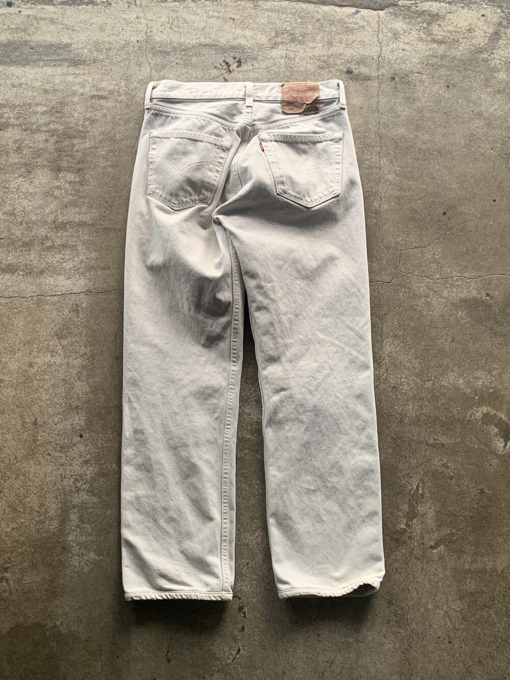 1997년 4월 미국 생산 501 데님팬츠입니다. 리바이스를 대표하는 버튼플라이 사양의 클래식한 슬림 스트레이트 실루엣의 팬츠로, 화이트 컬러보다는 부담없이 착용할 수 있는 오프화이트 컬러와 밑단 기장이 수선되었으나 501 특유의 슬림한 비례감을 유지하고 있는 제품입니다.