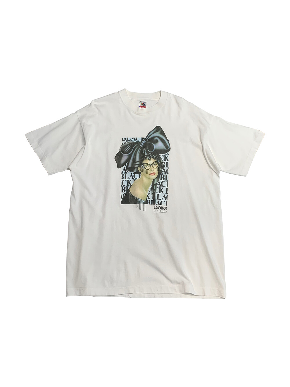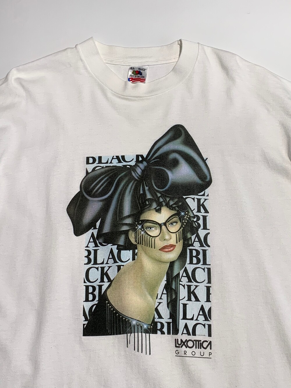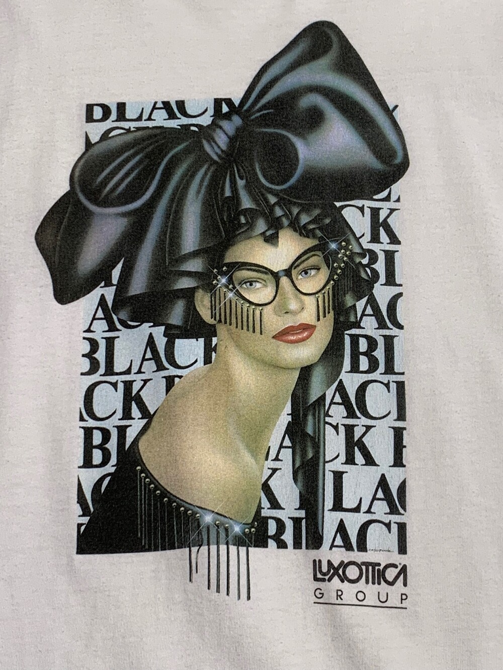 🚩Detail 이탈리아 아이웨어 브랜드이자 레이벤, 오클리같은 전문적인 아이웨어부터 하이엔드 브랜드의 아이웨어를 보유하고 있으며 최근에는 슈프림까지 인수하면서 의류 시장까지 넘보고 있는 브랜드 룩소티카(LUXOTTICA). 룩소티카에서 1980년대부터 1990년대 사이 매 해마다 출시했던 광고용 달력 중, 1992년에 발매된 달력에 실린 아트웍이 프린팅으로 올려진 티셔츠입니다. Paola Casagrande 라는 작가가 작업한, 아트웍으로 여성모델이 안경을 쓰고 그에 어울리는 전위적인 느낌의 장식이 가미된 일러스트 이미지 특유의 시크함이 돋보이는 제품입니다.