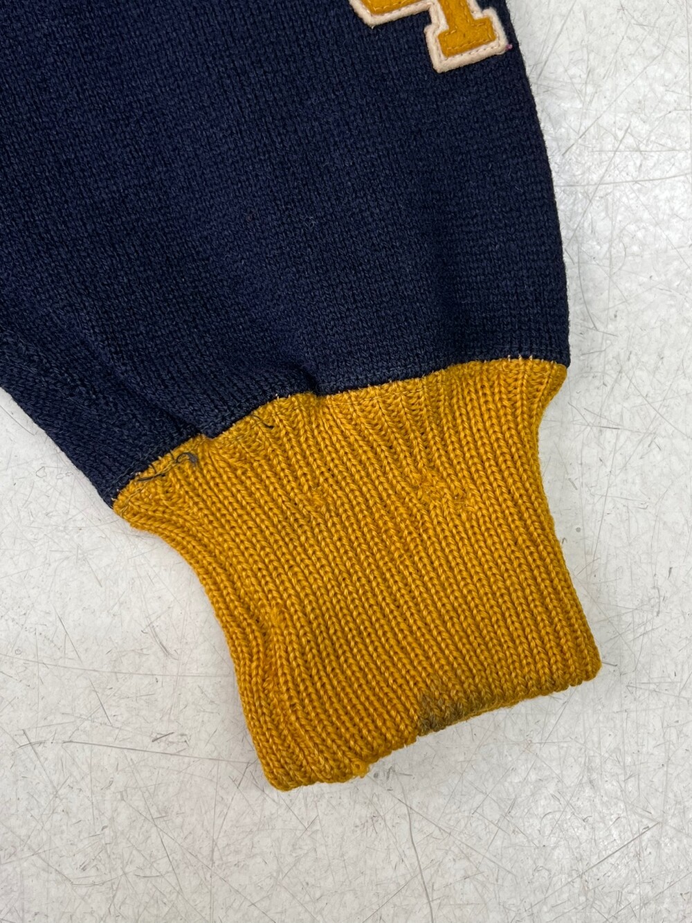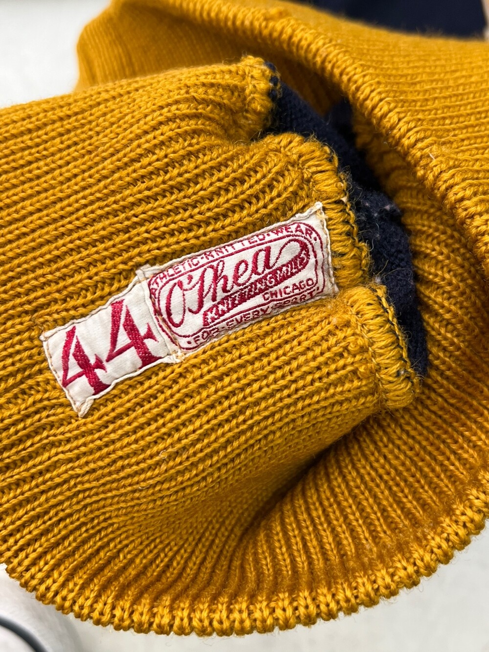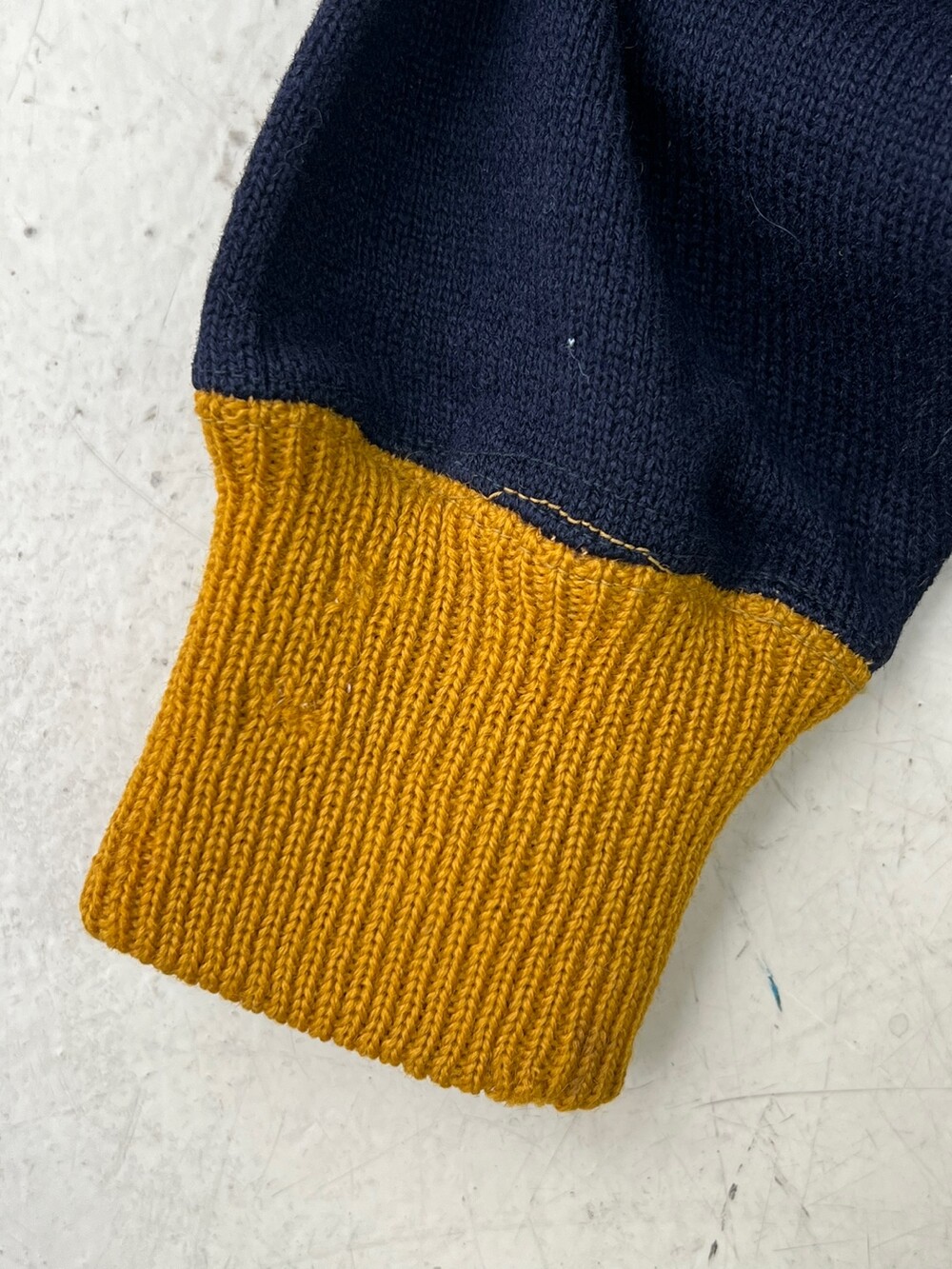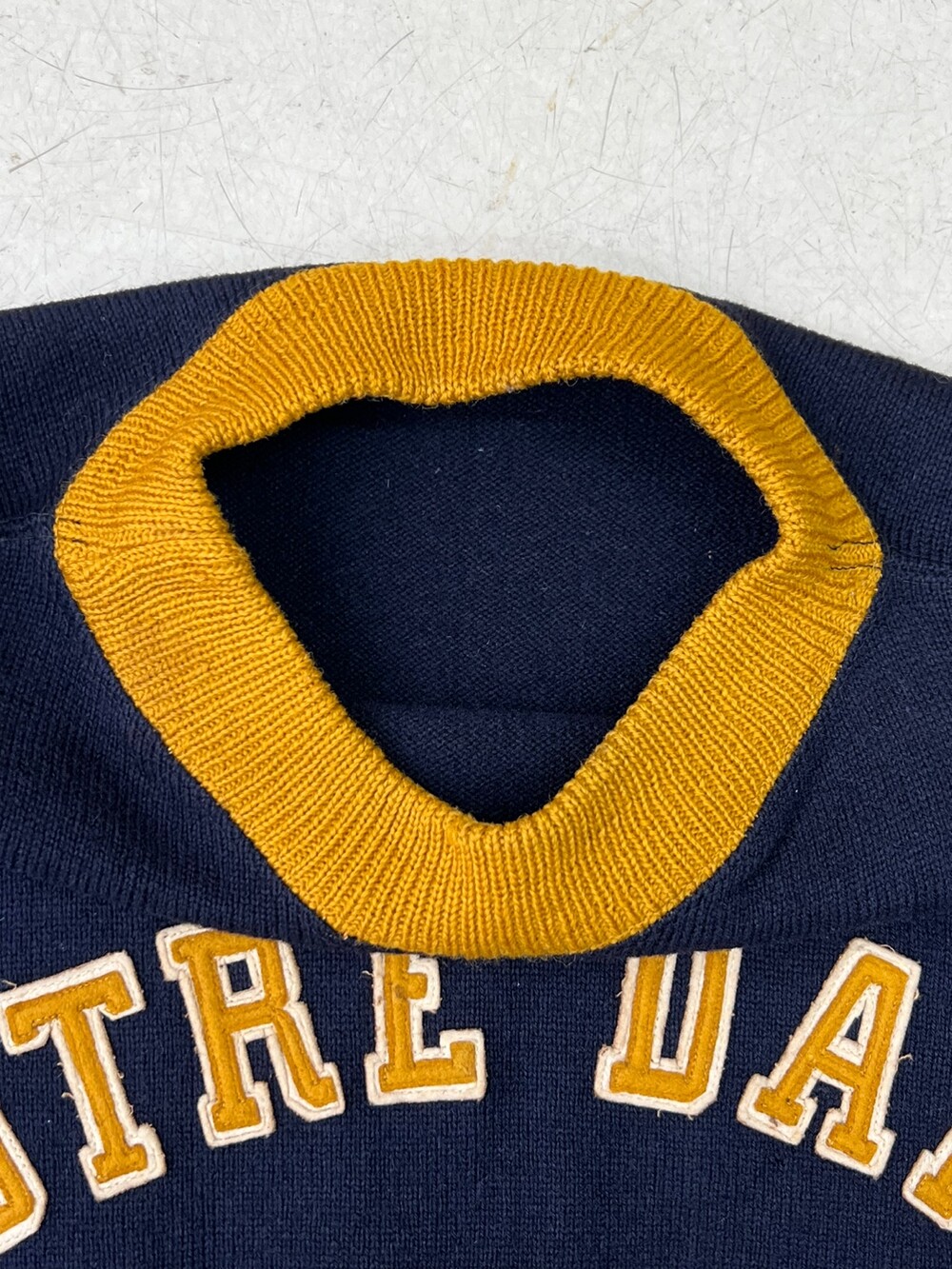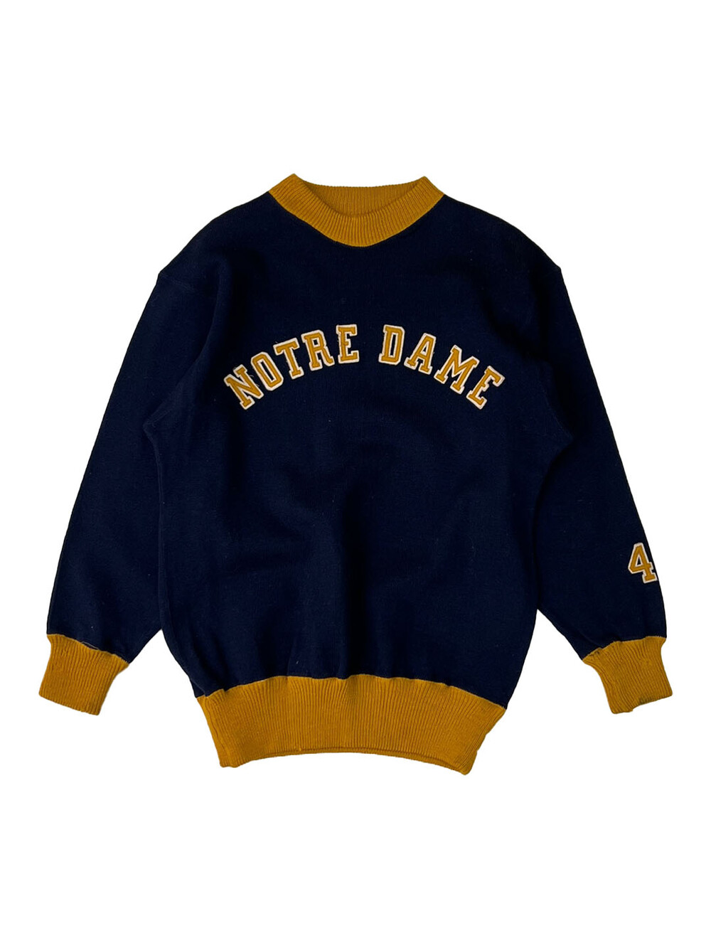 1930년대에서 1940년대 사이에 생산된 것으로 추정되는 울 소재의 스웻셔츠입니다. 크루넥이라 하기에는 살짝 넥라인이 올라오는 형태로, 노터데임 대학교를 대표하는 네이비+엘로우의 클래식한 배색 조합에 표기 44의 제법 넉넉한 사이즈로, 연식에 비해서는 여러모로 접근성이 좋은 제품입니다.