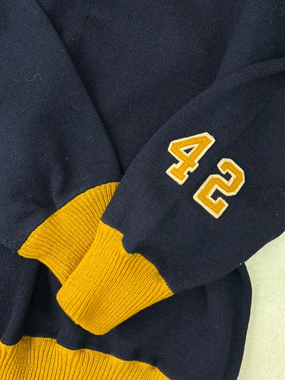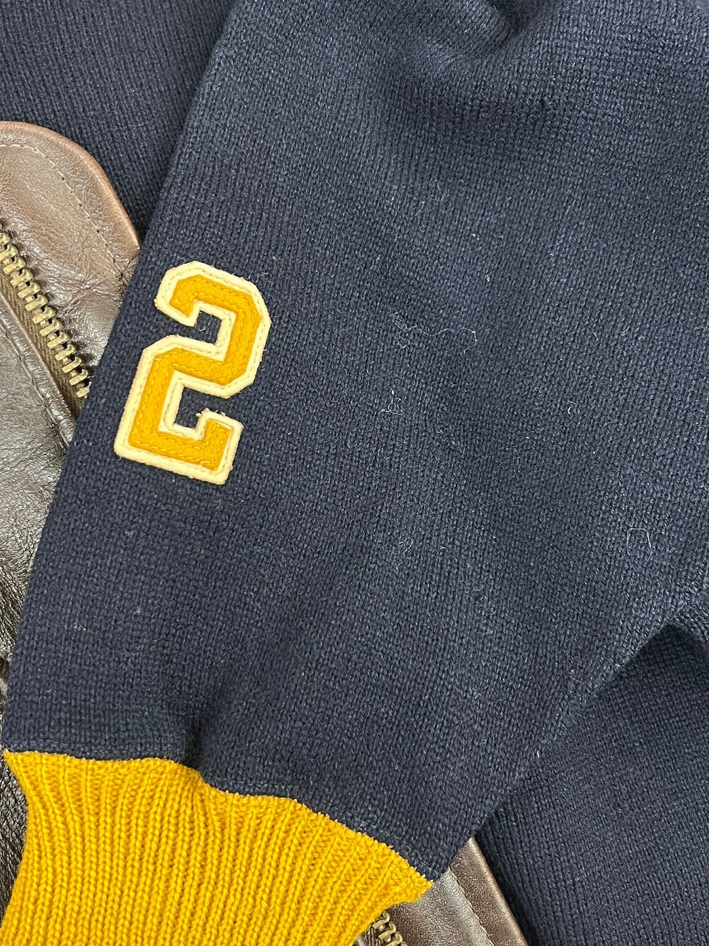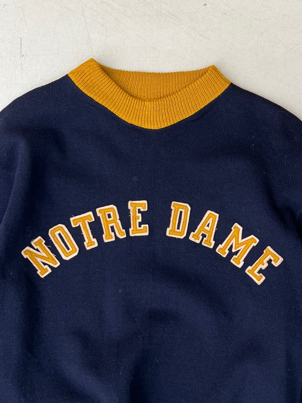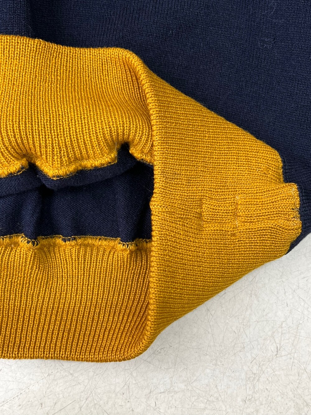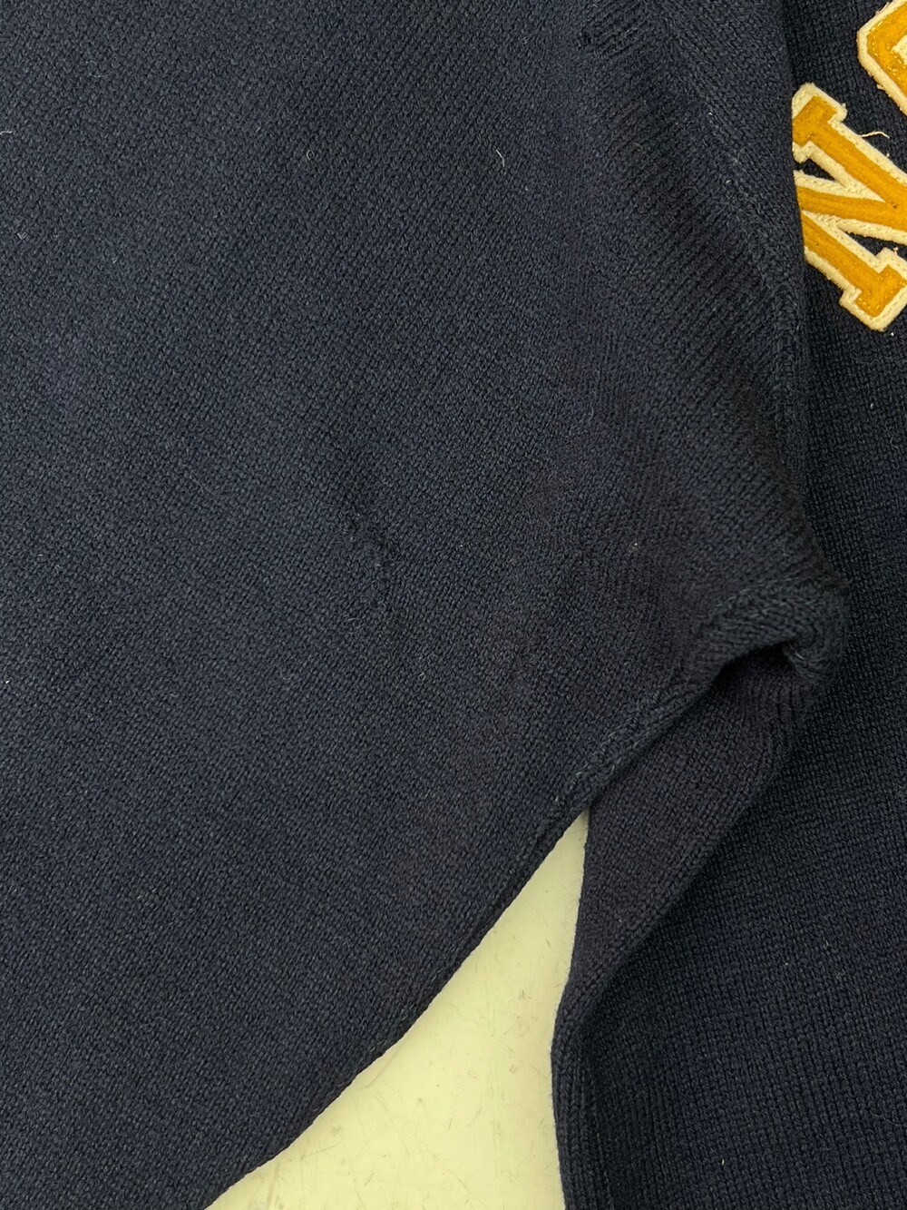 1930년대에서 1940년대 사이에 생산된 것으로 추정되는 울 소재의 스웻셔츠입니다. 크루넥이라 하기에는 살짝 넥라인이 올라오는 형태로, 노터데임 대학교를 대표하는 네이비+엘로우의 클래식한 배색 조합에 표기 44의 제법 넉넉한 사이즈로, 연식에 비해서는 여러모로 접근성이 좋은 제품입니다.