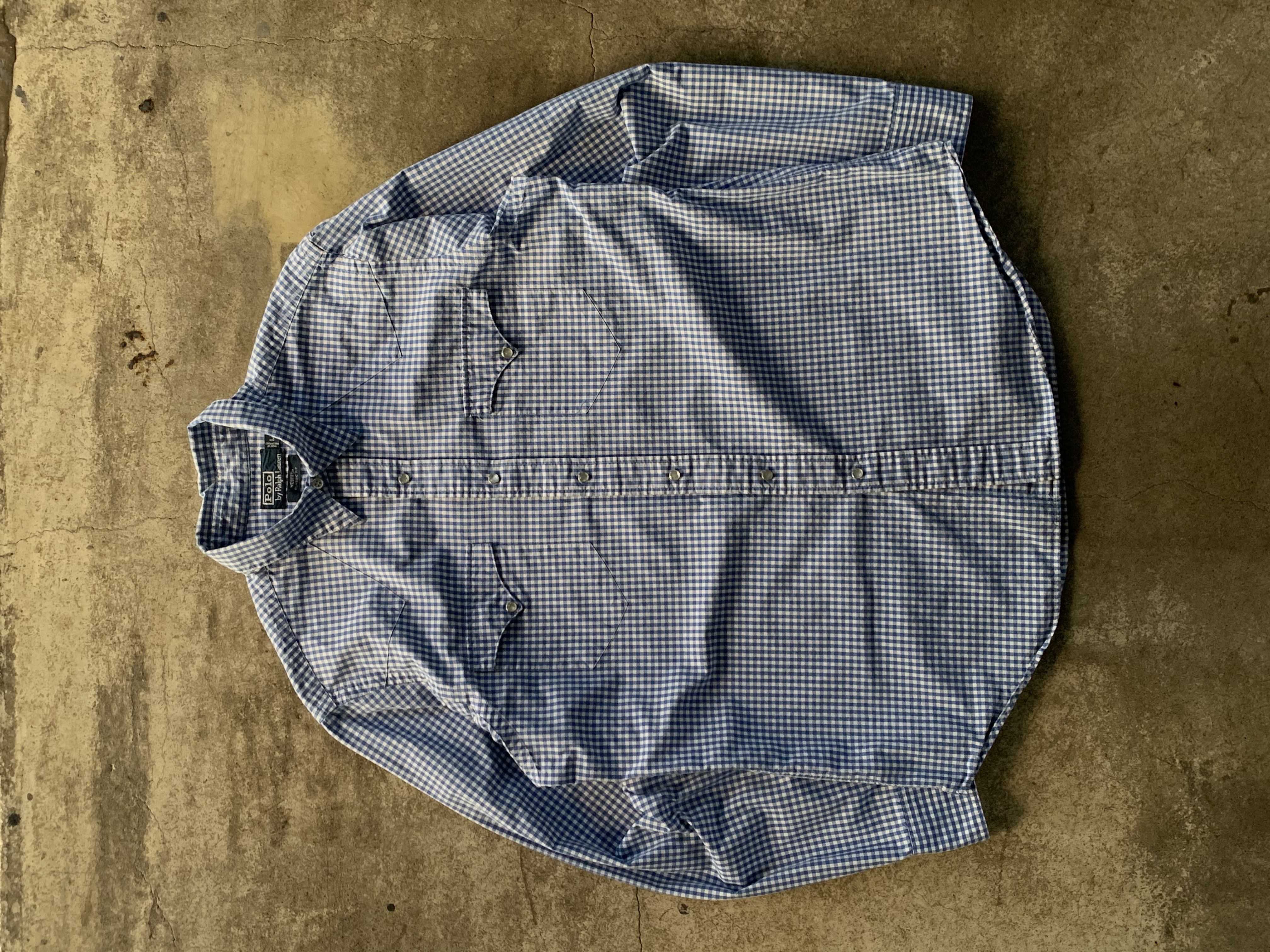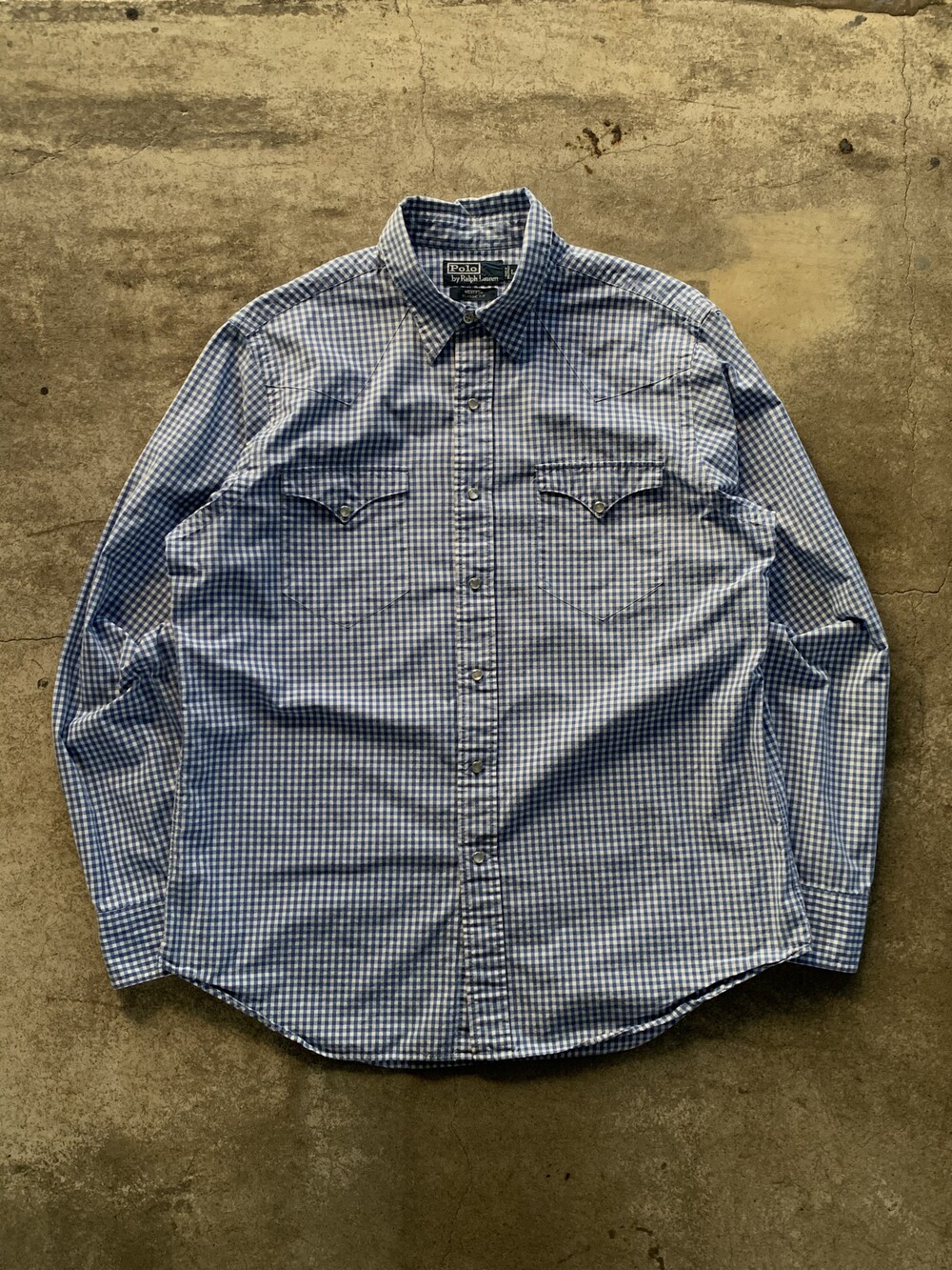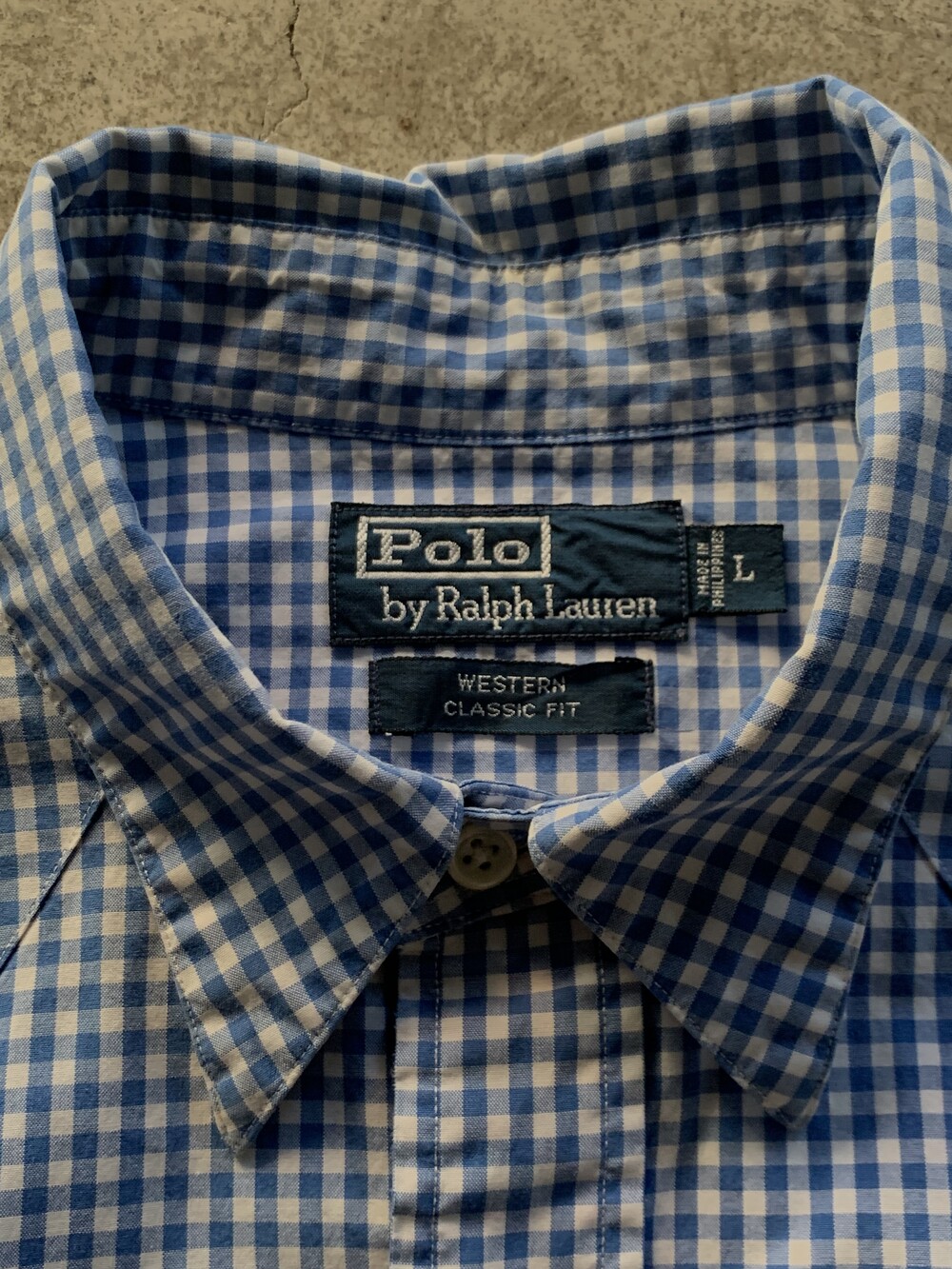 표기 대비 여유로운 사이즈, 렌치웨어 브랜드의 웨스턴 셔츠에 비해 짧은 칼라 길이, 깅엄체크 패턴이 적용되어 전반적으로 캐주얼한 분위기의 폴로 랄프로렌 웨스턴 셔츠. 데님 혹은 치노팬츠에 턱인하여 매치하면 좋을만한 제품입니다.