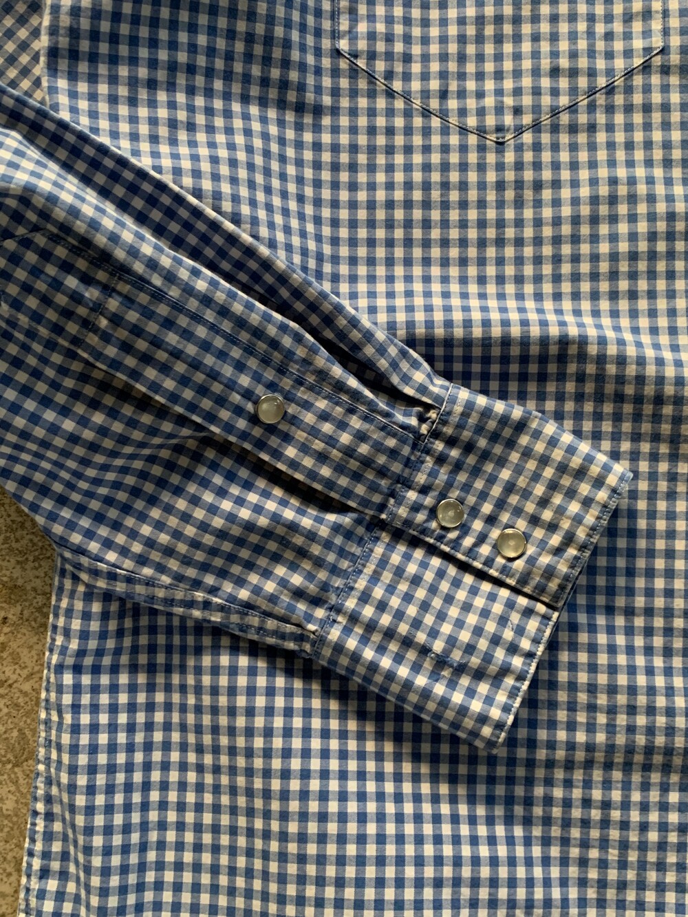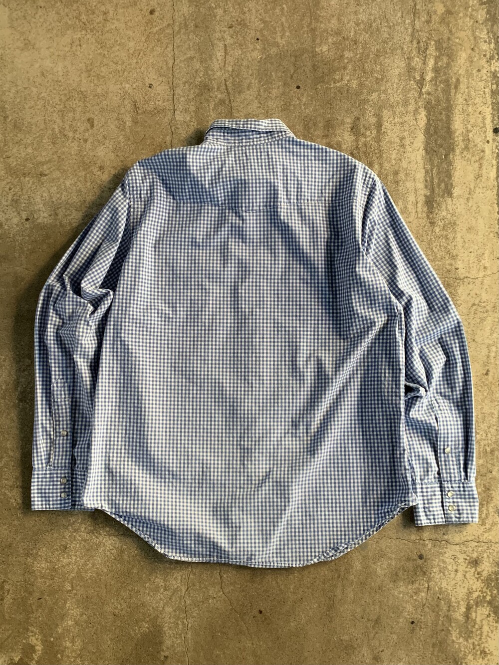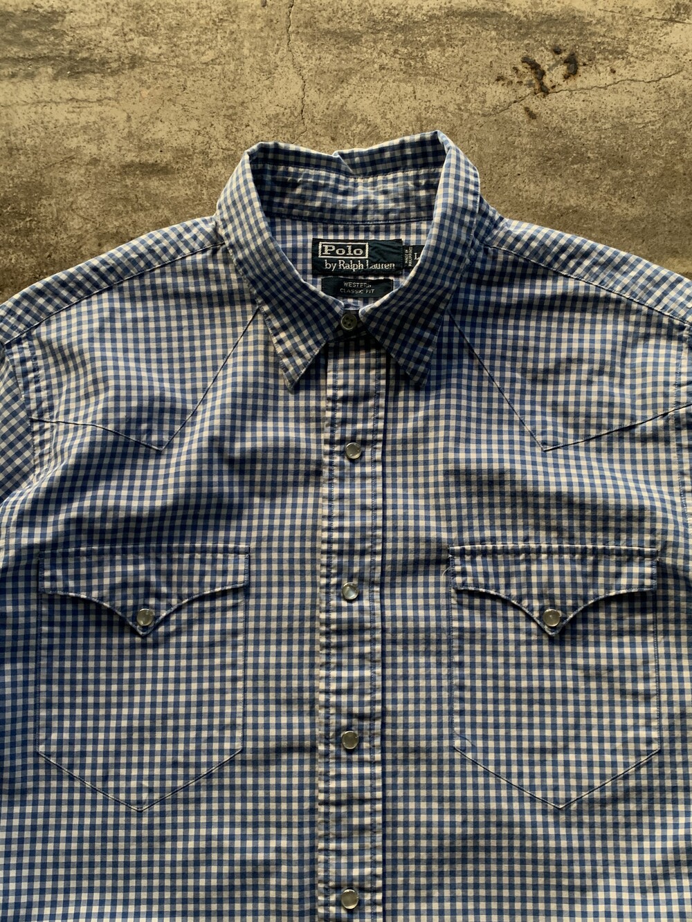 표기 대비 여유로운 사이즈, 렌치웨어 브랜드의 웨스턴 셔츠에 비해 짧은 칼라 길이, 깅엄체크 패턴이 적용되어 전반적으로 캐주얼한 분위기의 폴로 랄프로렌 웨스턴 셔츠. 데님 혹은 치노팬츠에 턱인하여 매치하면 좋을만한 제품입니다.