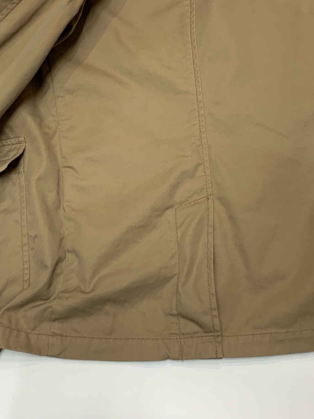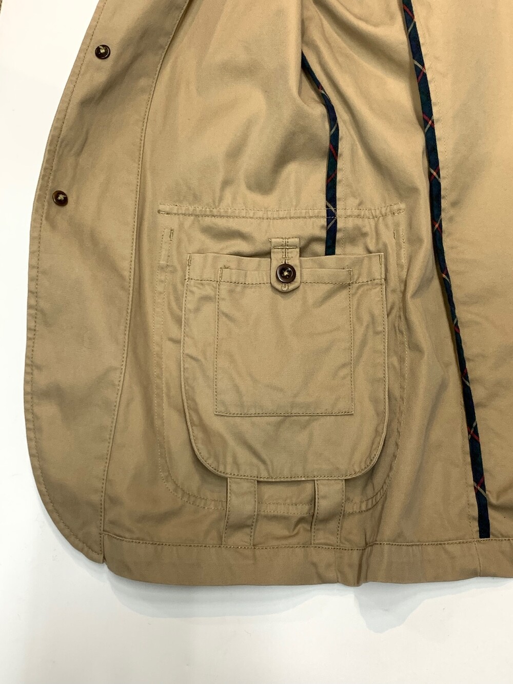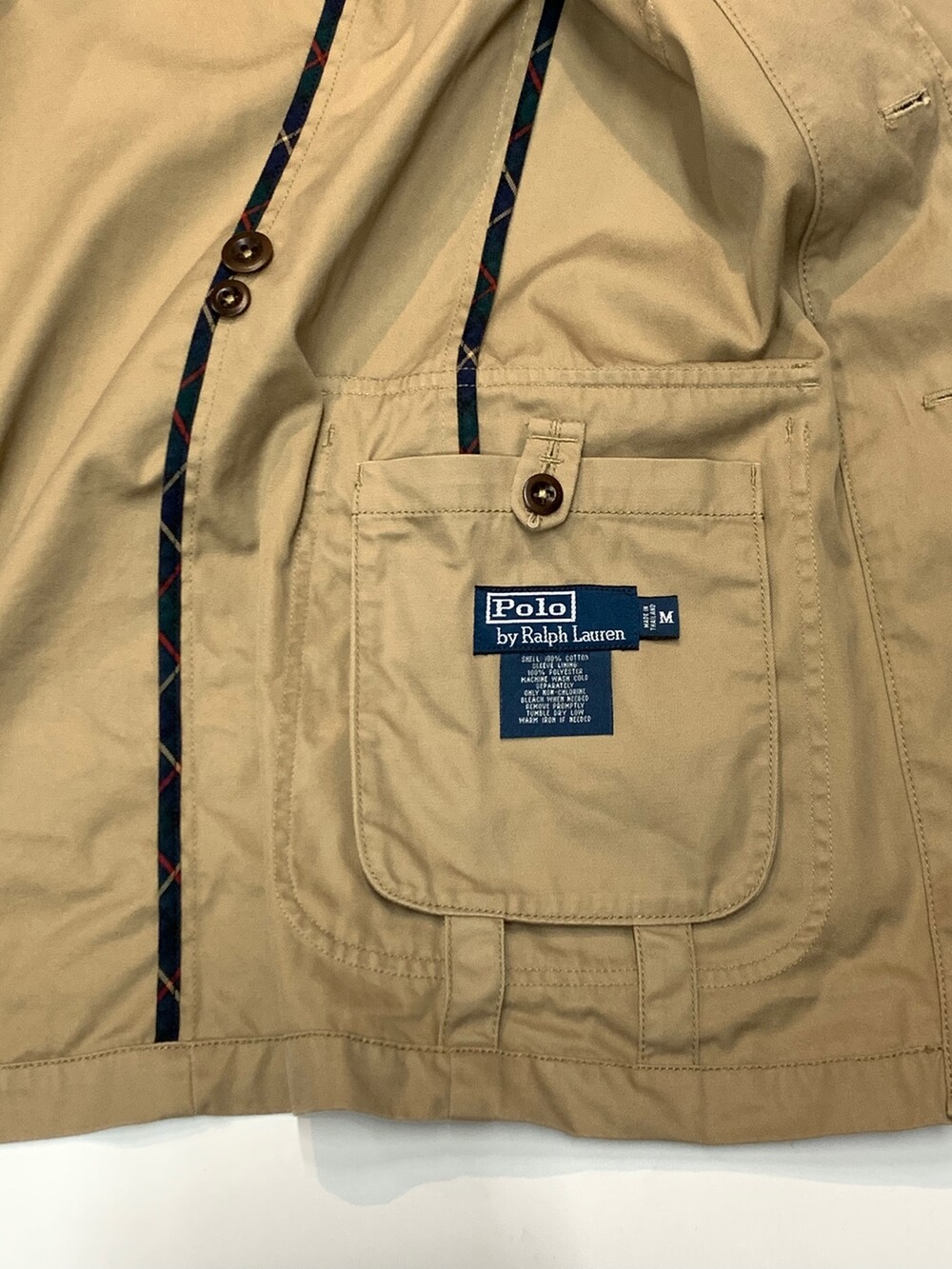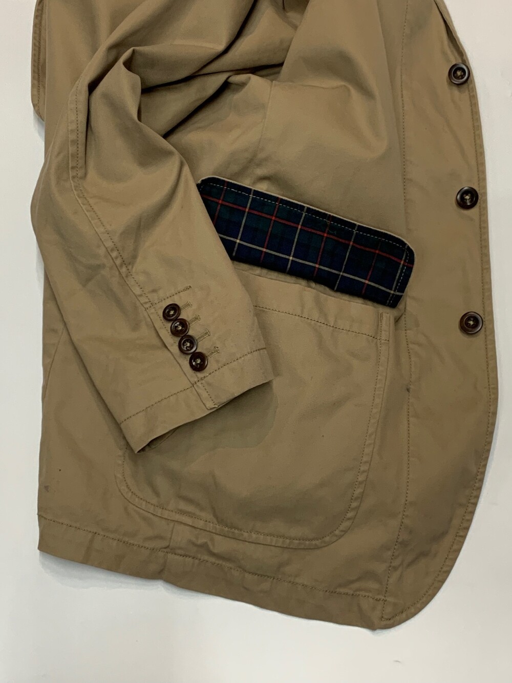 얇은 노치드 라펠, 스티치가 보이는 아웃포켓, 센터벤트 등 전형적인 미국식 3버튼 타입 스포츠 자켓. 나열된 디테일만 보더라도 타이를 매기보다는 심플한 티셔츠에 데님팬츠 혹은 셔츠와 반바지 조합에 어울릴만한 캐주얼한 성격의 스포츠 자켓입니다. 직접적으로 보이지 않는 넥라인 뒤쪽과 포켓 플랩 안쪽 부분에 네이비와 그린 컬러가 주된 플래드 체크 패턴이 덧대어져 있으며, 자켓 하단부 안쪽 포켓 디테일이 돋보이는 제품입니다.
