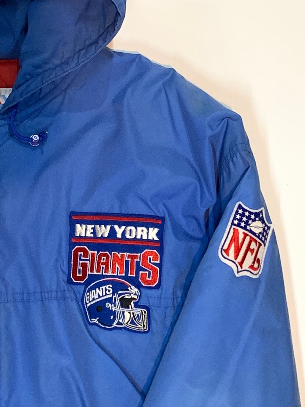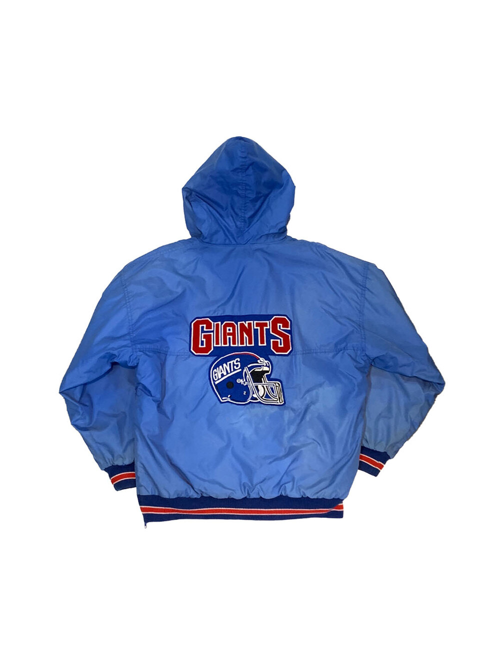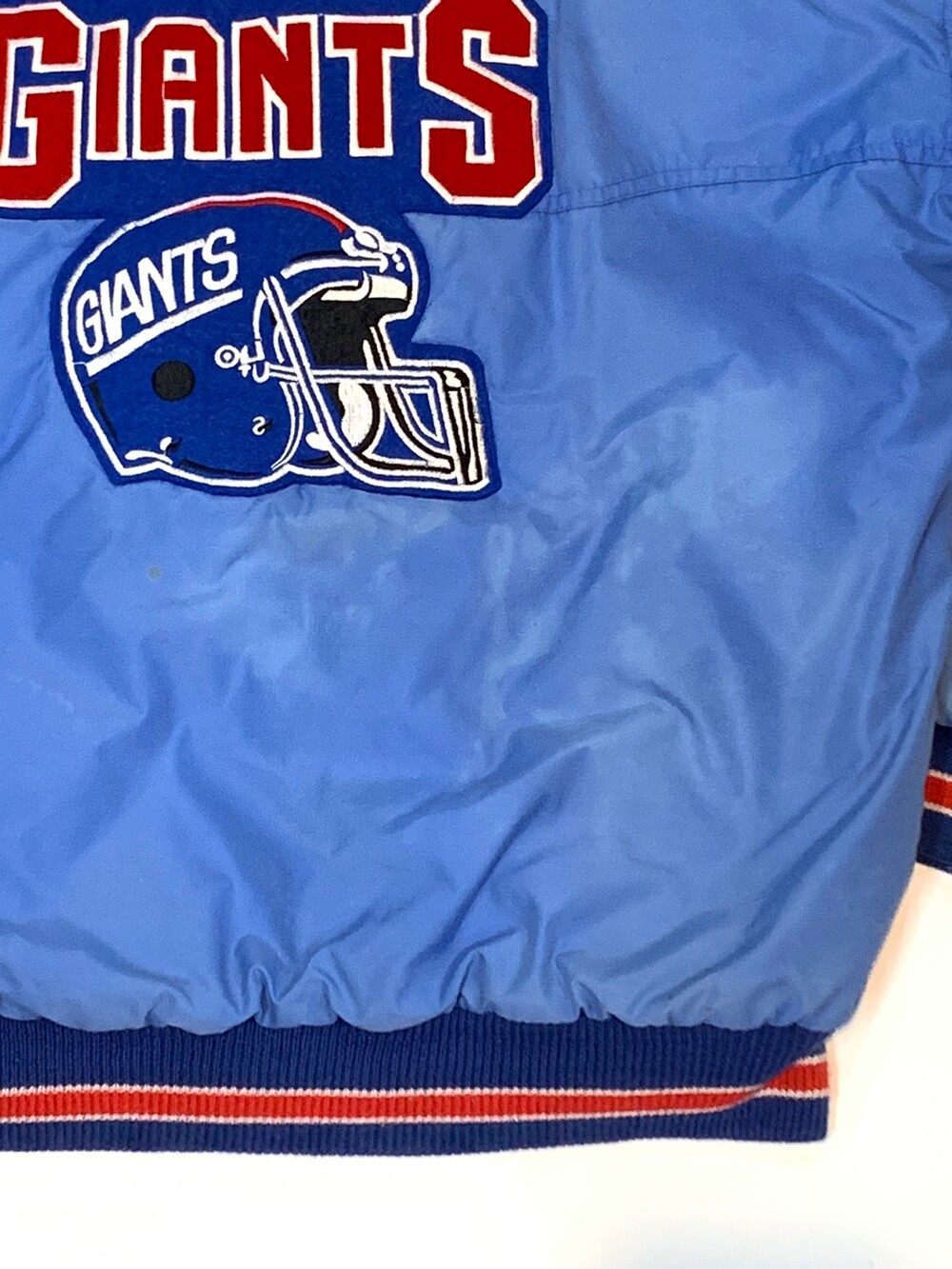 🚩Detail 1980년대부터 1990년대까지 스타터의 브랜드파워가 대단했다고는 하지만 그 인기에 비하면 동시대에 카피 혹은 부틀렉 제품의 존재를 찾을 수가 없었습니다. 당시 생산 단가에 비해 리테일 가격이 높은 옷이 아니라서 굳이 애써서 가품을 생산할 필요가 없었을 터인데, 그런 의미에서 상당히 보기 드문 스타터의 부틀넥(Bootleg) 나일론 자켓입니다. 뉴욕 자이언츠를 대표하는 레드 &블루 배색이 들어간 제품으로, 라이센스드 프로덕트와는 달리 전후면 워드마크 디자인을 그대로 사용하지 않고 변형한 것으로 보입니다.
