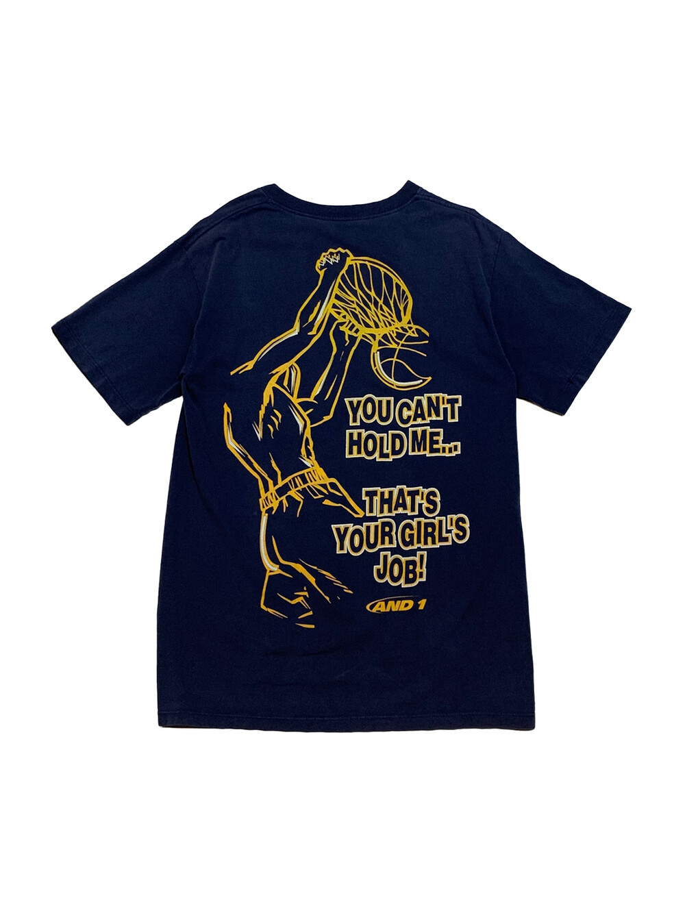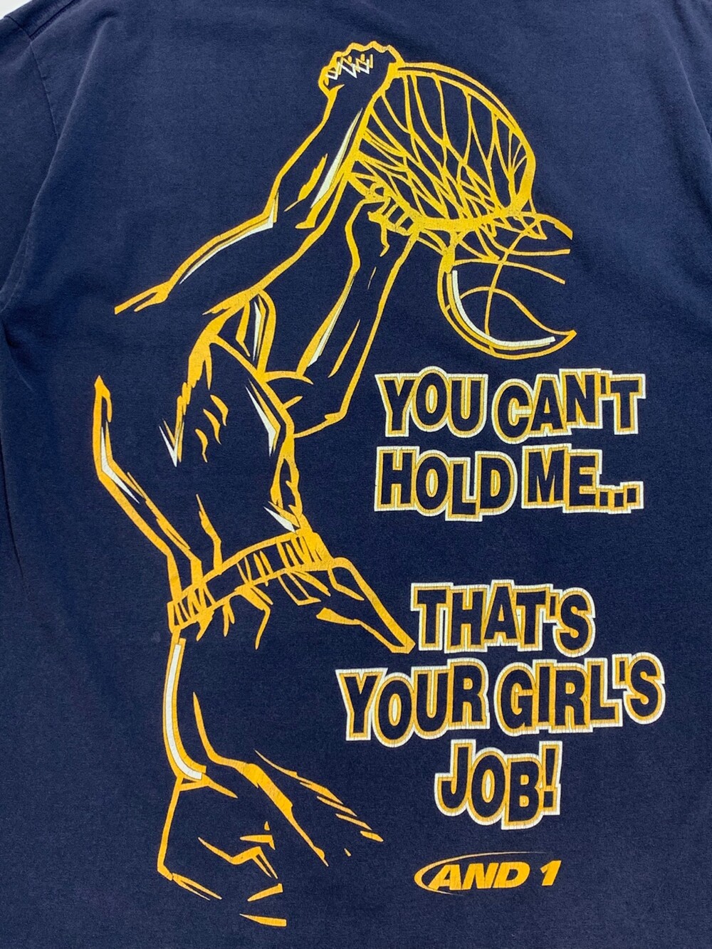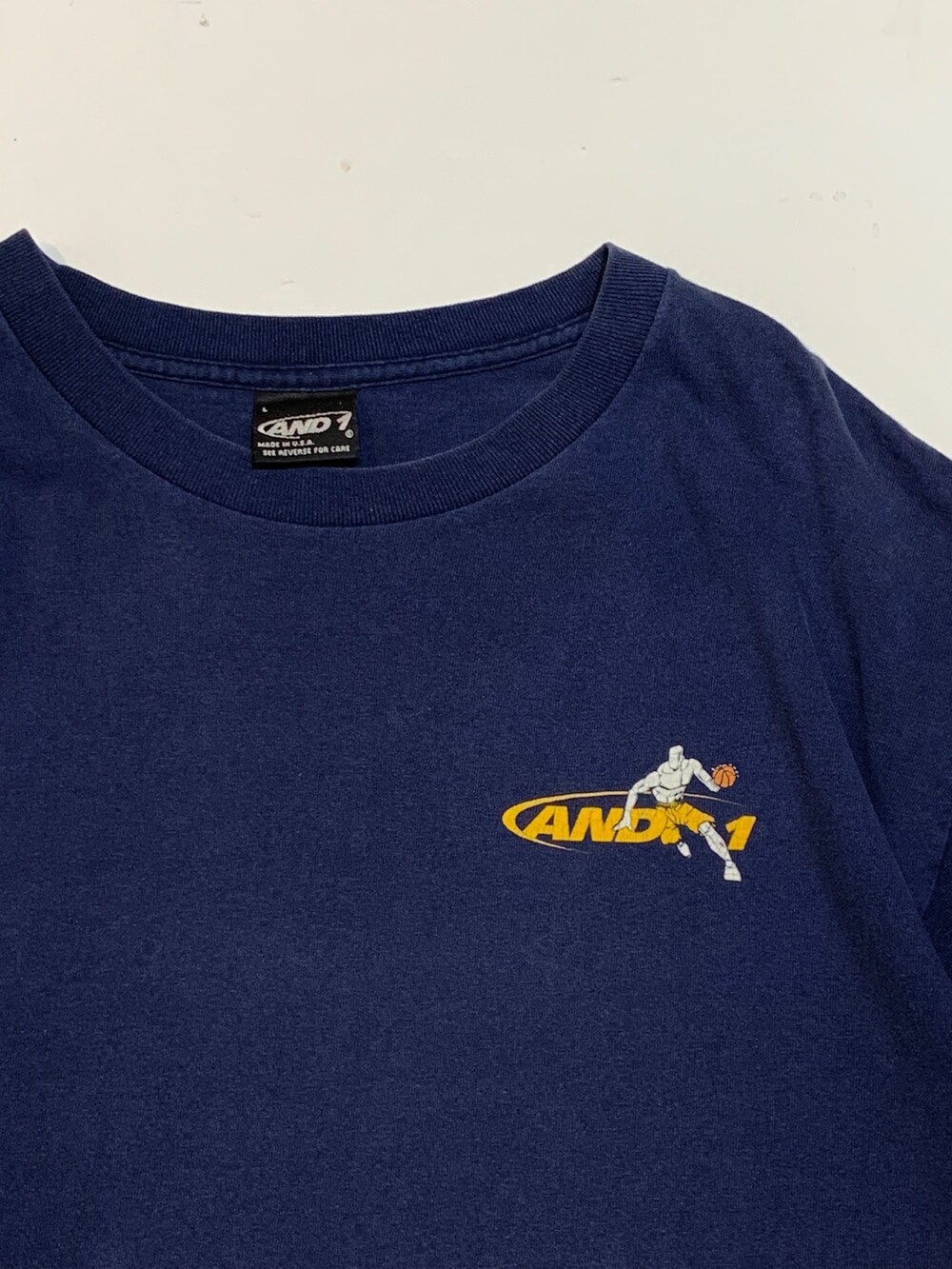 저화질 스트릿볼러 영상에 음악을 입힌 믹스테잎 발매를 기점으로, 바스켓 기어보다는 스트릿 바스켓볼 특유의 멋에 초점을 맞추어 브랜드를 전개했던 앤드원(AND1)의 반팔 티셔츠. 1990년대에서 2000년대 초반 사이에 생산된 제품으로, 전면에는 앤드원 로고, 후면에는 도발적인 내용의 문고와 역동적인 그림체의 덩크맨 프린팅이 올려져 있는 스포티한 분위기의 제품입니다.