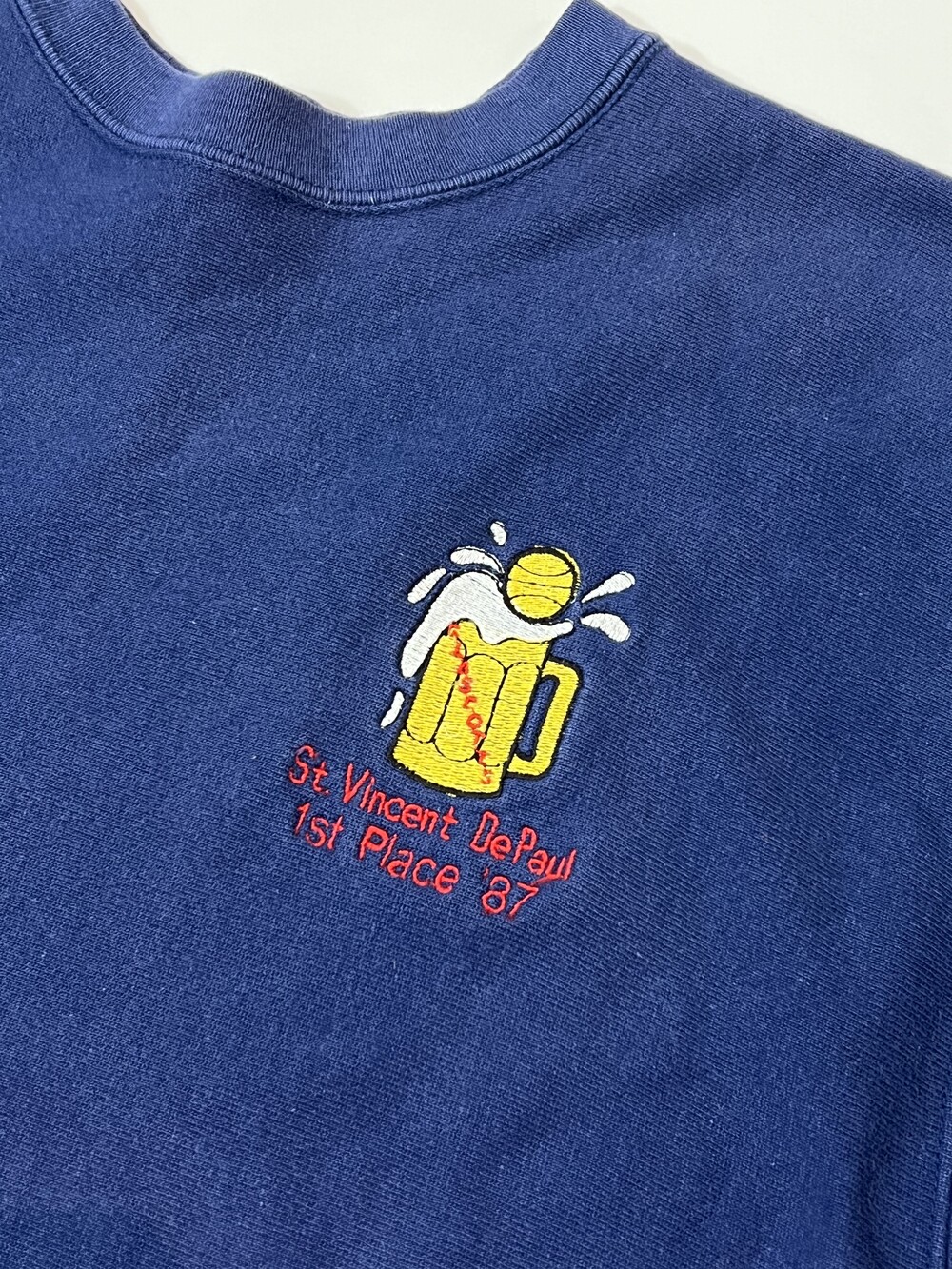 미국 캘리포니아 주에 위치한 카톨릭 계열 사립 학교 세인트 빈센트 데 폴 하이스쿨(St.Vincent DePaul Highschool) 바시티 팀 농구부가 1987년 리그에서 1위를 차지한 시즌을 기념하는 내용의 자수가 올려진 리버스위브 스웻셔츠. 1980년대 리버스위브 스웻에서 주로 보이는 너비가 넓고 텐션이 다소 약한 립의 형태로 오버사이징하여 루즈하게 착용하기 좋을 제품입니다.