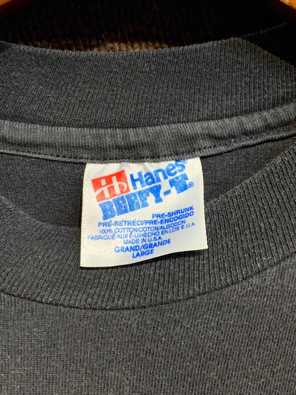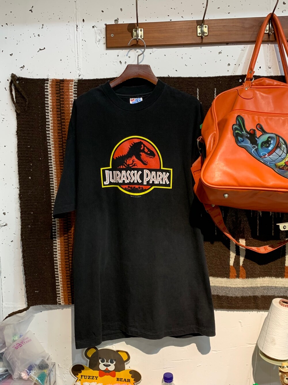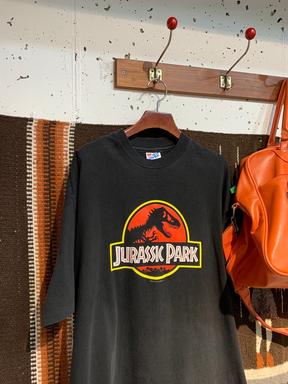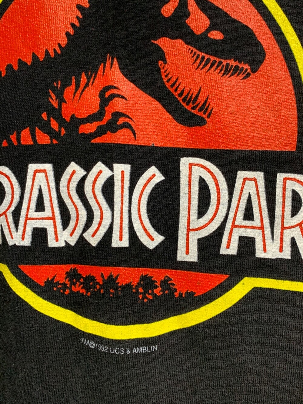 1992년부터 촬영하여 1993년 7월에 개봉한 스티븐 스필버그의 대표작이자 사이언스 픽션(SF) 장르 중에서도 공룡을 다룬 대표적인 시리즈인 주라기공원(JURRASIC PARK) 프로모션 프린팅이 올려진 티셔츠.