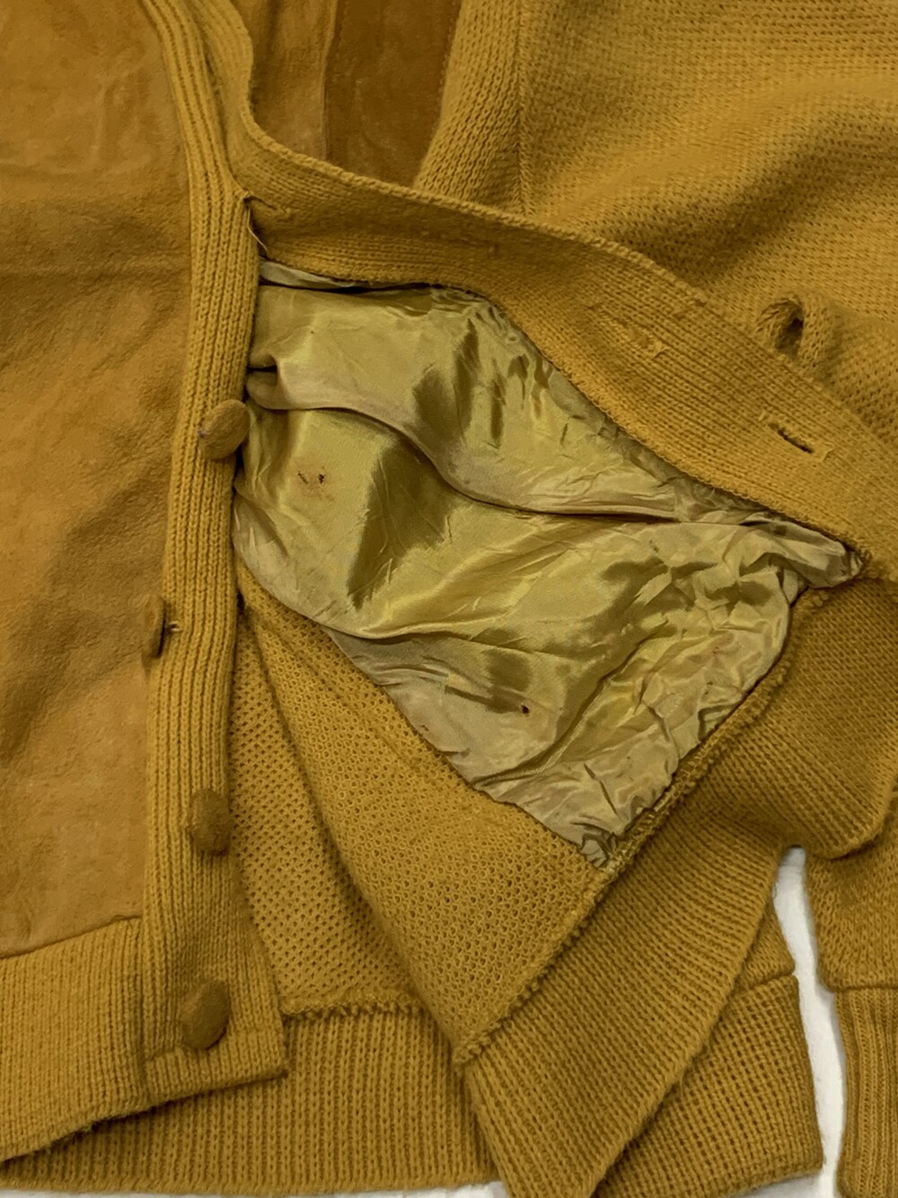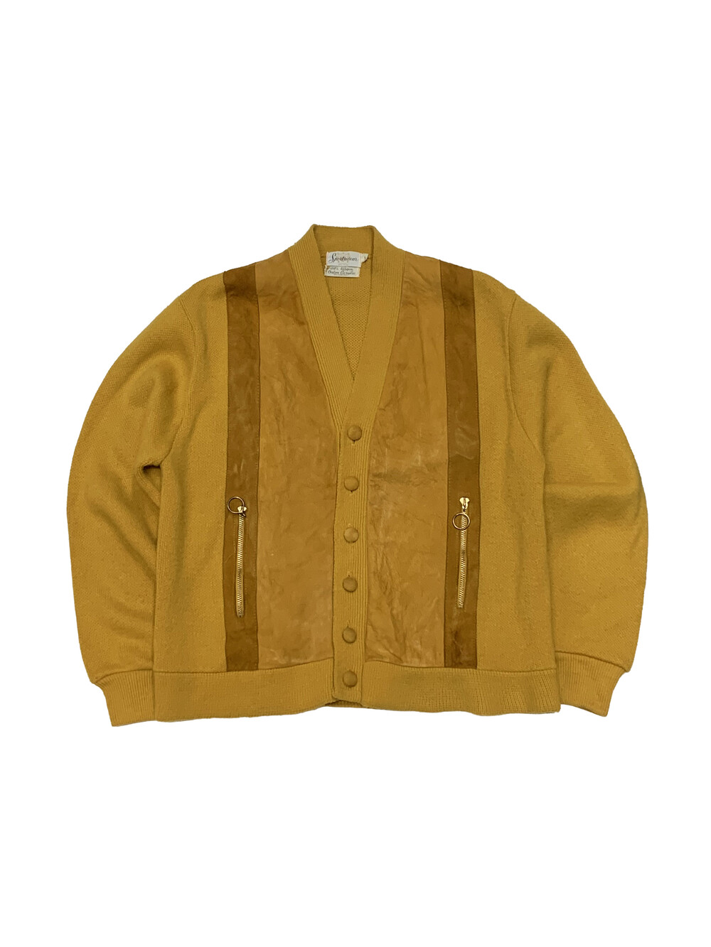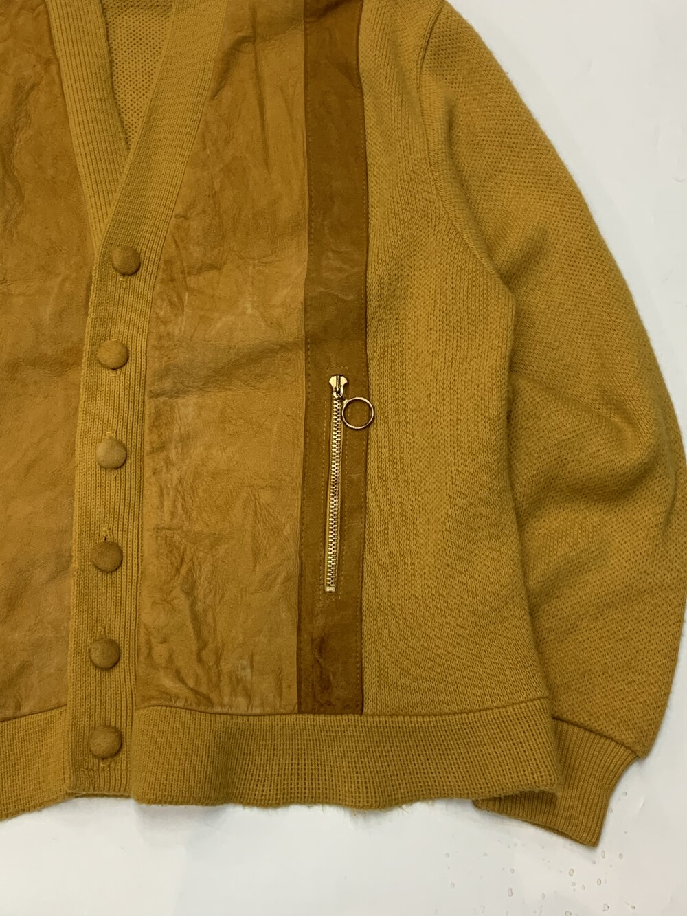 아크릴 소재 카디건 전면에 가죽 패널이 붙어 두 가지 이상의 소재가 한 데 뒤섞인, 1960년대에서 1970년대 사이에 생산된 것으로 추정되는 스위칭 카디건입니다. 전면에 가죽이 붙다보니 기존의 아크릴 가디건에 비해 원단 두께감이 있는 편이며, 패널 디자인과 원형 지퍼그립이 돋보이는 제품입니다.