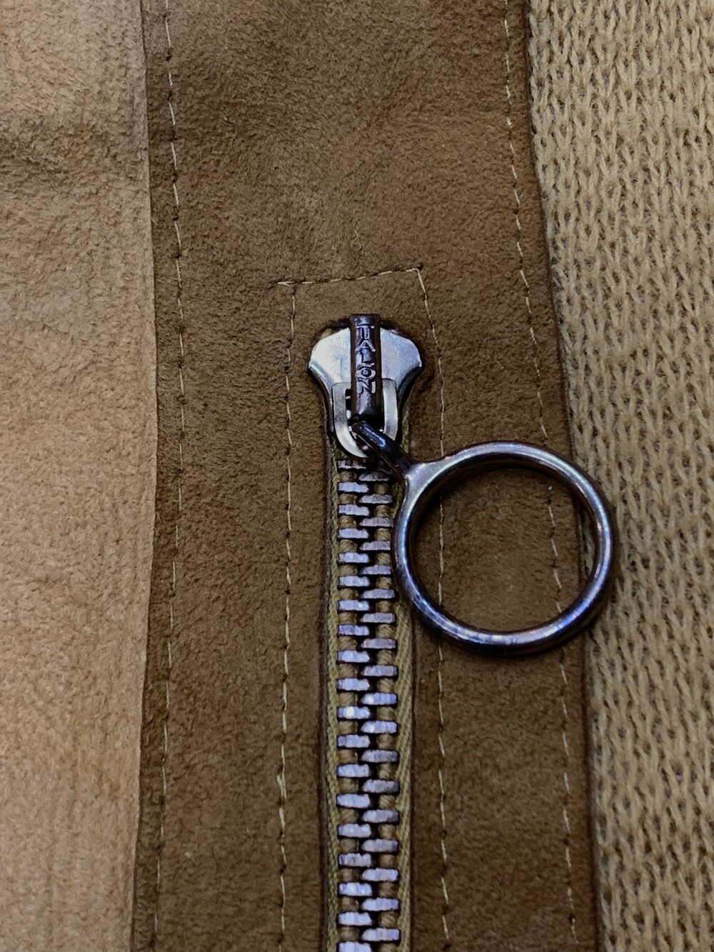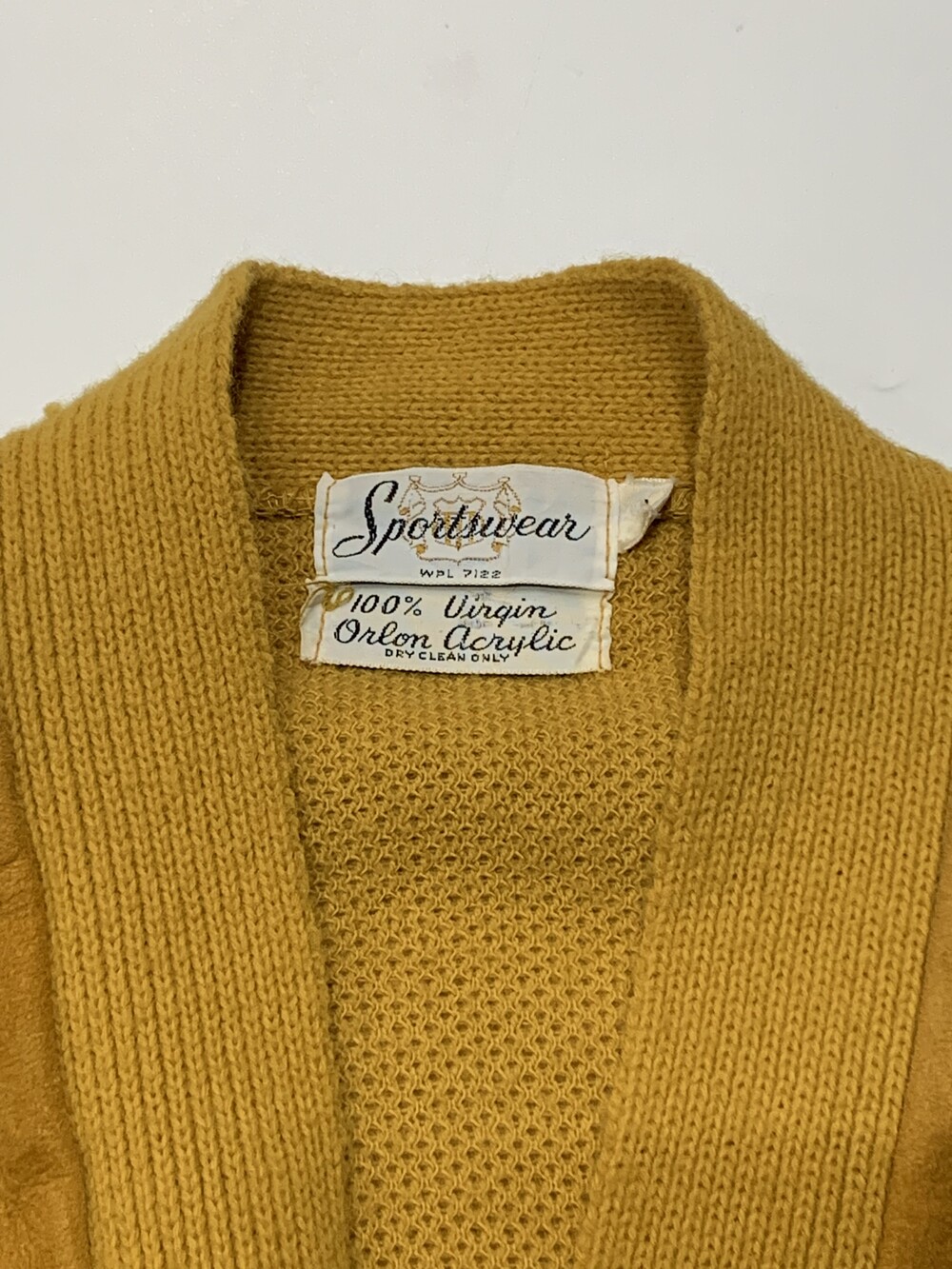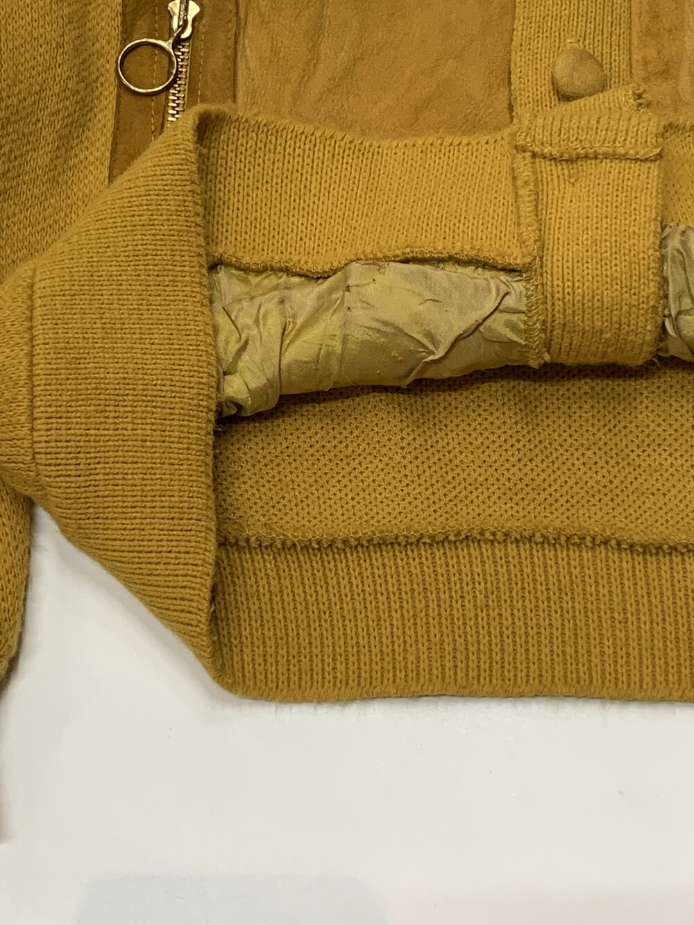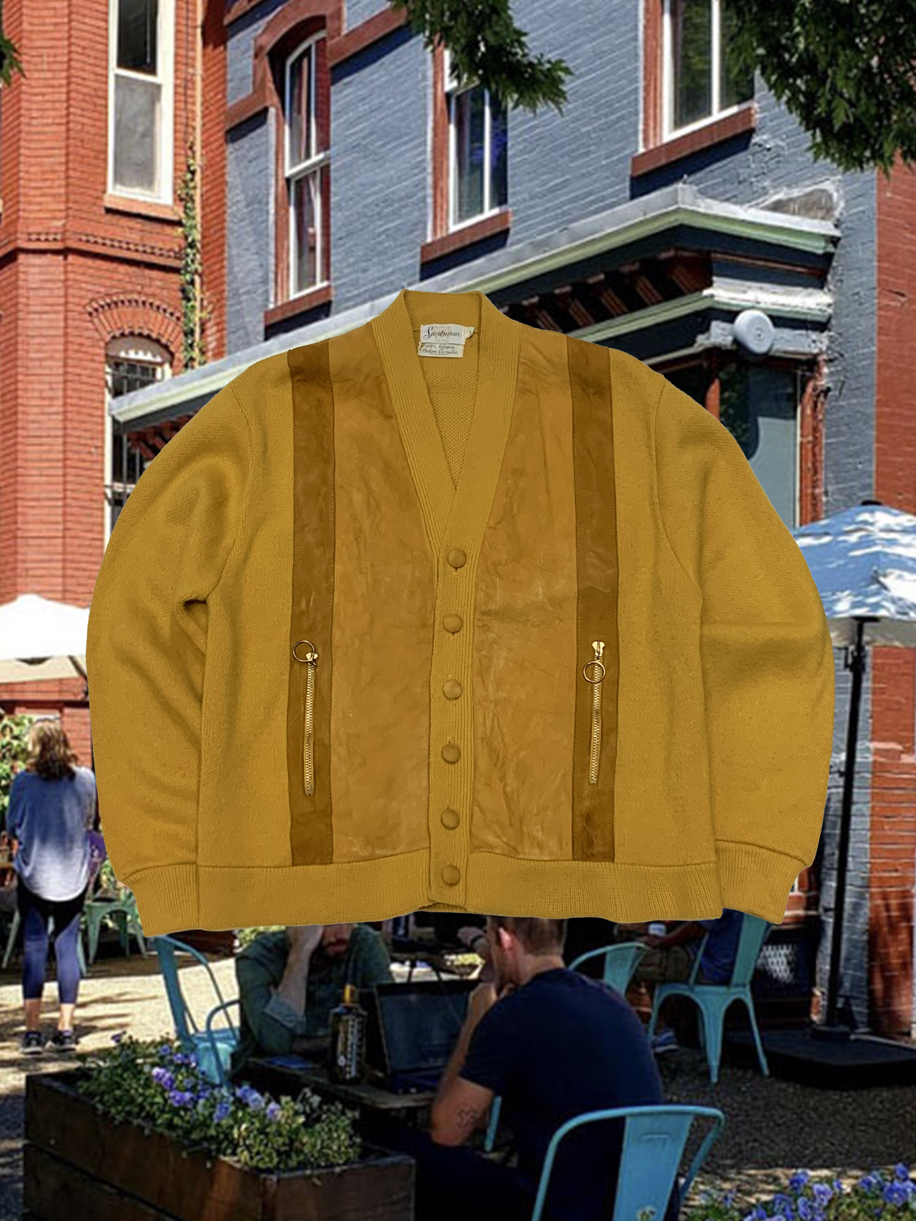 아크릴 소재 카디건 전면에 가죽 패널이 붙어 두 가지 이상의 소재가 한 데 뒤섞인, 1960년대에서 1970년대 사이에 생산된 것으로 추정되는 스위칭 카디건입니다. 전면에 가죽이 붙다보니 기존의 아크릴 가디건에 비해 원단 두께감이 있는 편이며, 패널 디자인과 원형 지퍼그립이 돋보이는 제품입니다.