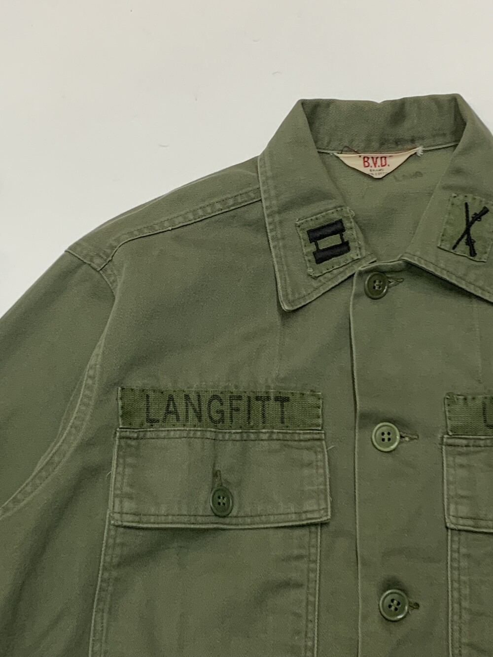 전반적으로 직선적인 실루엣과 포켓 디자인 그리고 소매 버튼클로징 디테일이 없는 초기형 유틸리티 셔츠. 독특하게도 스포츠웨어 및 이너웨어 브랜드 BVD 택이 붙은 제품으로, 보급용 피복류와 사양 자체는 유사하나 PX 혹은 부대 외 군장점에서 판매하는 일종의 사제품이라 할 수 있습니다.