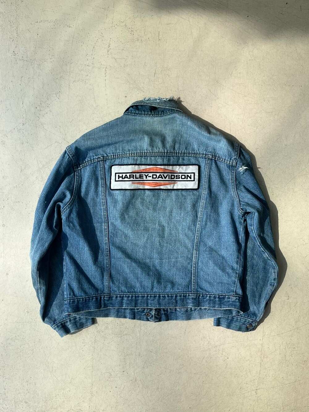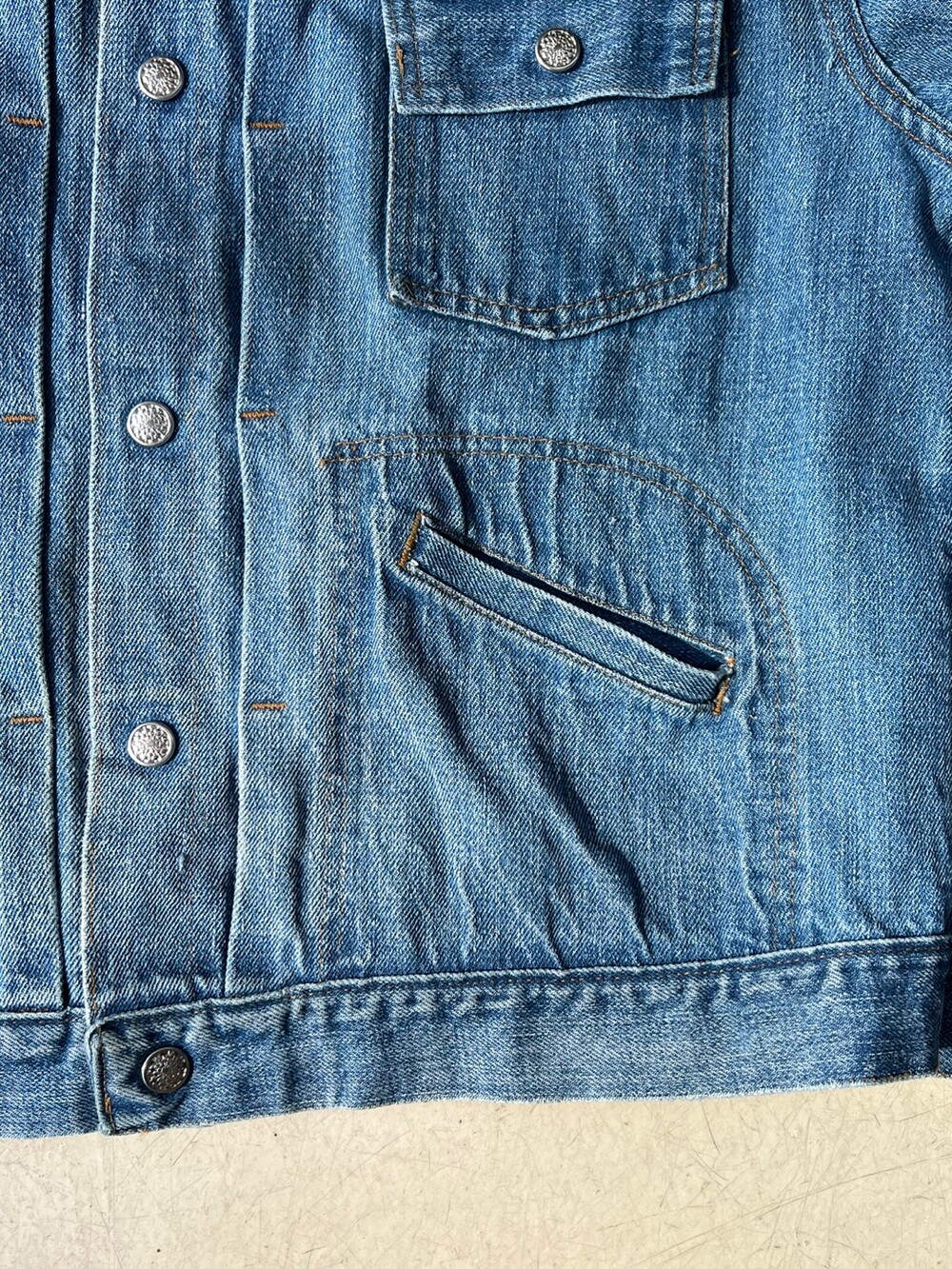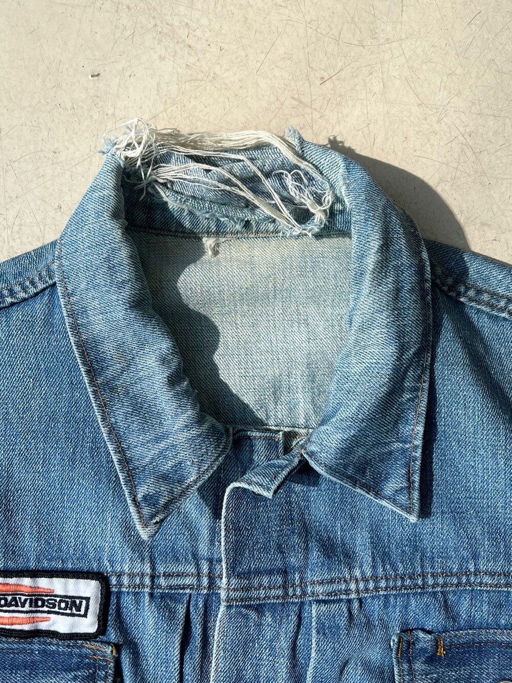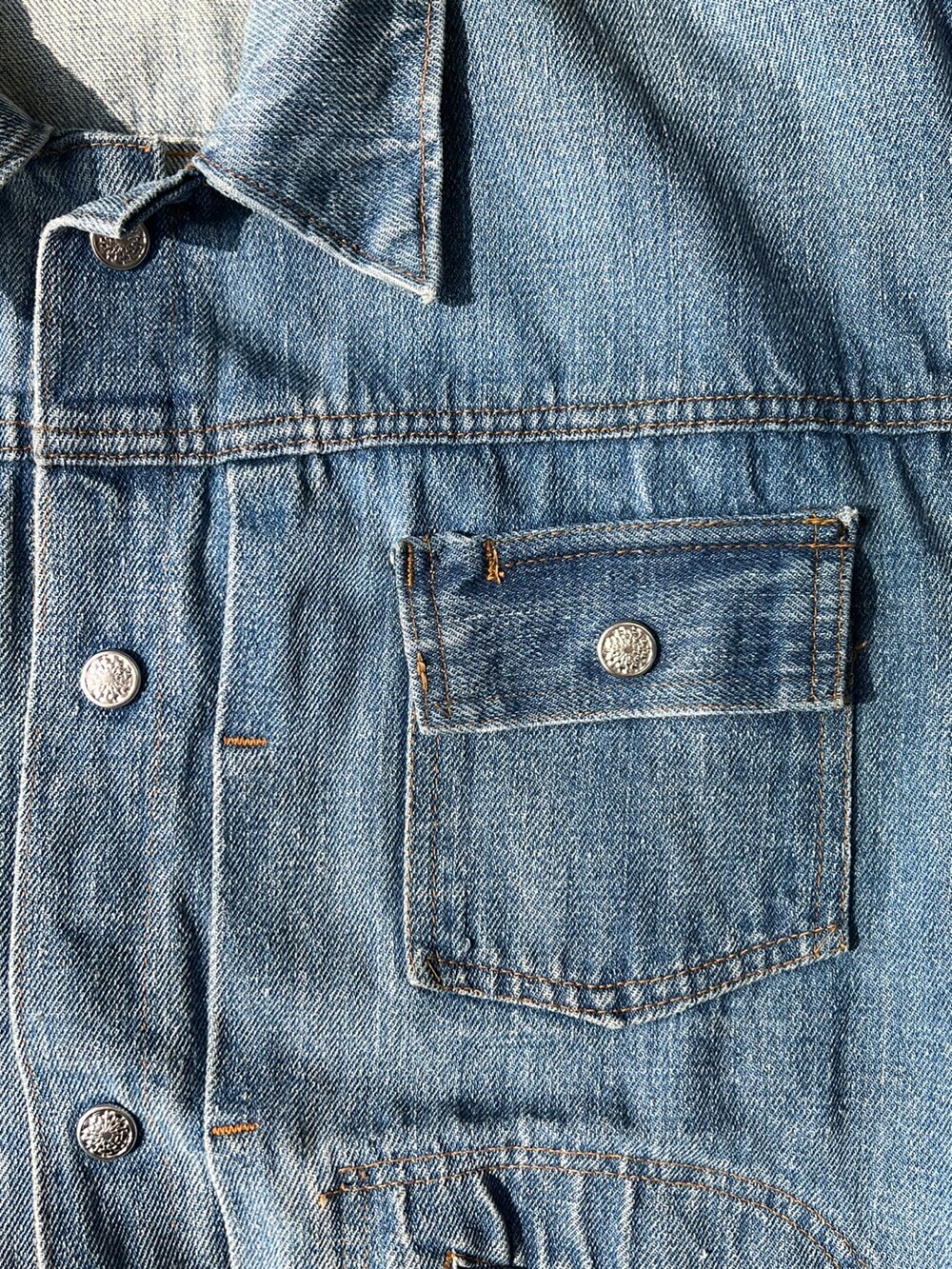 할리 데이비슨의 트러커라기보다는 스토어계열 브랜드의 트러커 자켓에 커스텀 패치가 붙은 제품이라 소개하는 게 맞겠다 싶어 바디에 대해 중점적으로 소개해봅니다. JCPenney Foremost 라인의 데님 트러커와 형태적으는 유사하나 보다 이후 연식인 RANCHCRAFT 라인의 데님 트러커입니다. 렌치크래프트 라인의 데님트러커는 코튼/폴리 혼방 원단을 쓰기도 하고 코튼100%의 일반적인 데님 원단을 사용하기도 하는데, 일반적으로 생각하는 트러커에 비해 원단이 살짝 얇긴해도 페이딩 양상을 보아하니 코튼 100% 혼용률의 제품인 것으로 추정됩니다.