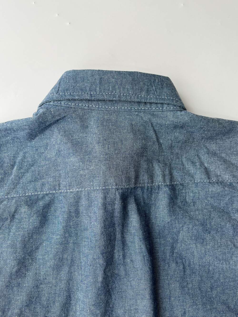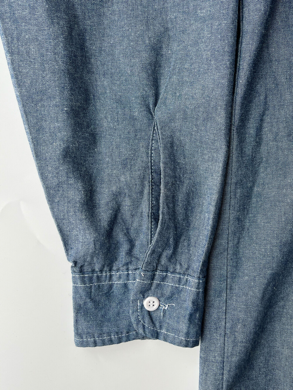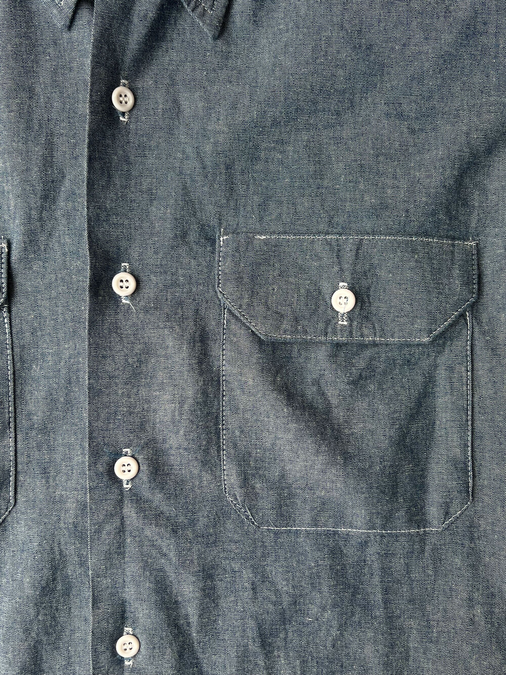 키 임페리얼 브랜드의 동일 연식 개체 중에서도 코튼/폴리 혼방인 50/50 원단이 주로 보이는 편인데, 코튼 100% 혼용률의 보다 두께감이 있으며 힘이 있는 원단을 사용하는 샴브레이 셔츠입니다. 칼라 형태가 무너지지 않도록 단단한 심지가 칼라 안쪽에 삽입되어 있으며 포켓 덮개 역시 원단을 겹쳐 단단한 질감이 눈에 띕니다.