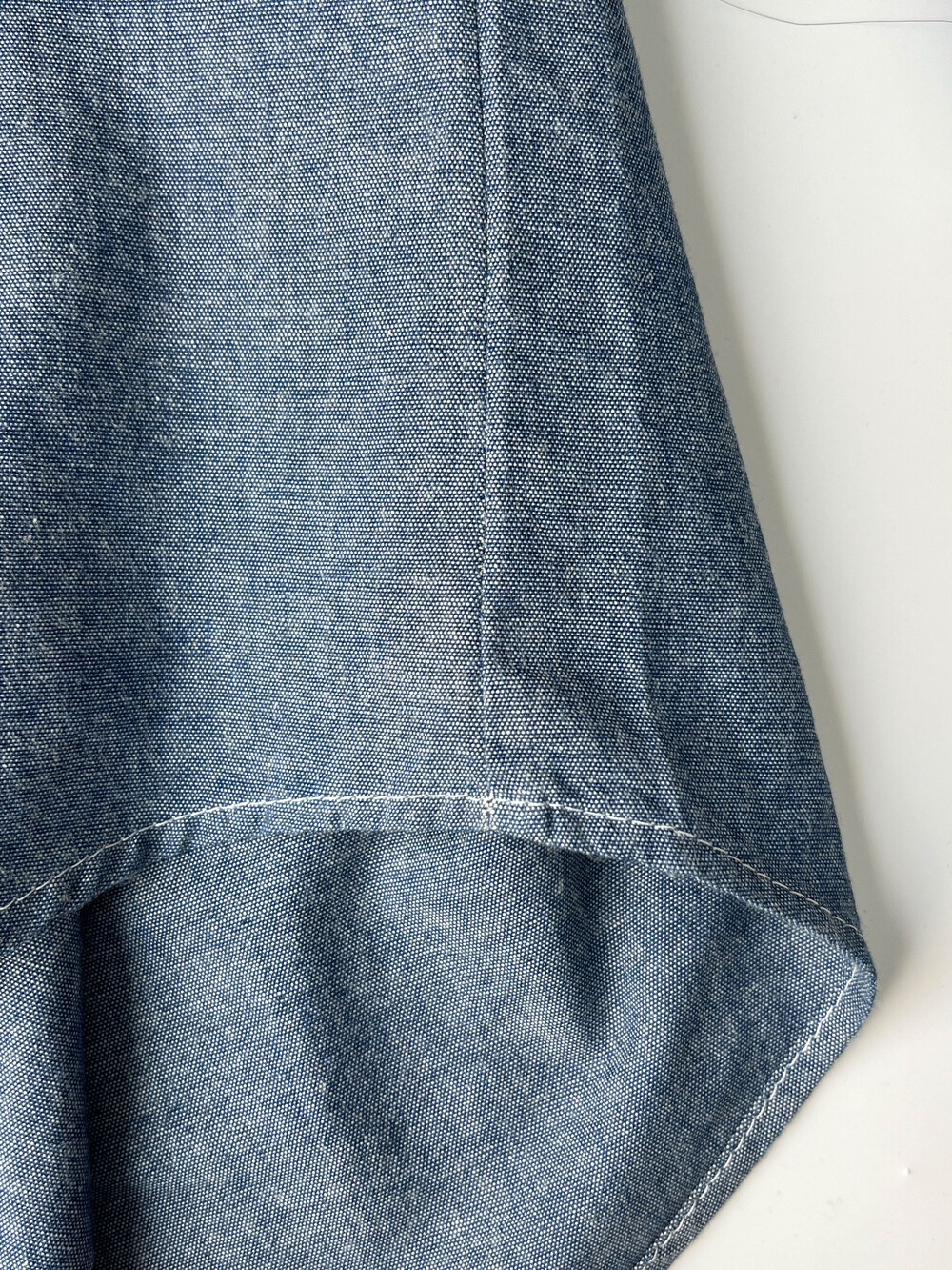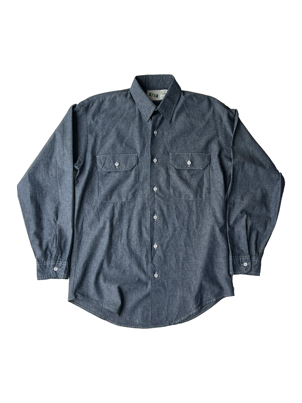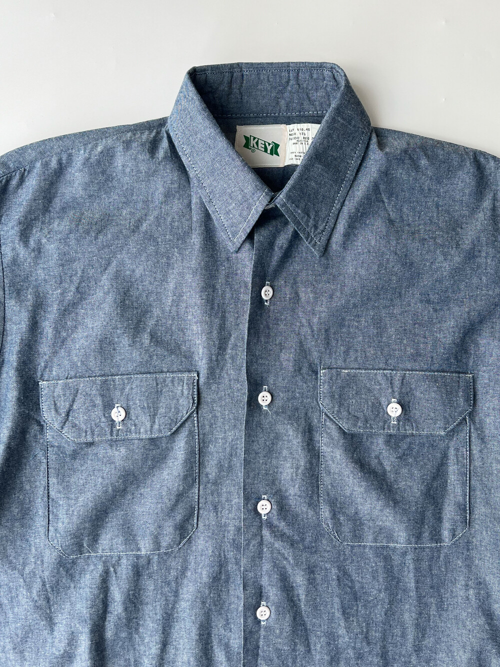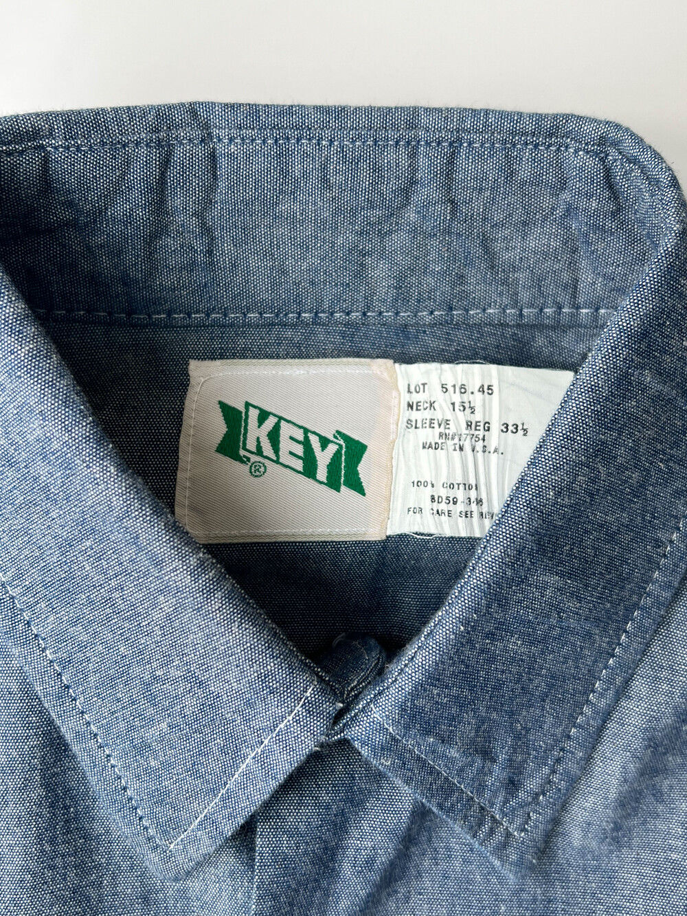 키 임페리얼 브랜드의 동일 연식 개체 중에서도 코튼/폴리 혼방인 50/50 원단이 주로 보이는 편인데, 코튼 100% 혼용률의 보다 두께감이 있으며 힘이 있는 원단을 사용하는 샴브레이 셔츠입니다. 칼라 형태가 무너지지 않도록 단단한 심지가 칼라 안쪽에 삽입되어 있으며 포켓 덮개 역시 원단을 겹쳐 단단한 질감이 눈에 띕니다.