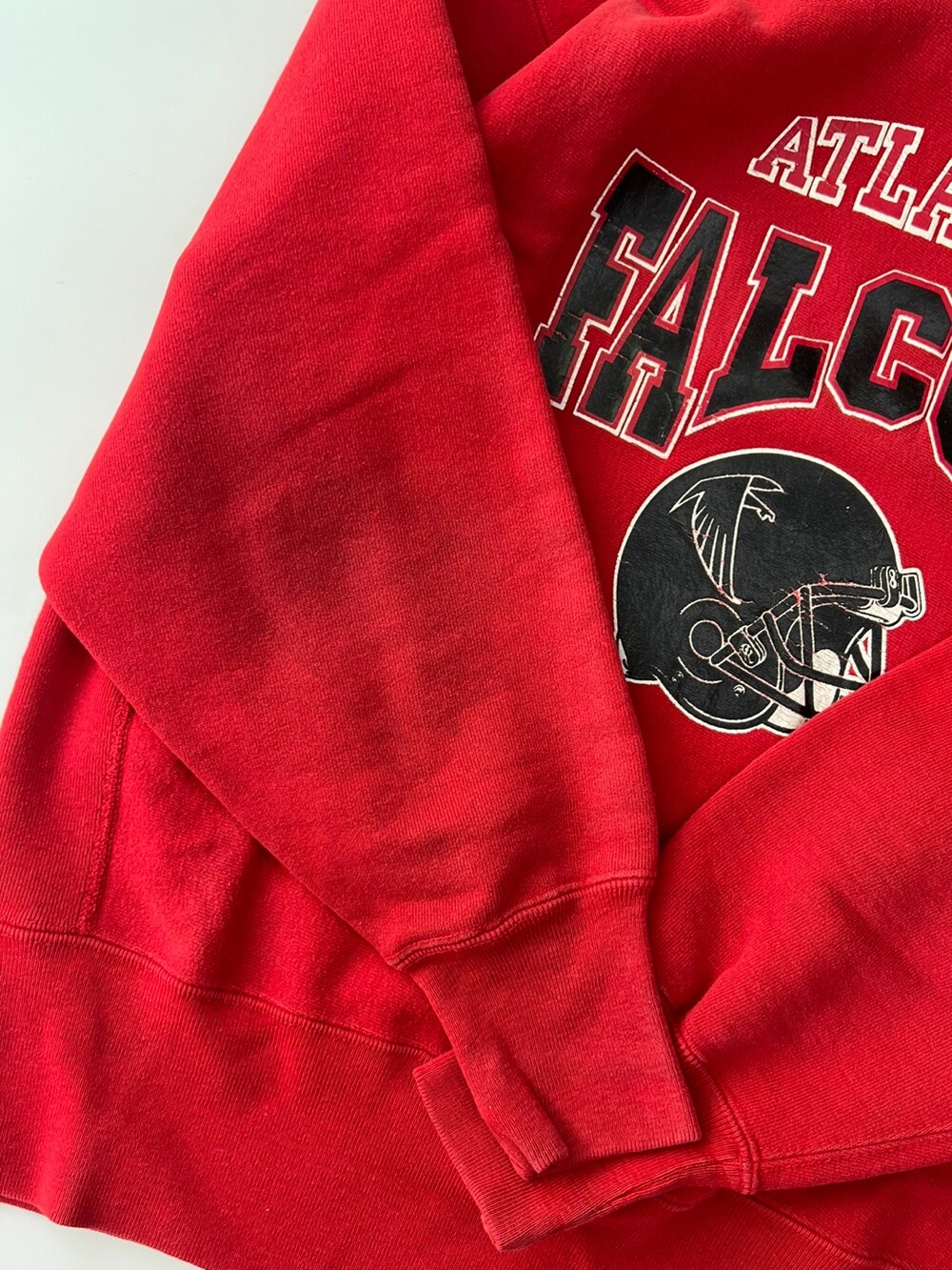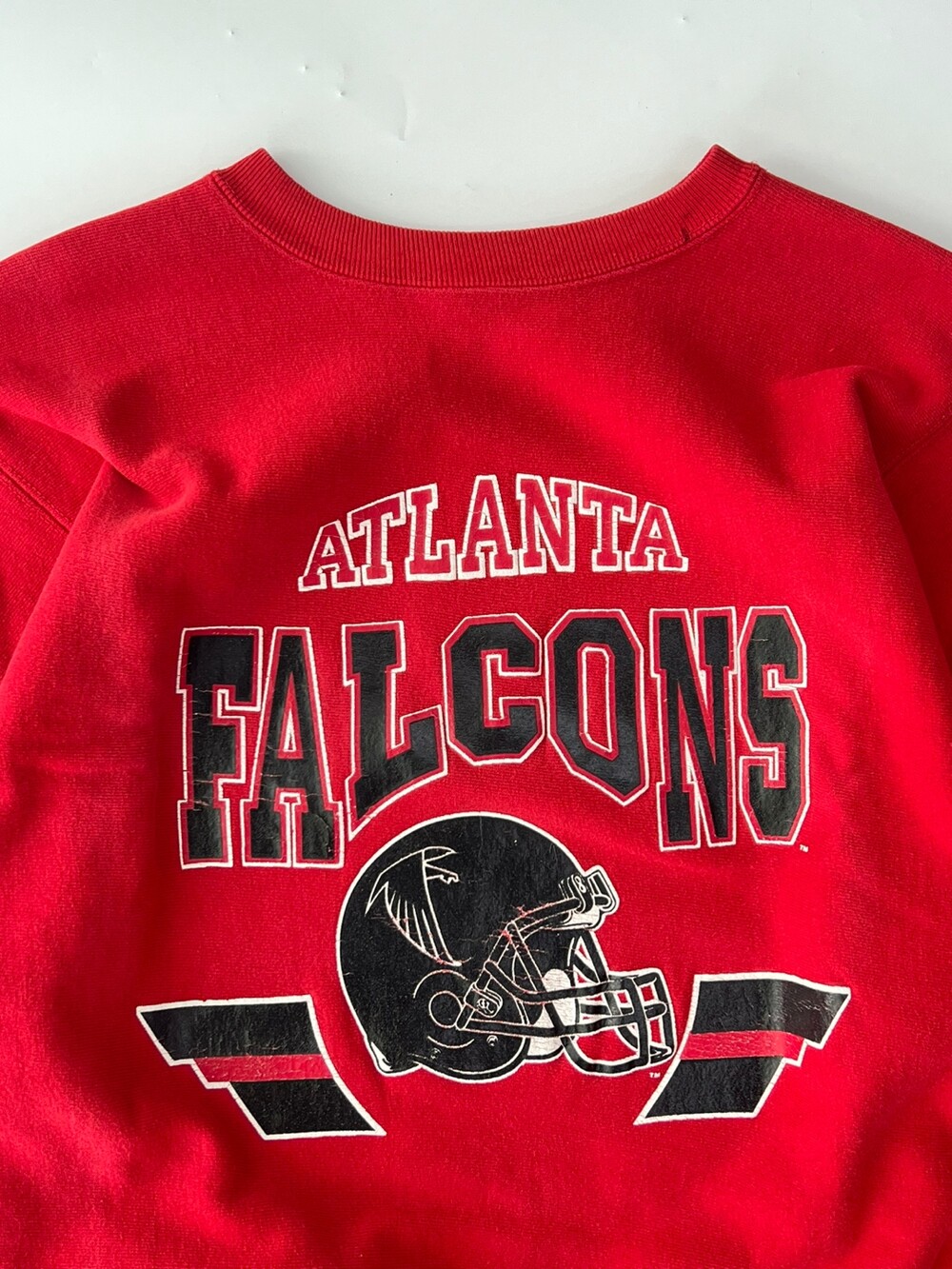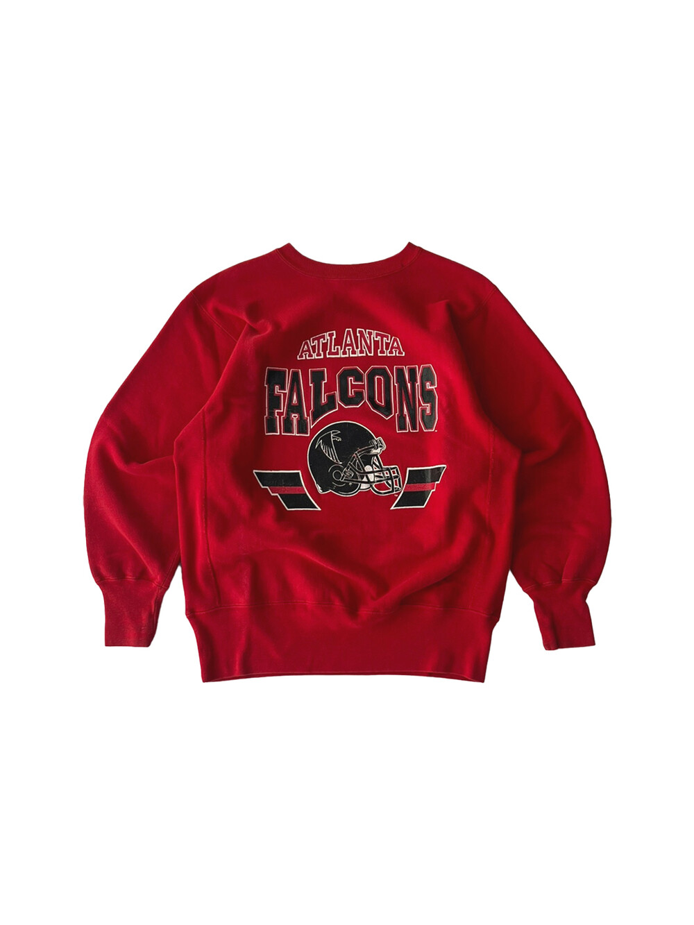 - 일반적인 의류의 재단방향을 90도로 돌려 재단하여 제작된 호리즌탈 위브(Horizontal) 방식의 스웻셔츠. - 목 옆 지점부터 어깨선까지의 봉제선이 없기에 어깨에 밀착되는 피팅감이 매력적인 제품. - 팔을 들어올리는 동작을 할 때 방해받지 않도록 암홀을 의도적으로 넓게 만든 프리덤 슬리브(Freedom Sleeve) 디테일. - 암홀 아래부터 몸판을 타이트하게 잡아주는 역할을 담당하는 사이드패널(Side Panel). - 미국 프로 미식축구 리그 NFL 참가 팀 애틀란타 팰컨스 프린팅