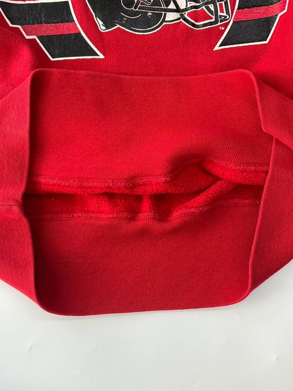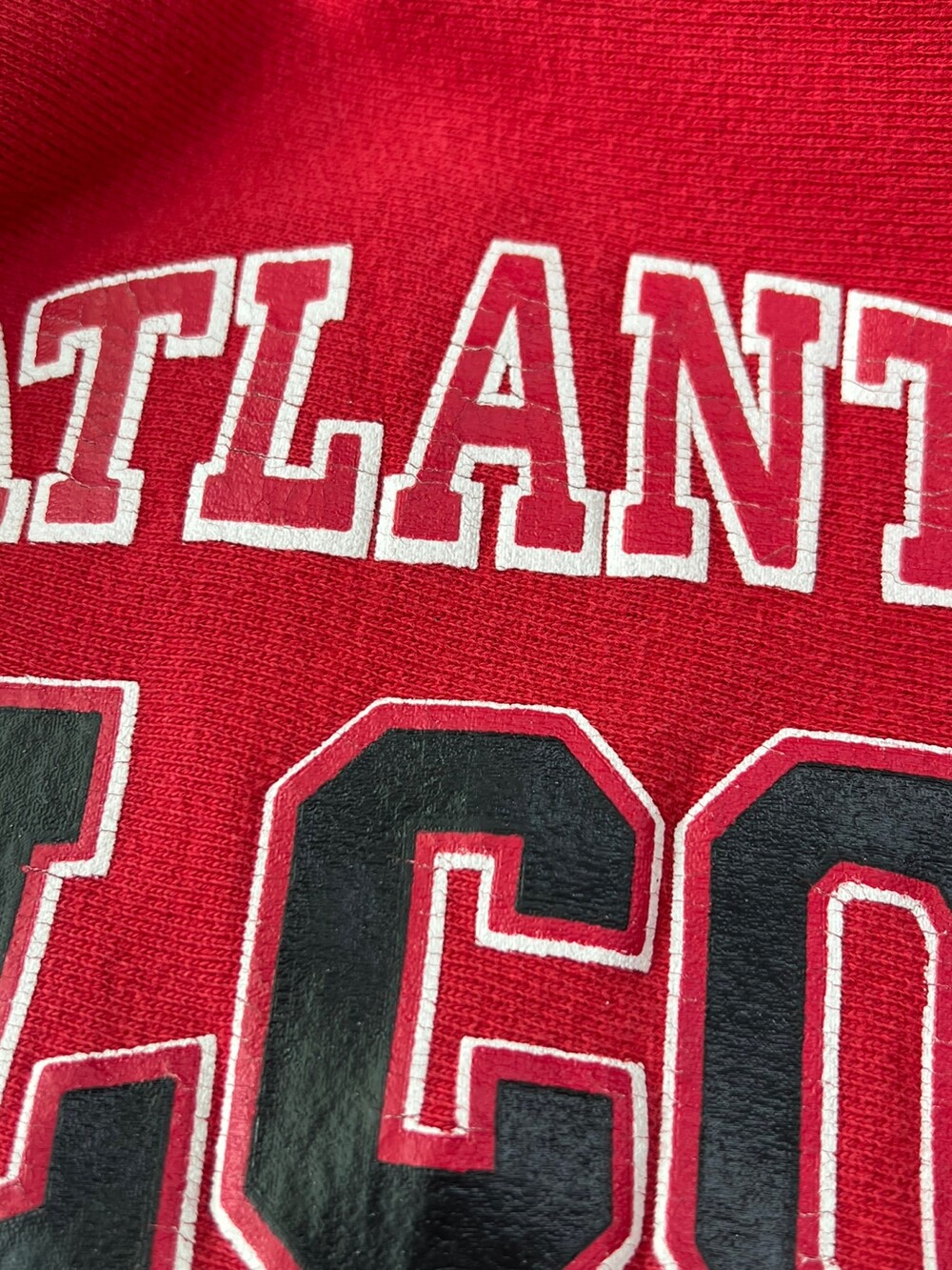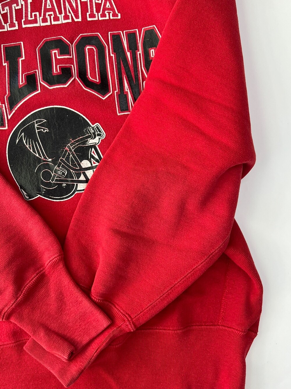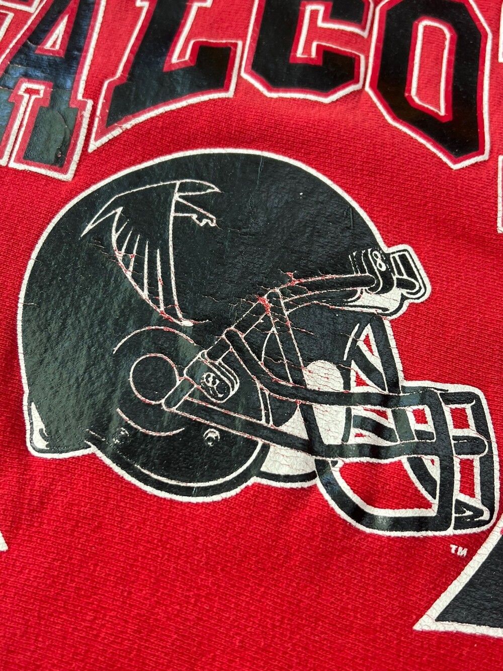 - 일반적인 의류의 재단방향을 90도로 돌려 재단하여 제작된 호리즌탈 위브(Horizontal) 방식의 스웻셔츠. - 목 옆 지점부터 어깨선까지의 봉제선이 없기에 어깨에 밀착되는 피팅감이 매력적인 제품. - 팔을 들어올리는 동작을 할 때 방해받지 않도록 암홀을 의도적으로 넓게 만든 프리덤 슬리브(Freedom Sleeve) 디테일. - 암홀 아래부터 몸판을 타이트하게 잡아주는 역할을 담당하는 사이드패널(Side Panel). - 미국 프로 미식축구 리그 NFL 참가 팀 애틀란타 팰컨스 프린팅