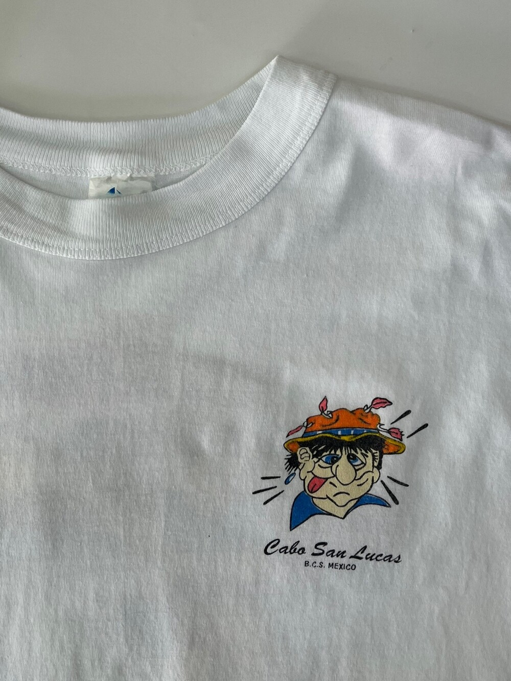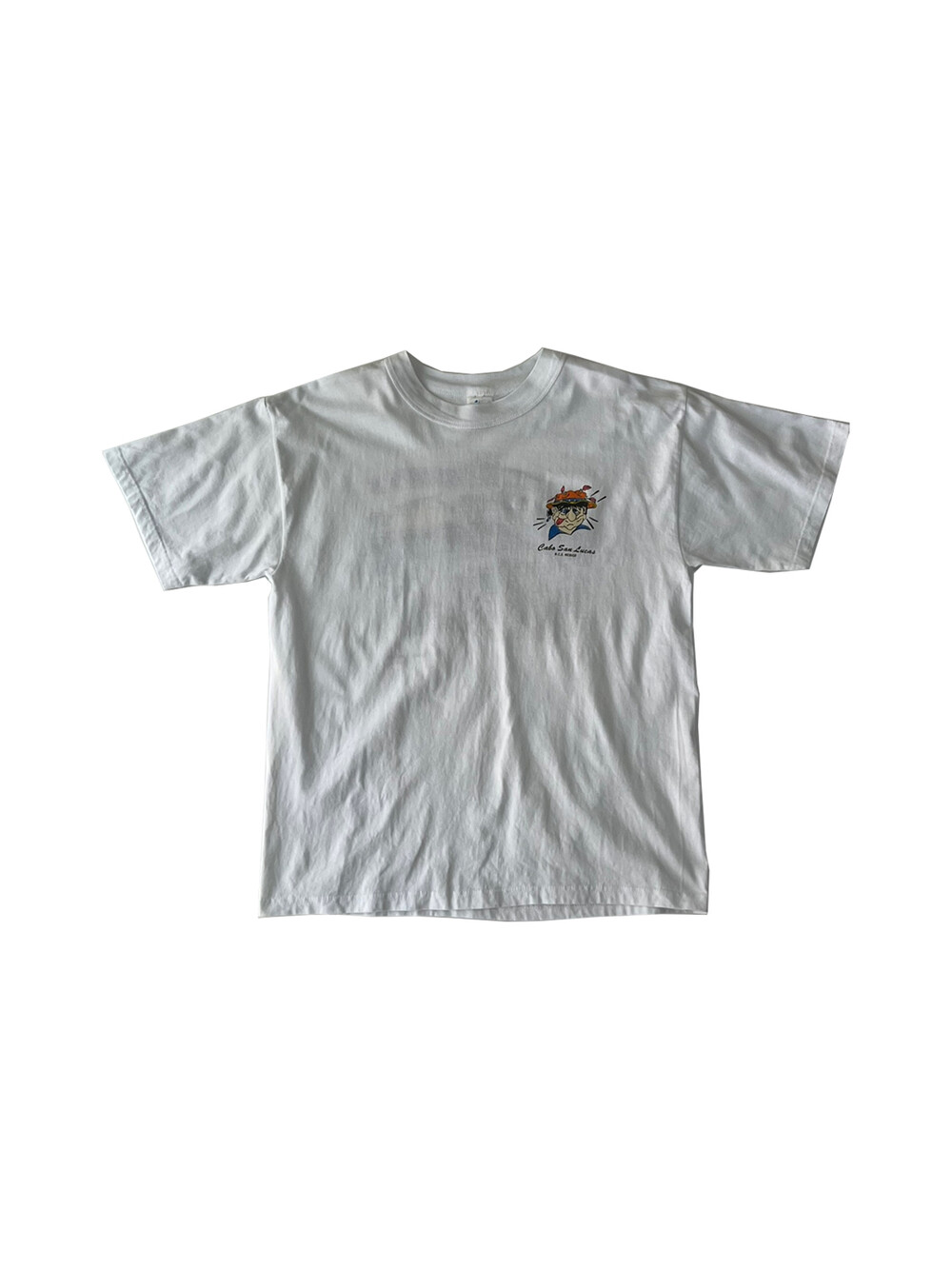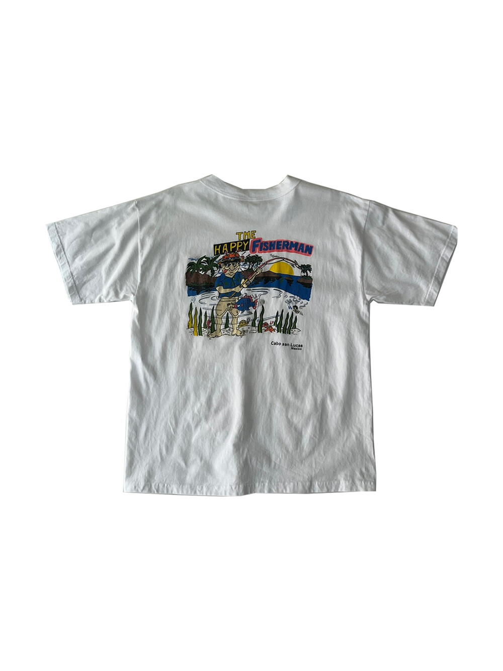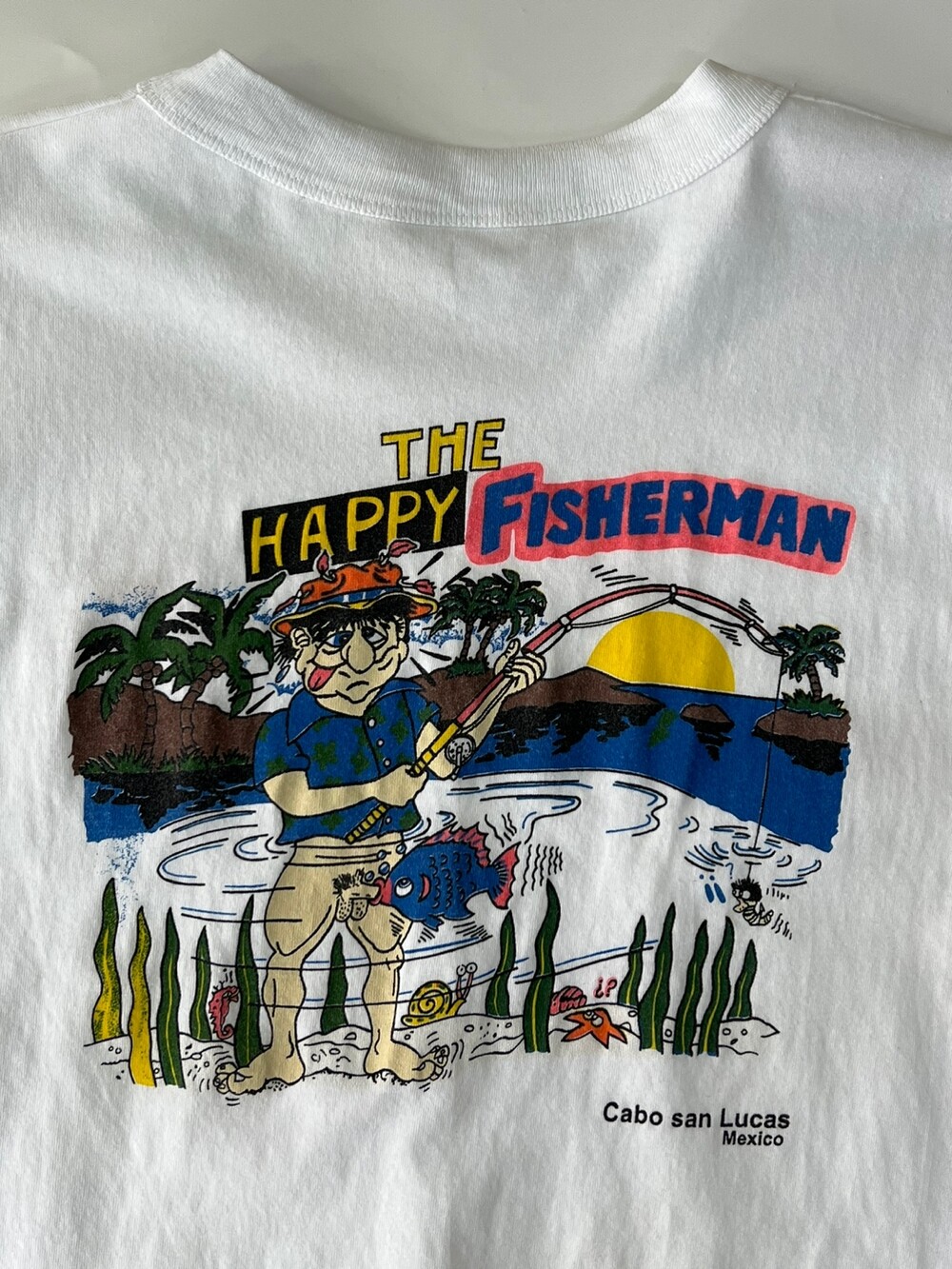 해피 타임을 즐기고 있는 낚시꾼 프린팅이 전후면에 올려진 티셔츠.
