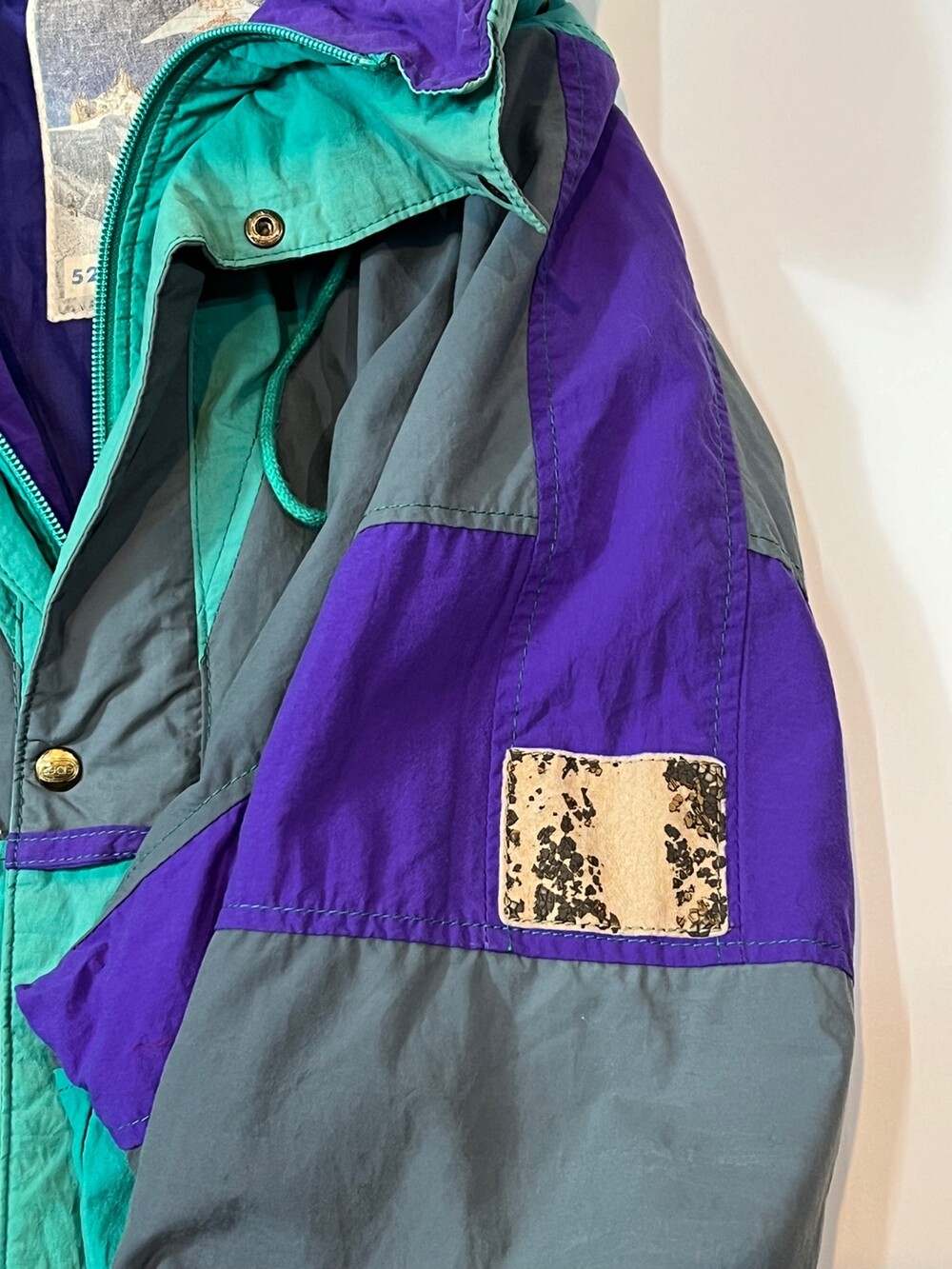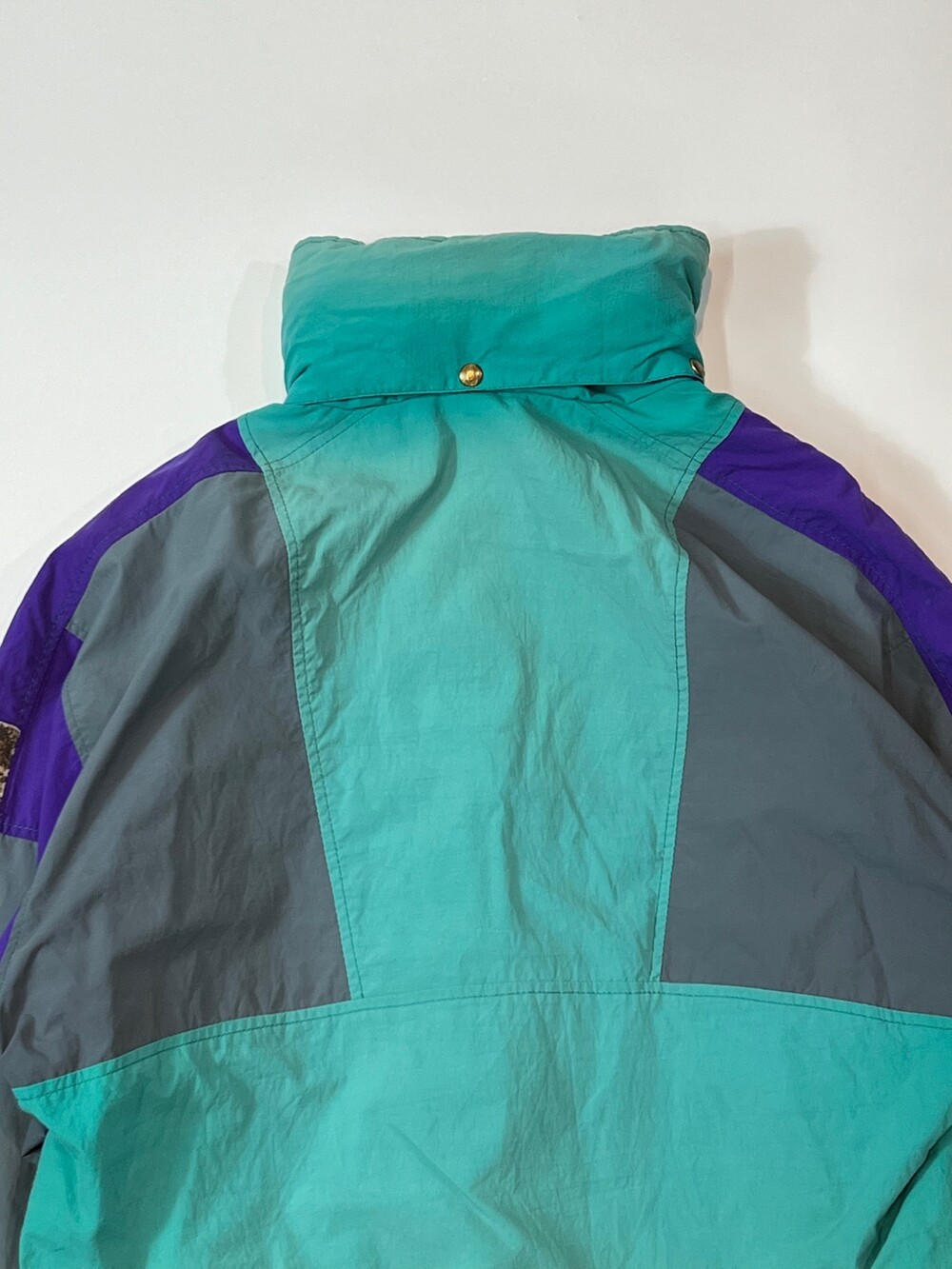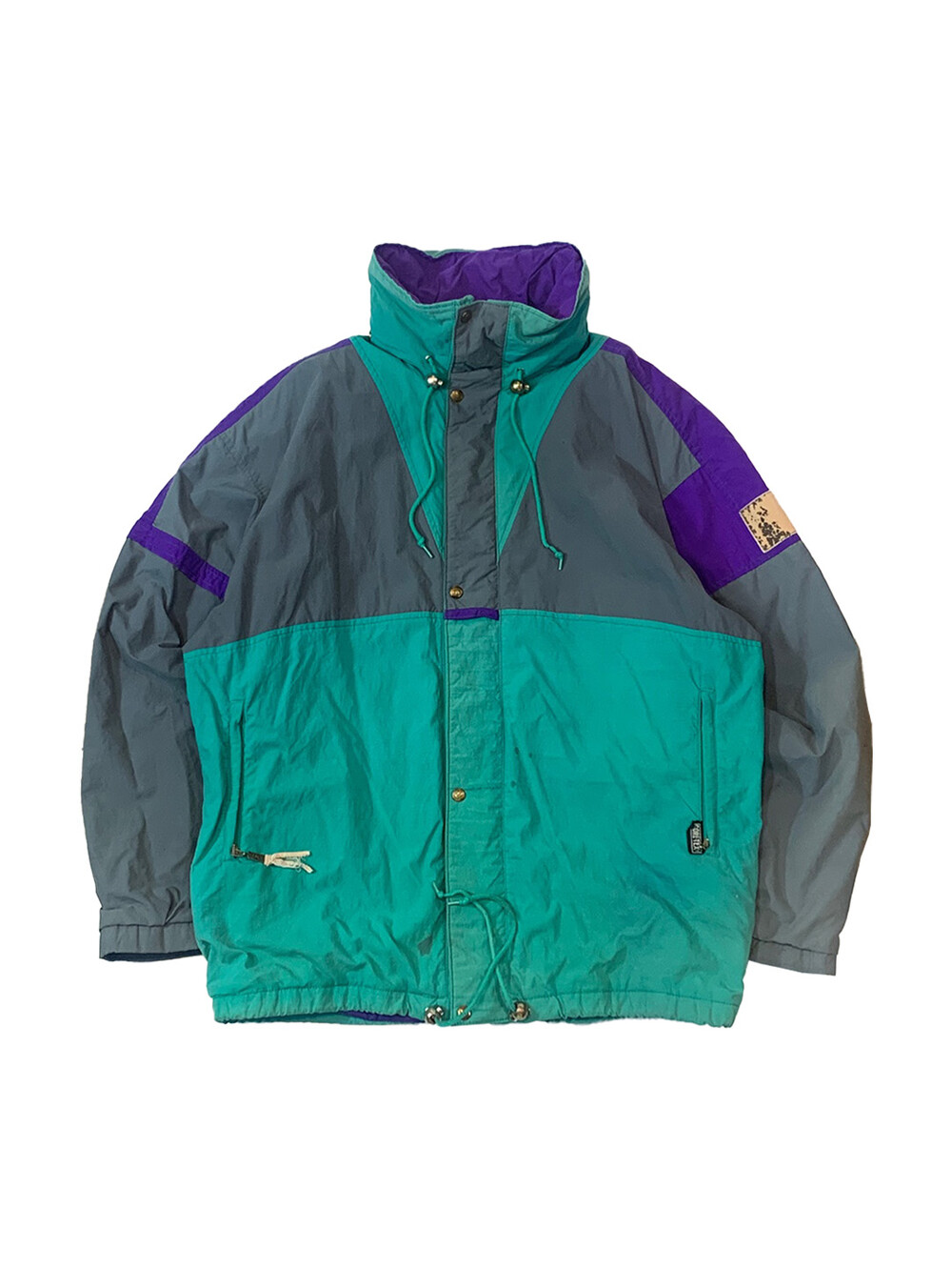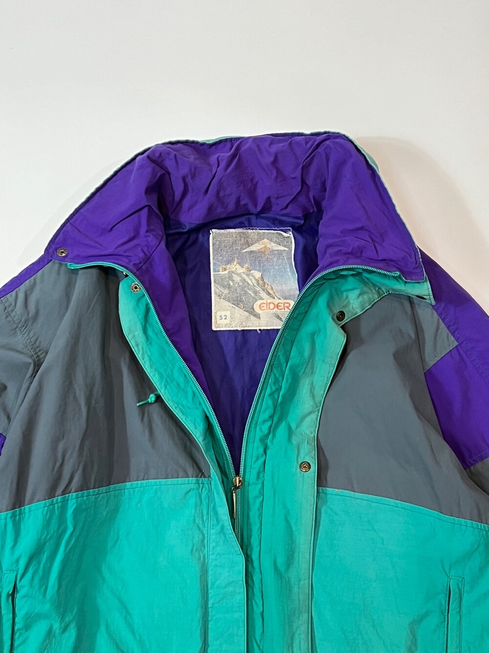 스키웨어를 비롯한 동계용 스포츠웨어를 주로 선보이던 프랑스 브랜드 아이더의 윈드브레이커 스키 자켓입니다. 틸, 퍼플, 그레이 세 가지 배색이 혼합된 스포티하면서도 빈티지한 배색으로, 그 중에서도 페이딩을 거쳐 색바랜 틸 컬러 색감이 돋보이는 제품입니다.