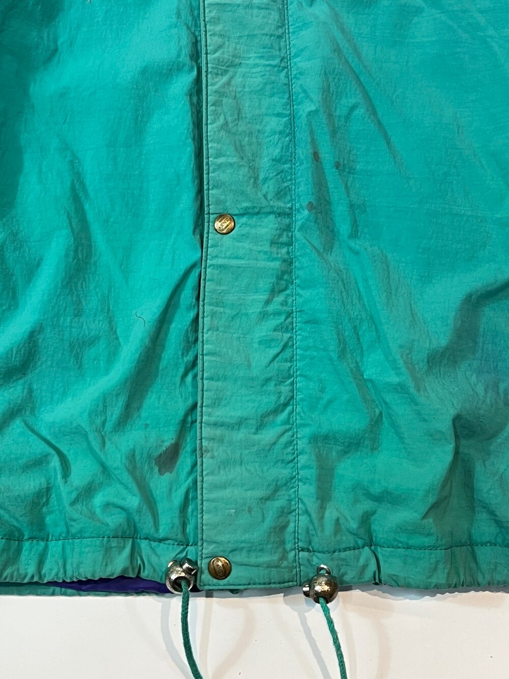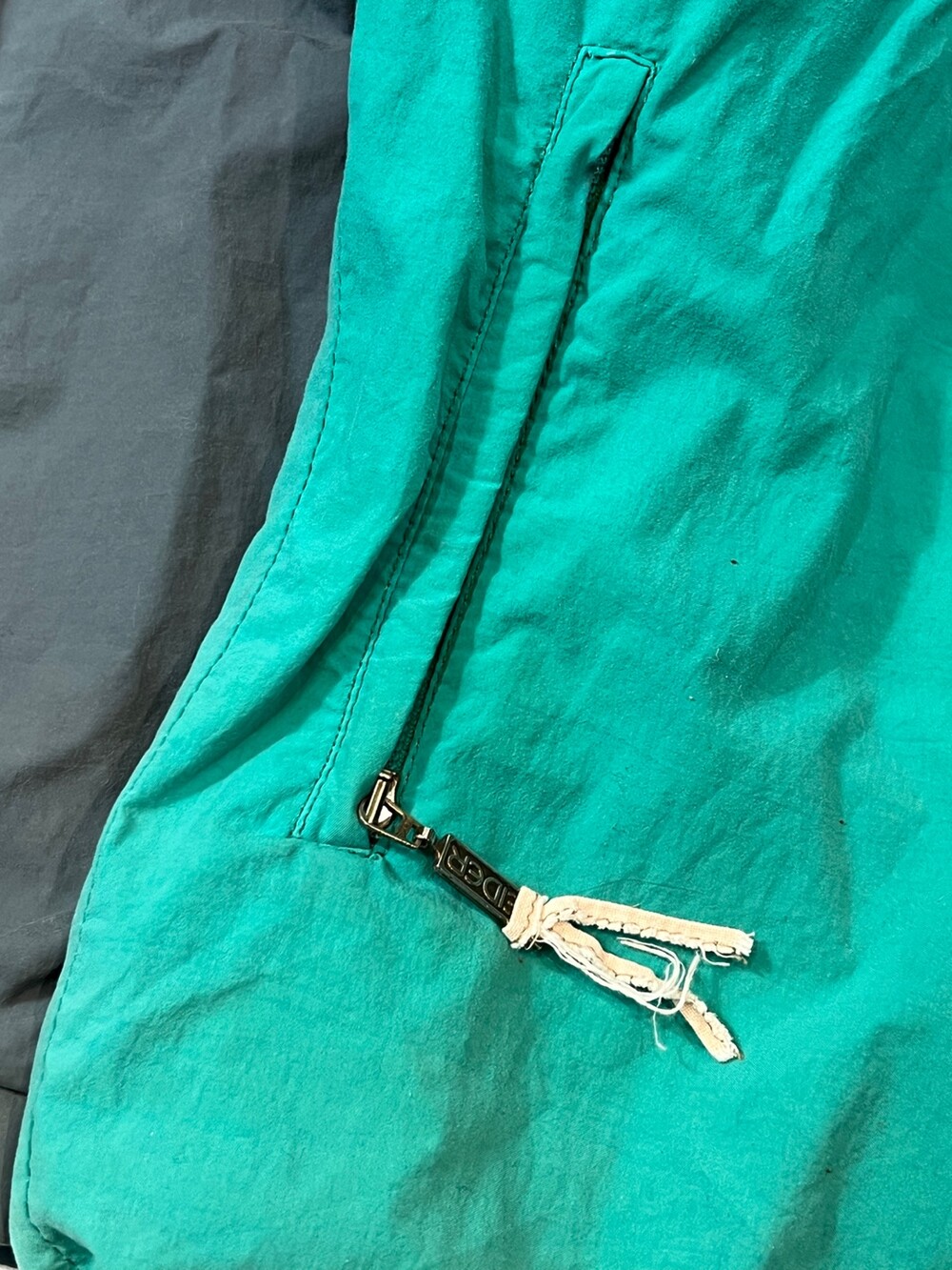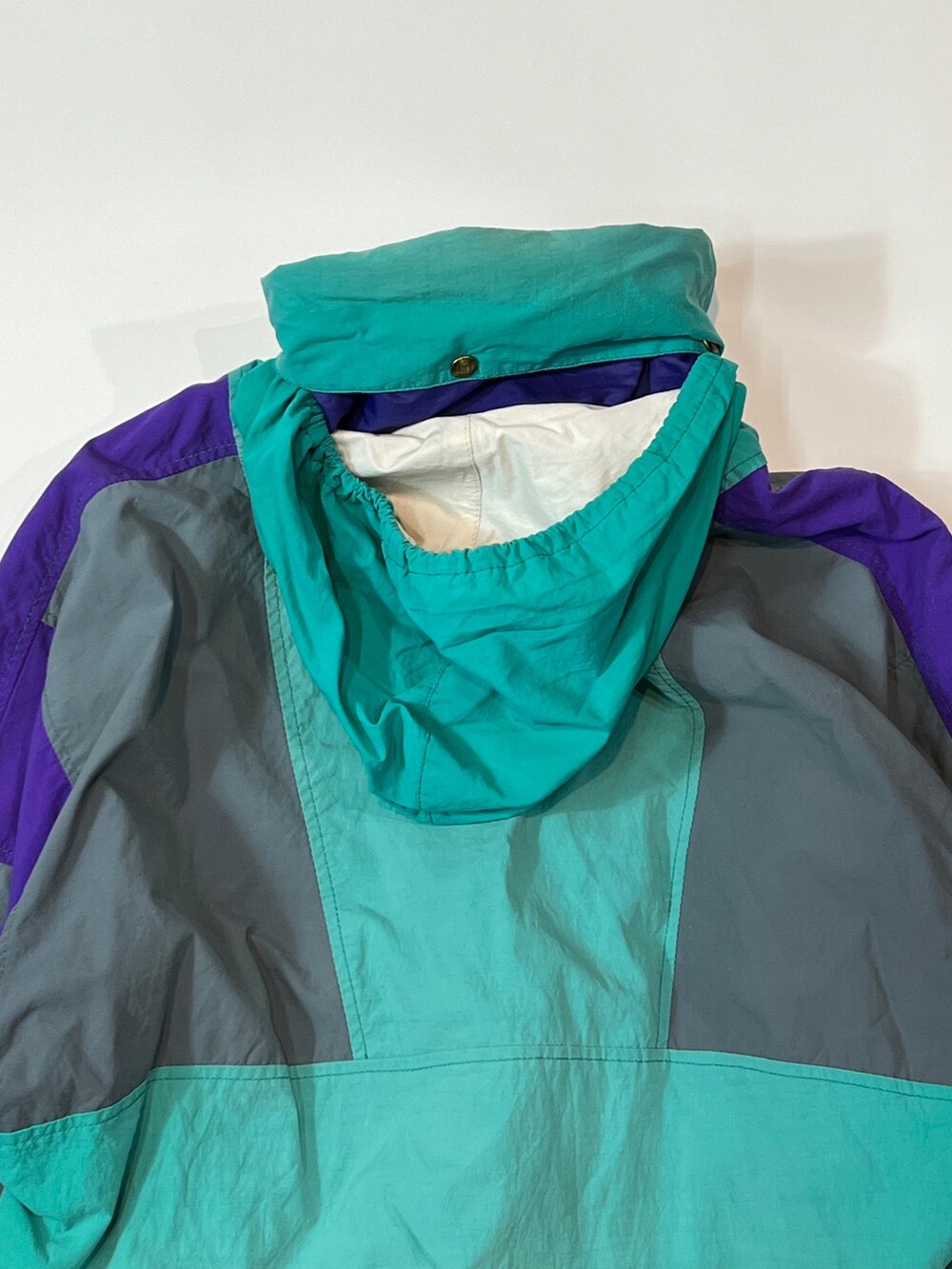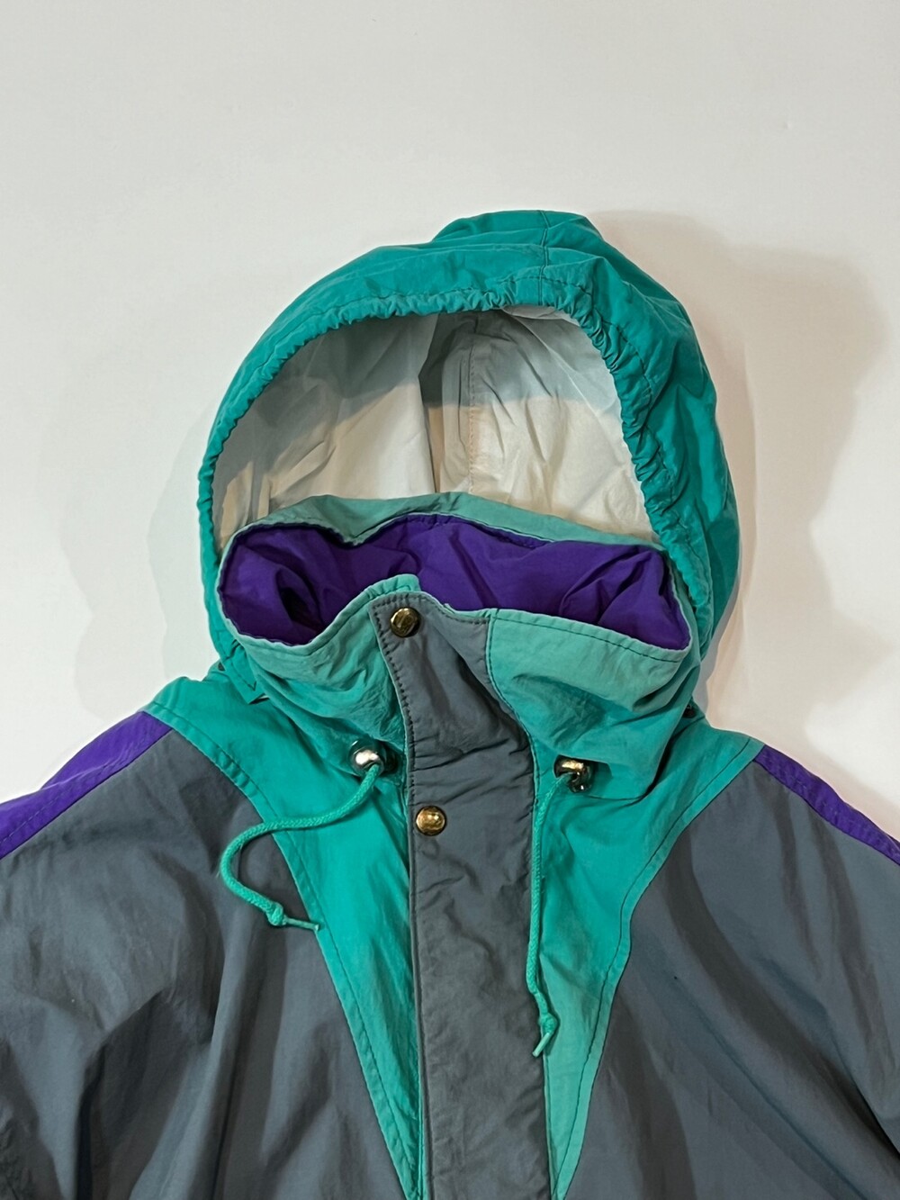 스키웨어를 비롯한 동계용 스포츠웨어를 주로 선보이던 프랑스 브랜드 아이더의 윈드브레이커 스키 자켓입니다. 틸, 퍼플, 그레이 세 가지 배색이 혼합된 스포티하면서도 빈티지한 배색으로, 그 중에서도 페이딩을 거쳐 색바랜 틸 컬러 색감이 돋보이는 제품입니다.