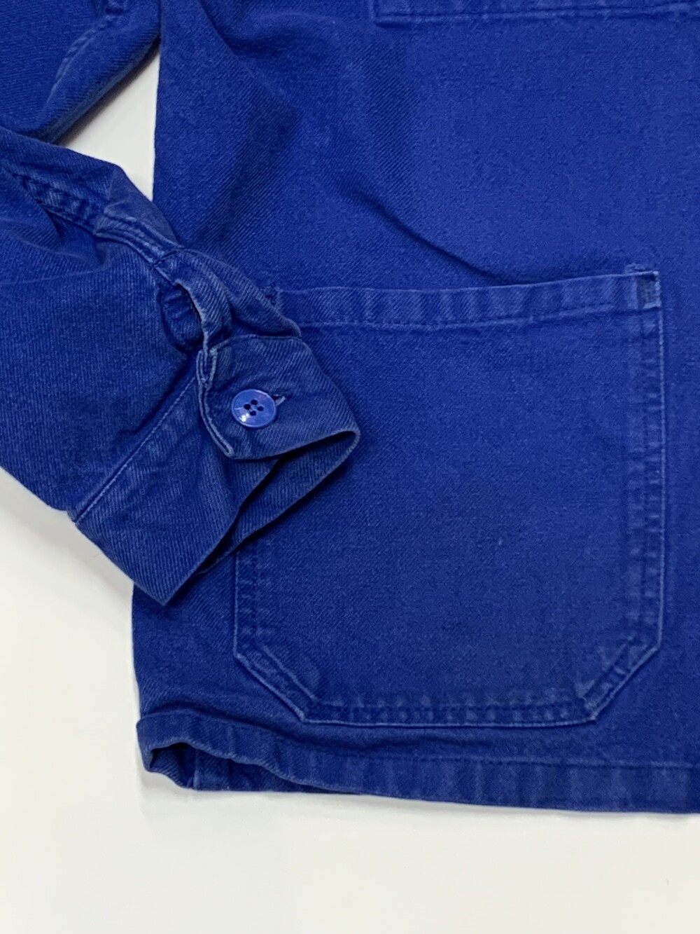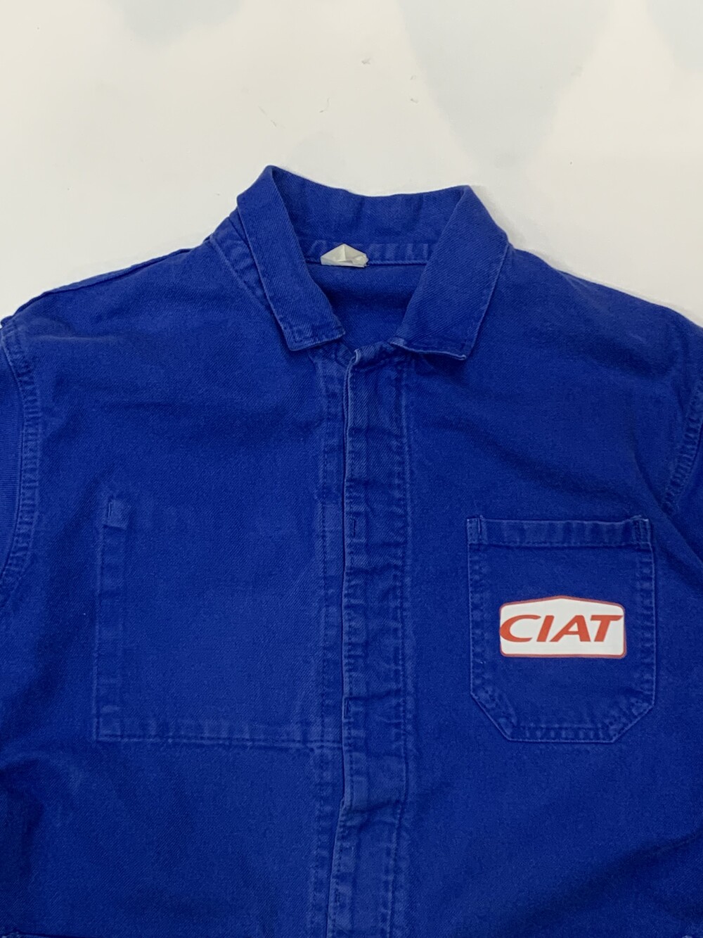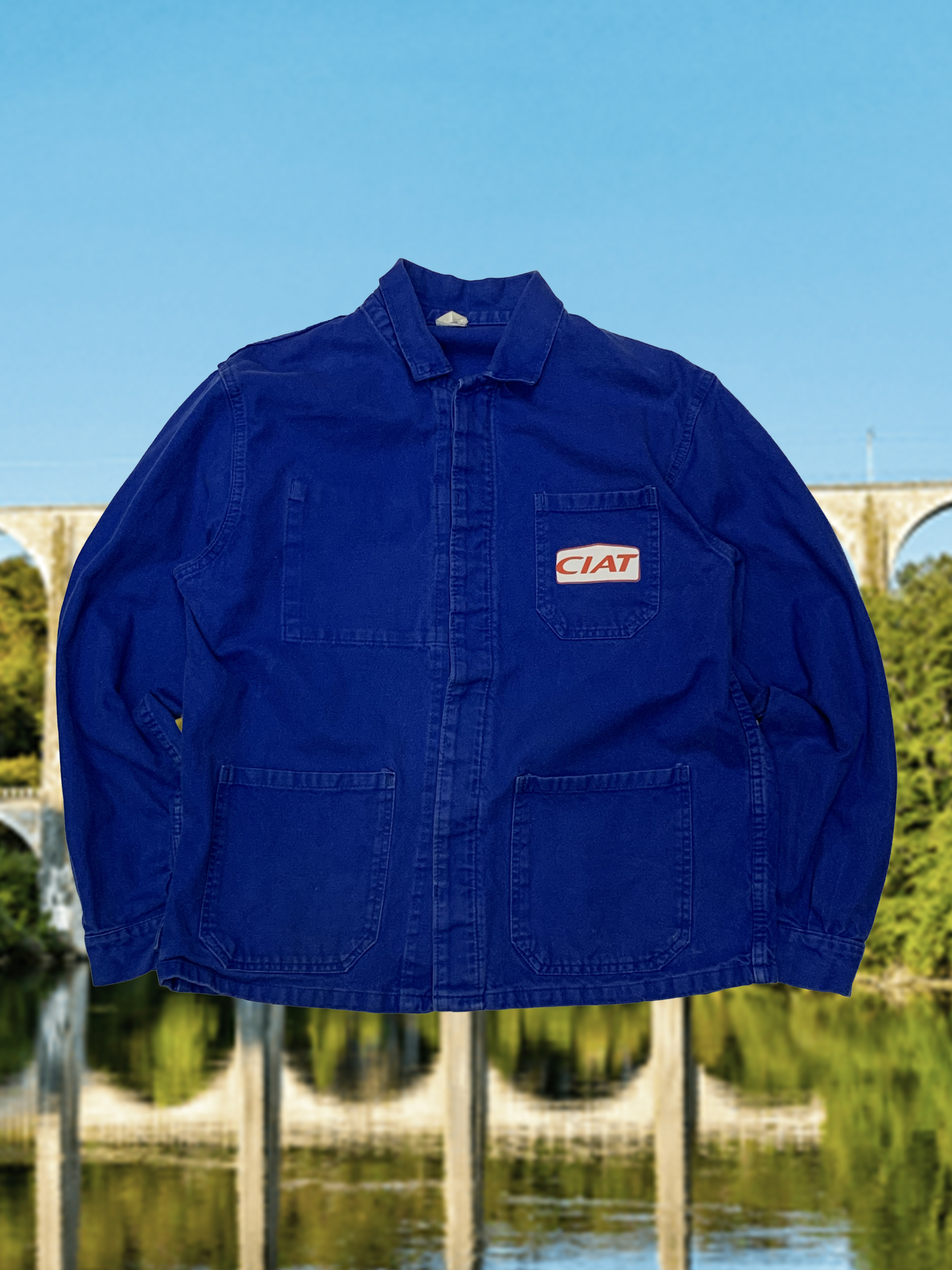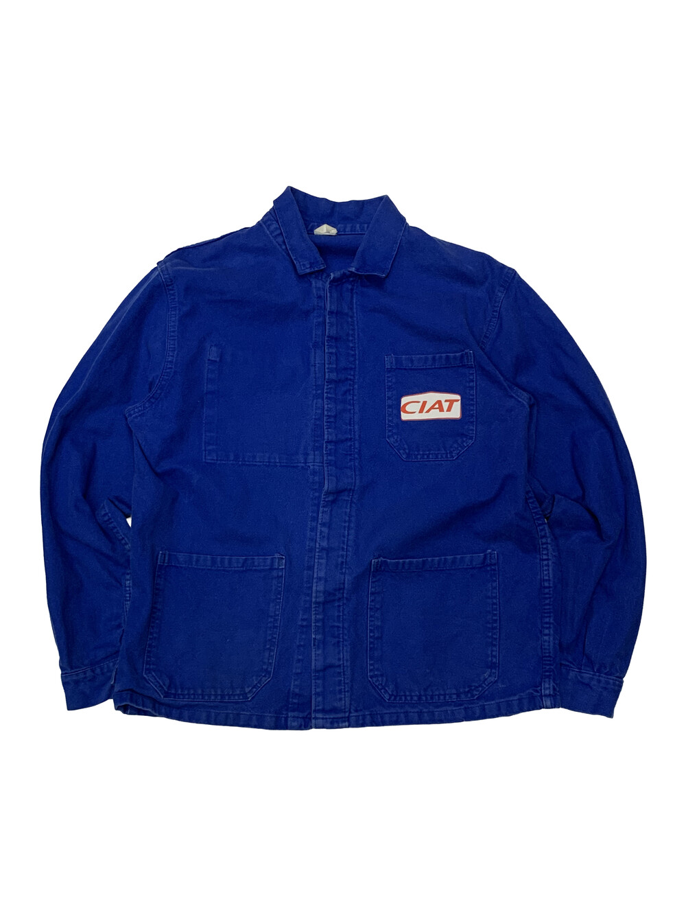 전형적인 3포켓 사양의 프렌치블루 컬러 유로피언 워크 자켓. 두껍지않은 코튼 트윌 원단으로 캐주얼하게 활용하기 좋을만한 제품입니다. 전면에는 에어컨디셔너 제조회사 CIAT 프린팅이 올려져 있습니다.