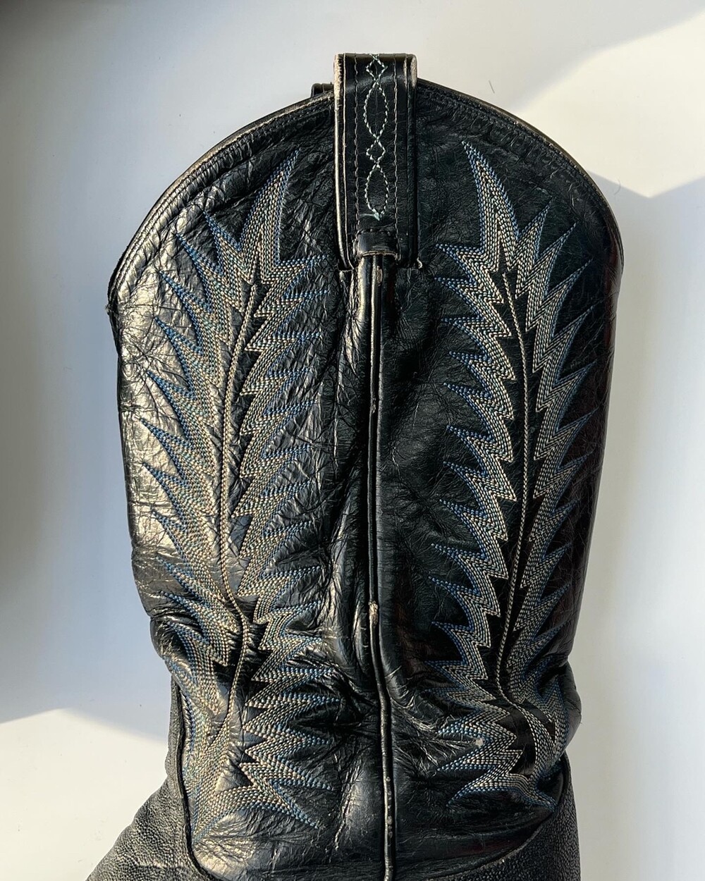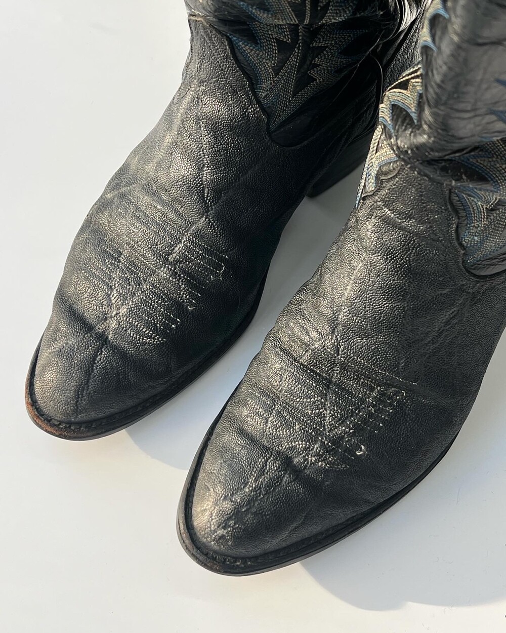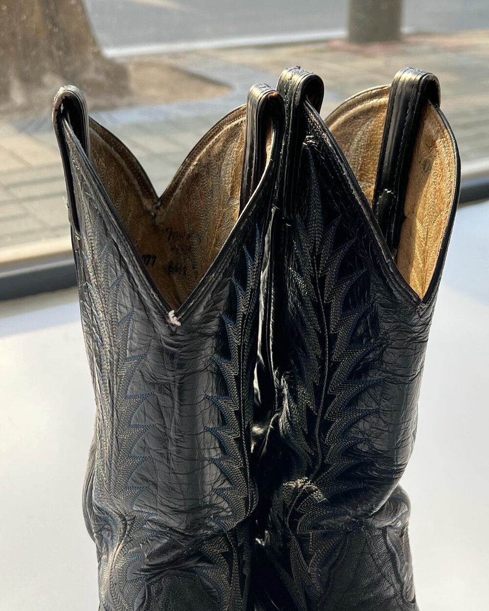 카우보이부츠 메이커 중 가장 널리 알려진 브랜드 중 하나인 토니 라마(Tony Lama)의 카우보이 부츠입니다. 블루컬러 스티치가 수놓아져 데님팬츠와의 궁합이 좋을 제품입니다.