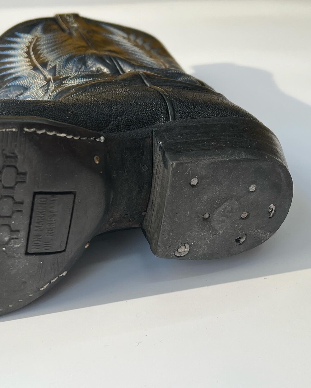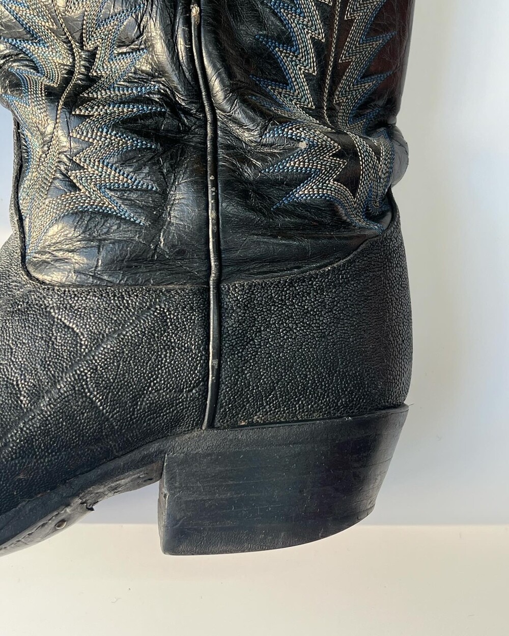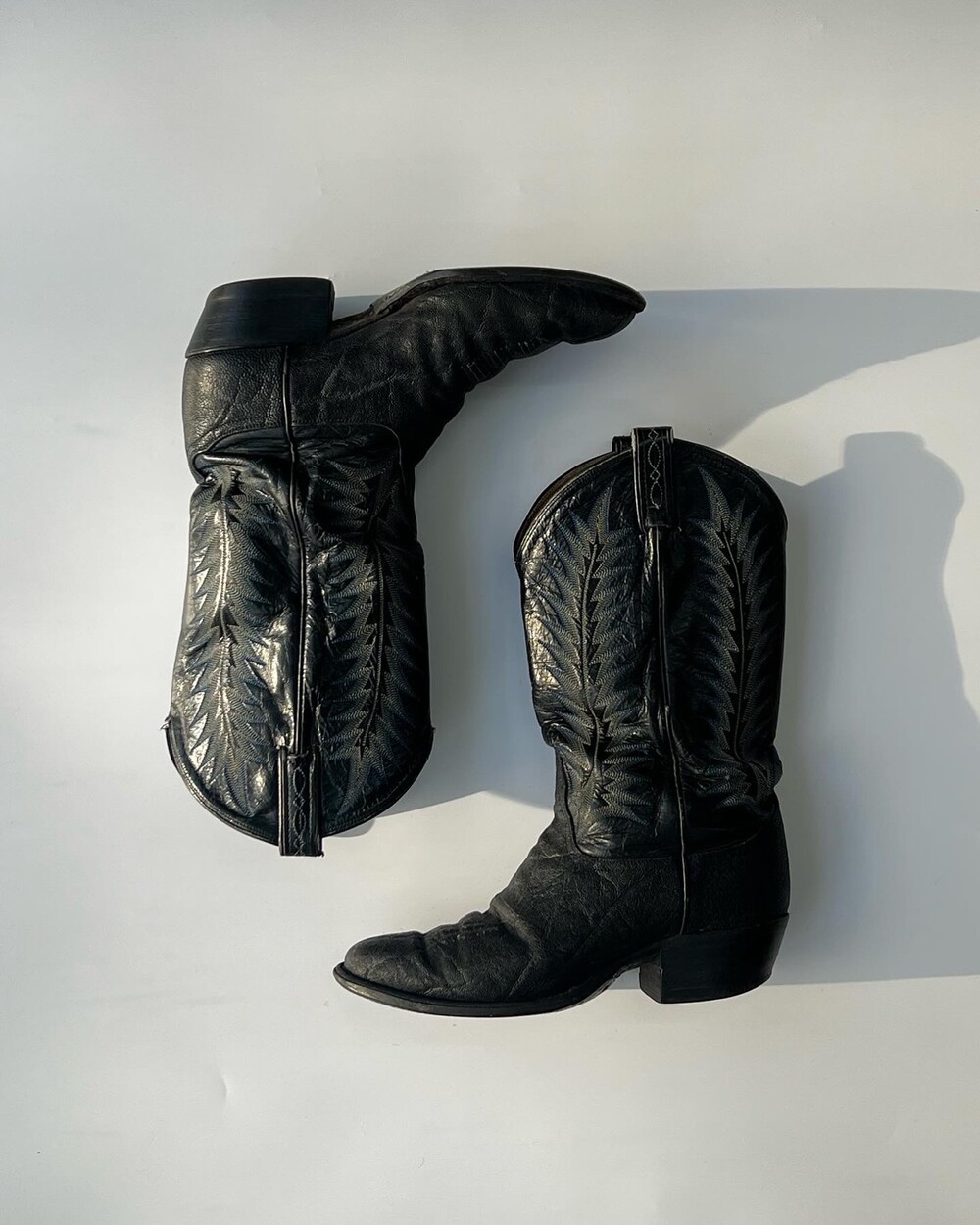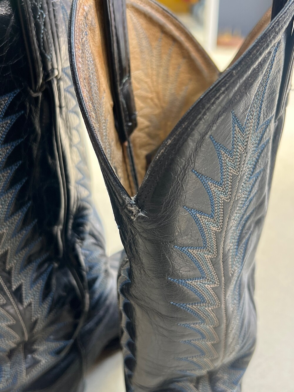 카우보이부츠 메이커 중 가장 널리 알려진 브랜드 중 하나인 토니 라마(Tony Lama)의 카우보이 부츠입니다. 블루컬러 스티치가 수놓아져 데님팬츠와의 궁합이 좋을 제품입니다.