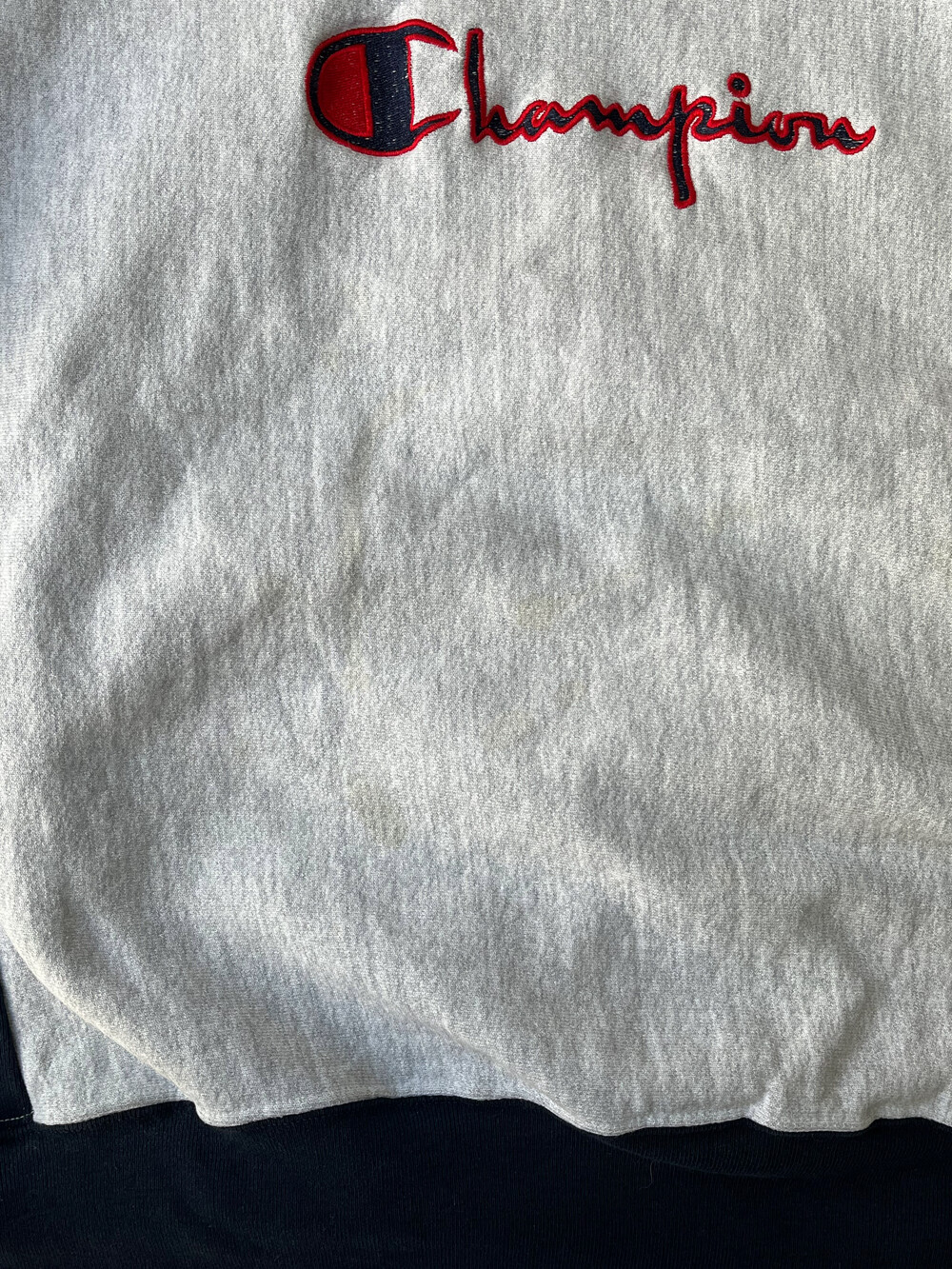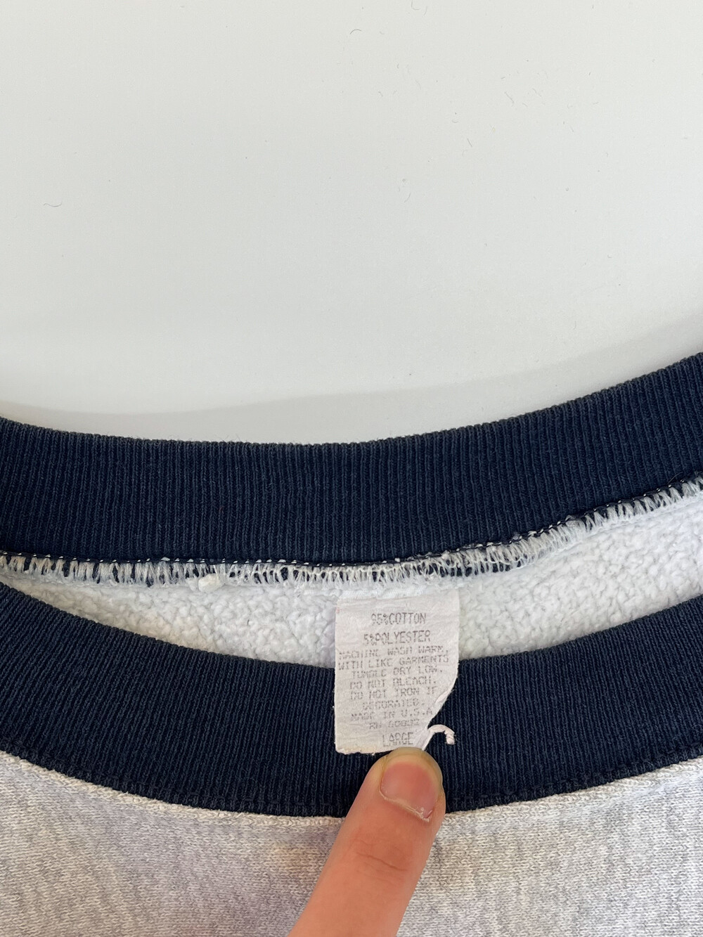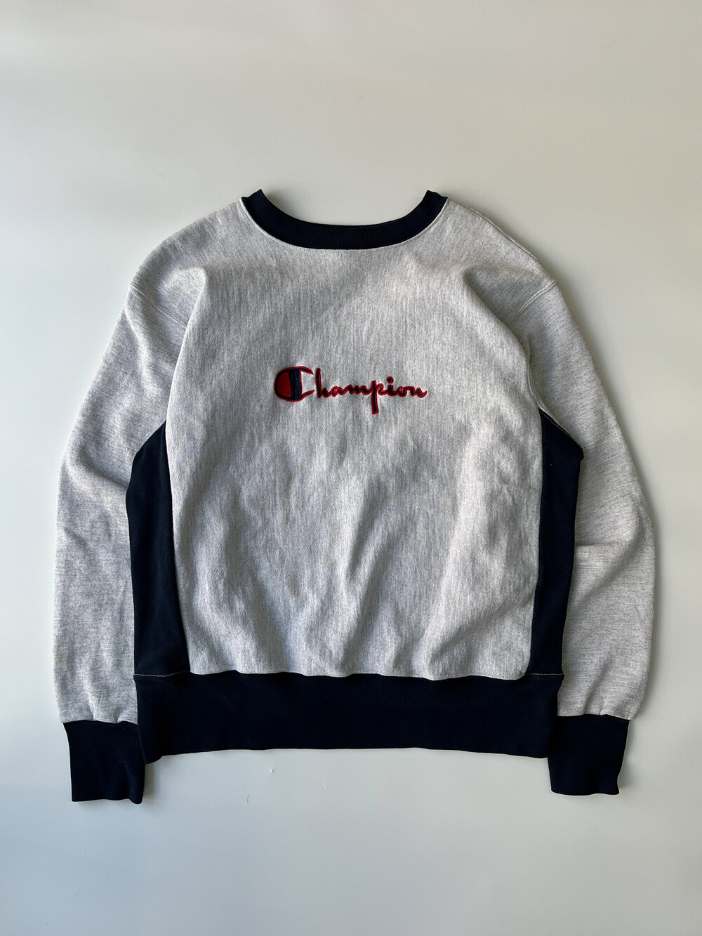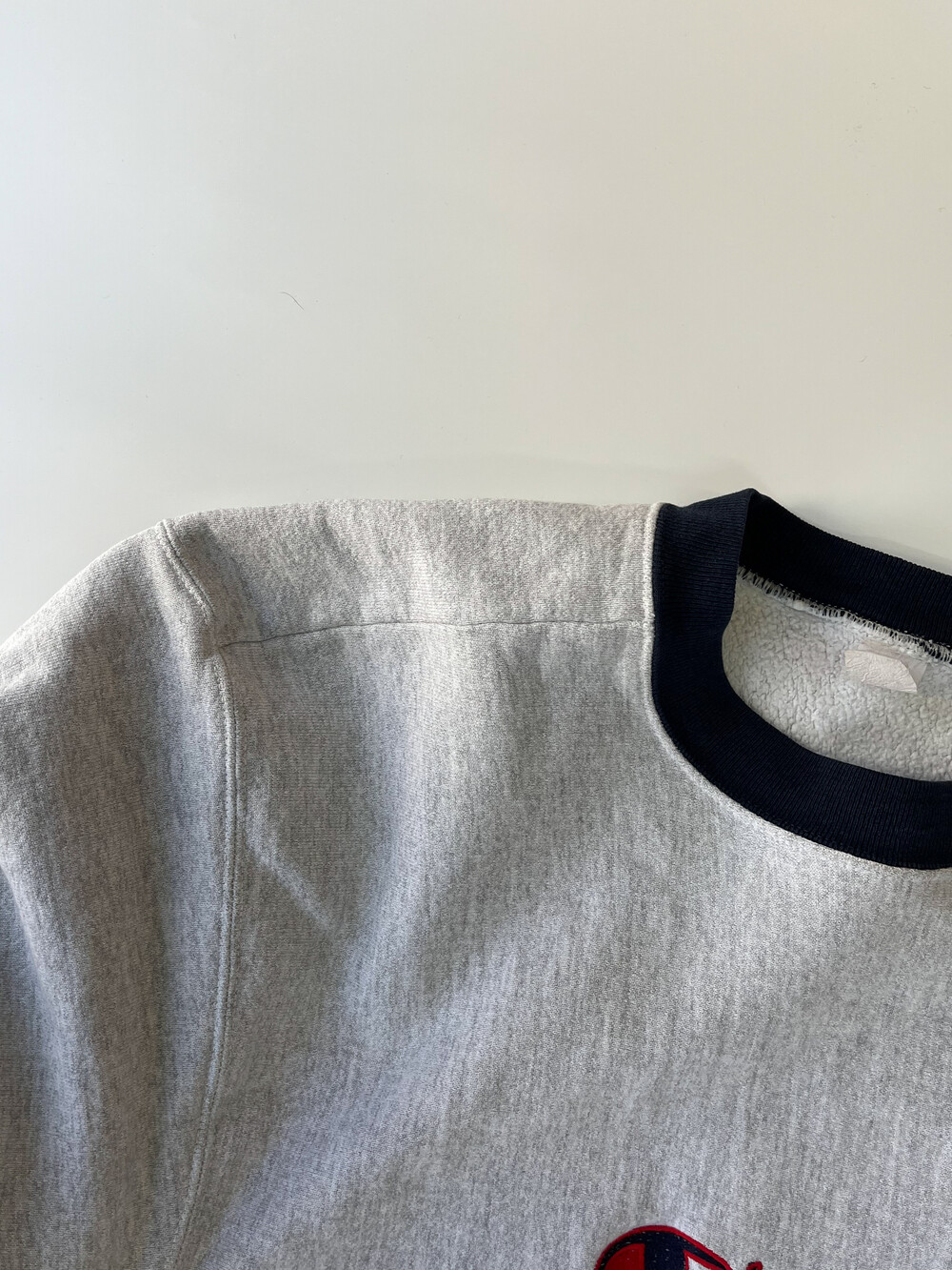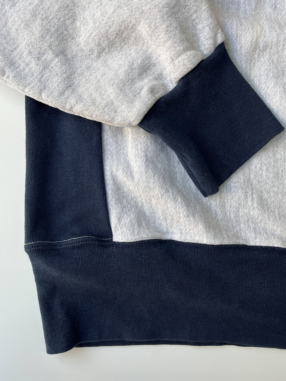 🚩Detail 여러모로 정체 불명의 스웻셔츠입니다. 얼핏 보면 원단 결이 가로방향을 향하면서도 사이드 패널이 붙는 전형적인 챔피온의 리버스위브 형태의 스웻셔츠인 듯하지만, 목 옆부분에서 어깨까지의 봉제선이 있으면서 소매 립 부분을 안쪽으로 오버로크 봉제로 마무리한 독특한 제품입니다. 코튼95% 폴리5%이라는 1980-90년대 챔피온의 튜블러 스웻셔츠에서 주로 보이는 낯선 혼용률과 동시에 미국 생산의 이 제품. 어쩌면 챔피온에서 새로운 시제품을 내놓기 위한 미발매 샘플 중 하나이지 않을까… 하고 조심스레 추정해봄직한 제품입니다.