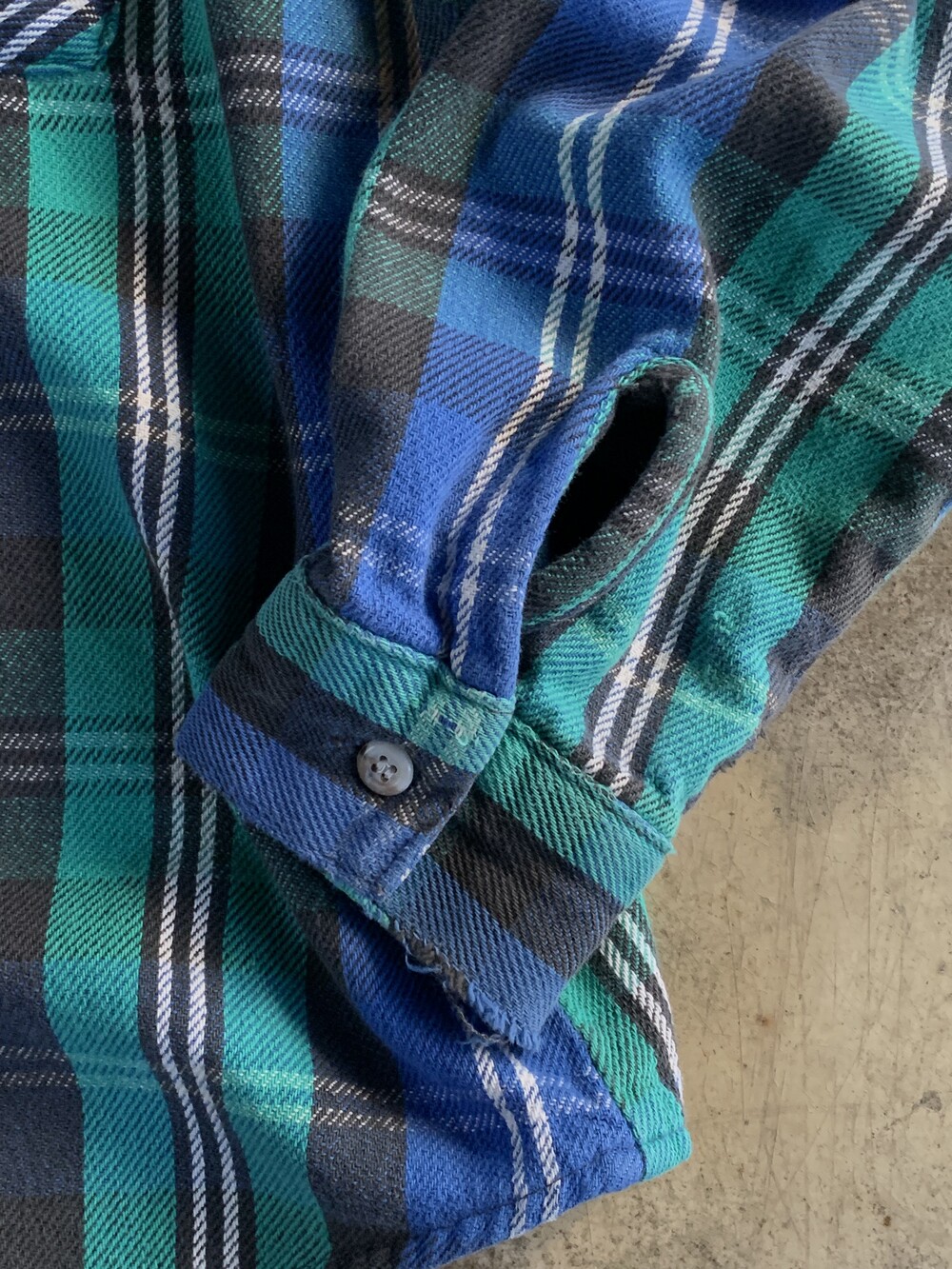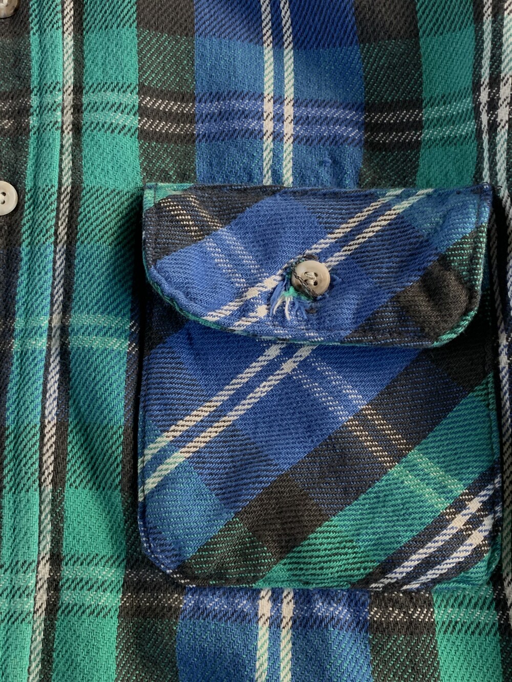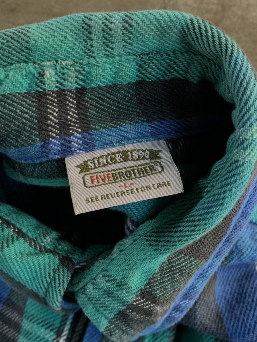 클래식 워크웨어 브랜드 파이브 브라더(FIVE BROTHER)를 상징하는 품목 중 하나인 플란넬 셔츠입니다. 두께감있는 코튼 트윌 원단에 블루&그린 배색의 캐주얼한 체크 패턴이 올려진 제품으로, 푸퍼 베스트나 마운틴 파카 등 워크웨어 아우터와도 곧잘 어울릴만한 제품입니다.